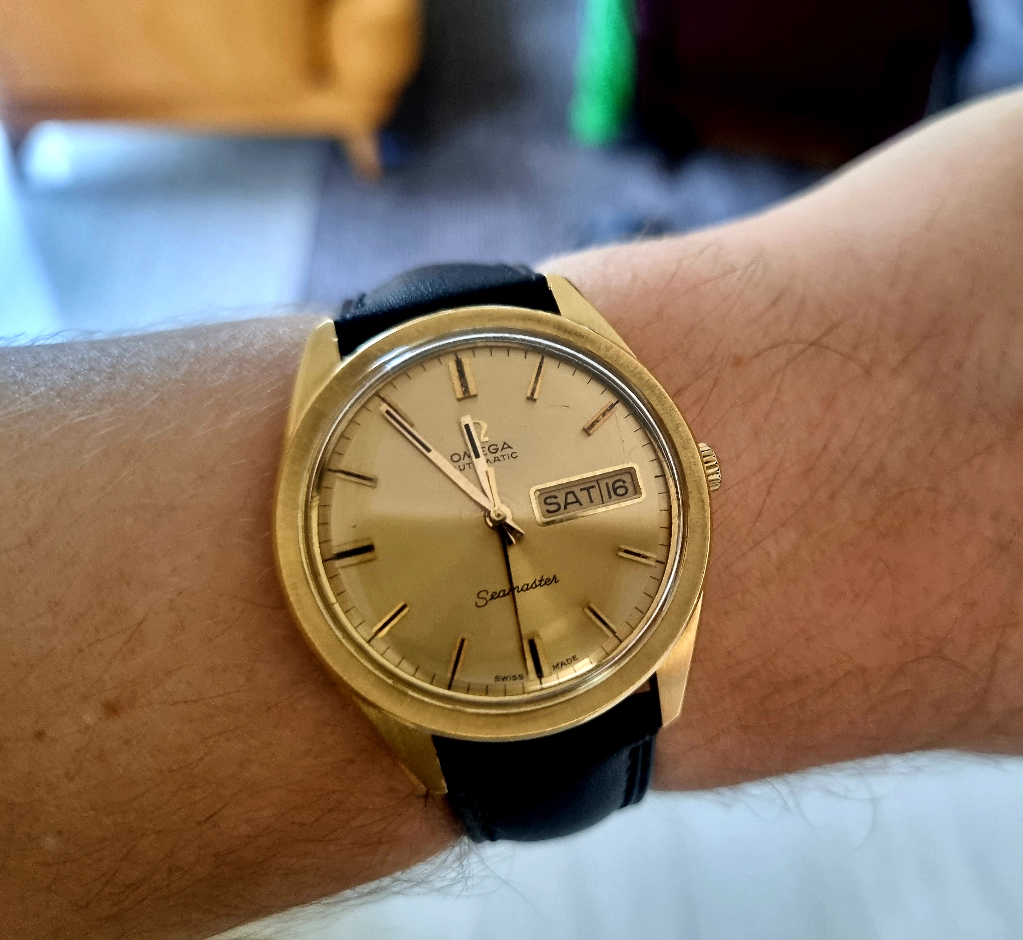 ·After about a year of searching and mulling over the decision, I finally got this 18k yellow gold 166.032 and am incredibly happy with it. The lugs are sharp, the brushed areas of the case look great, and I just love the warmth of the watch between the gold case and the acrylic crystal. The only thing I need to do is polish up the aforementioned crystal.