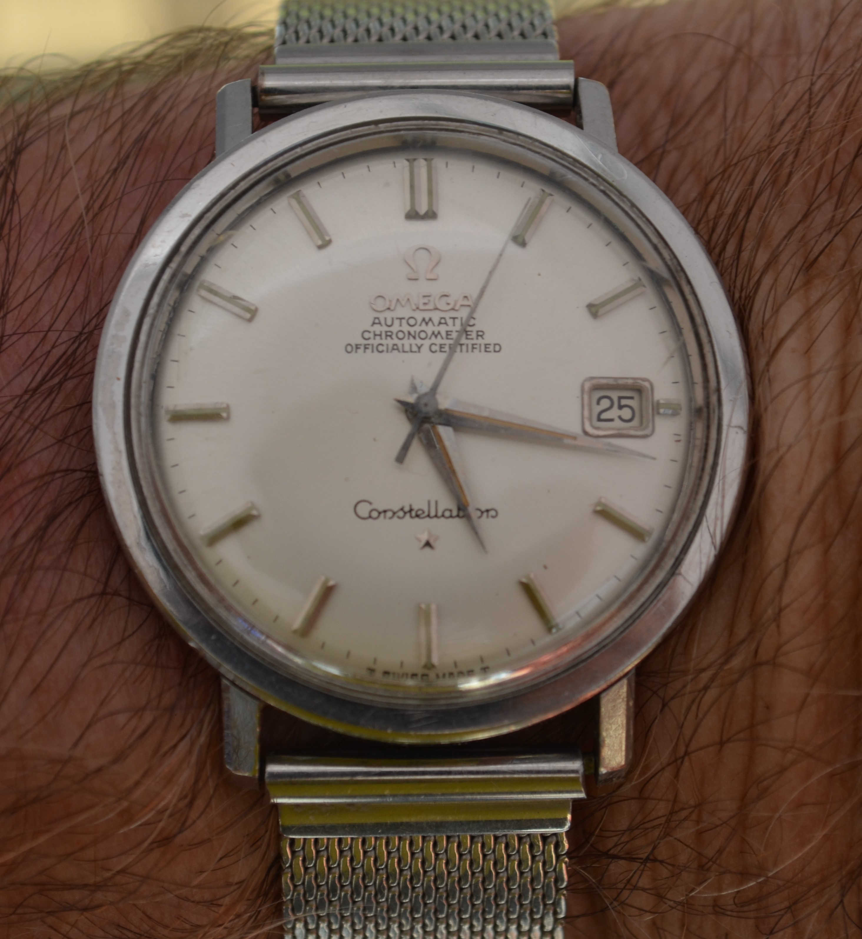 ·Picked this up a few weeks ago and haven't had a chance to take pictures until today. 1966 ish 168.004 hidden crown Constellation. This was on the Ebay recommendation thread. I was already watching it, and having it pop up on that thread made me feel more comfortable with it. Looks unpolished and has some nicks and scratches. Down side is the rotor has some play. Doesn't look like it has scratched anything yet but needs to be looked after. And definitely needs a service. What are thought on the strap? It is a Ros, not Omega. It doesn't have the expanding endlink like the Twistoflex. I might rather put a leather strap on it anyway.