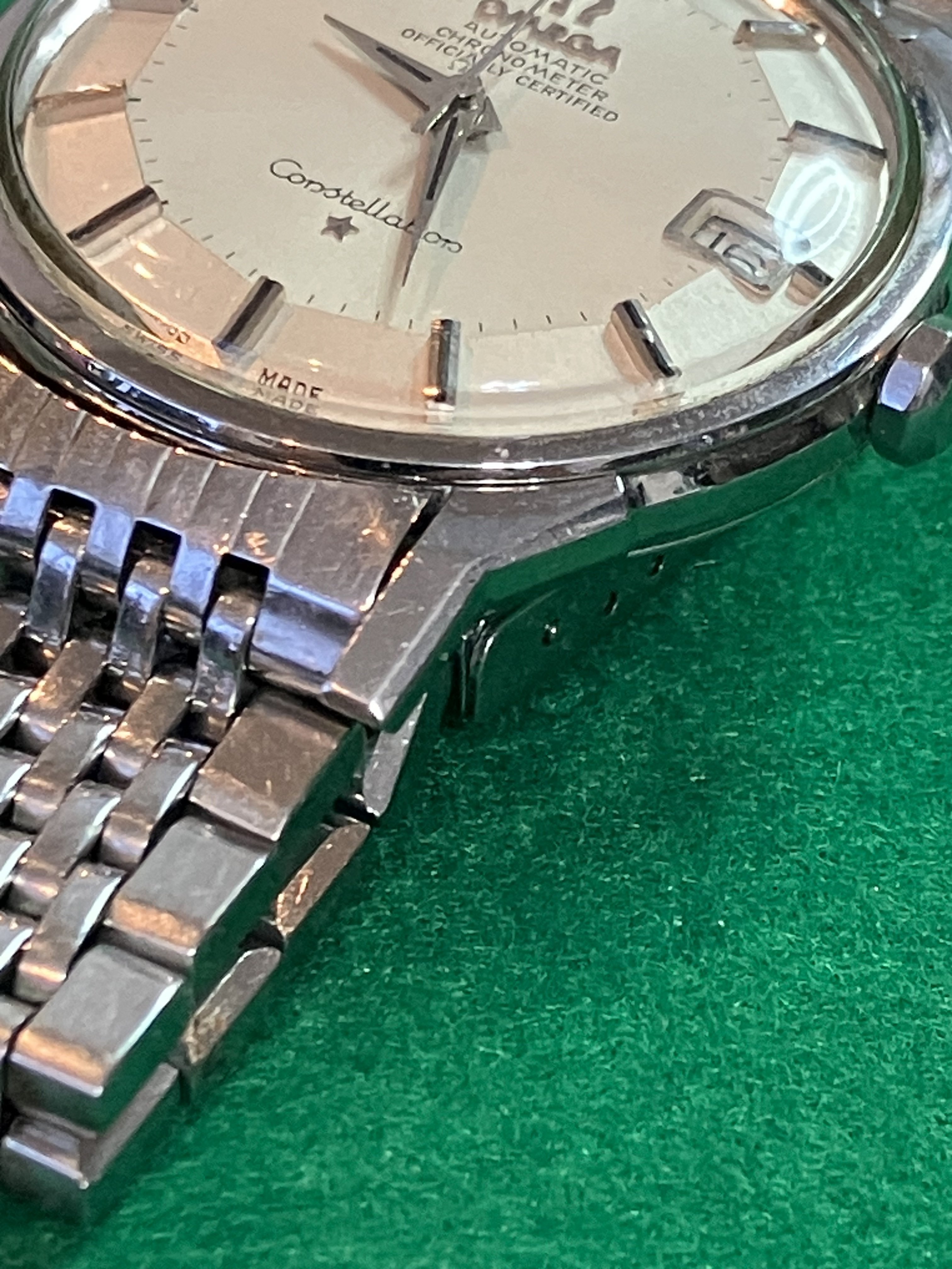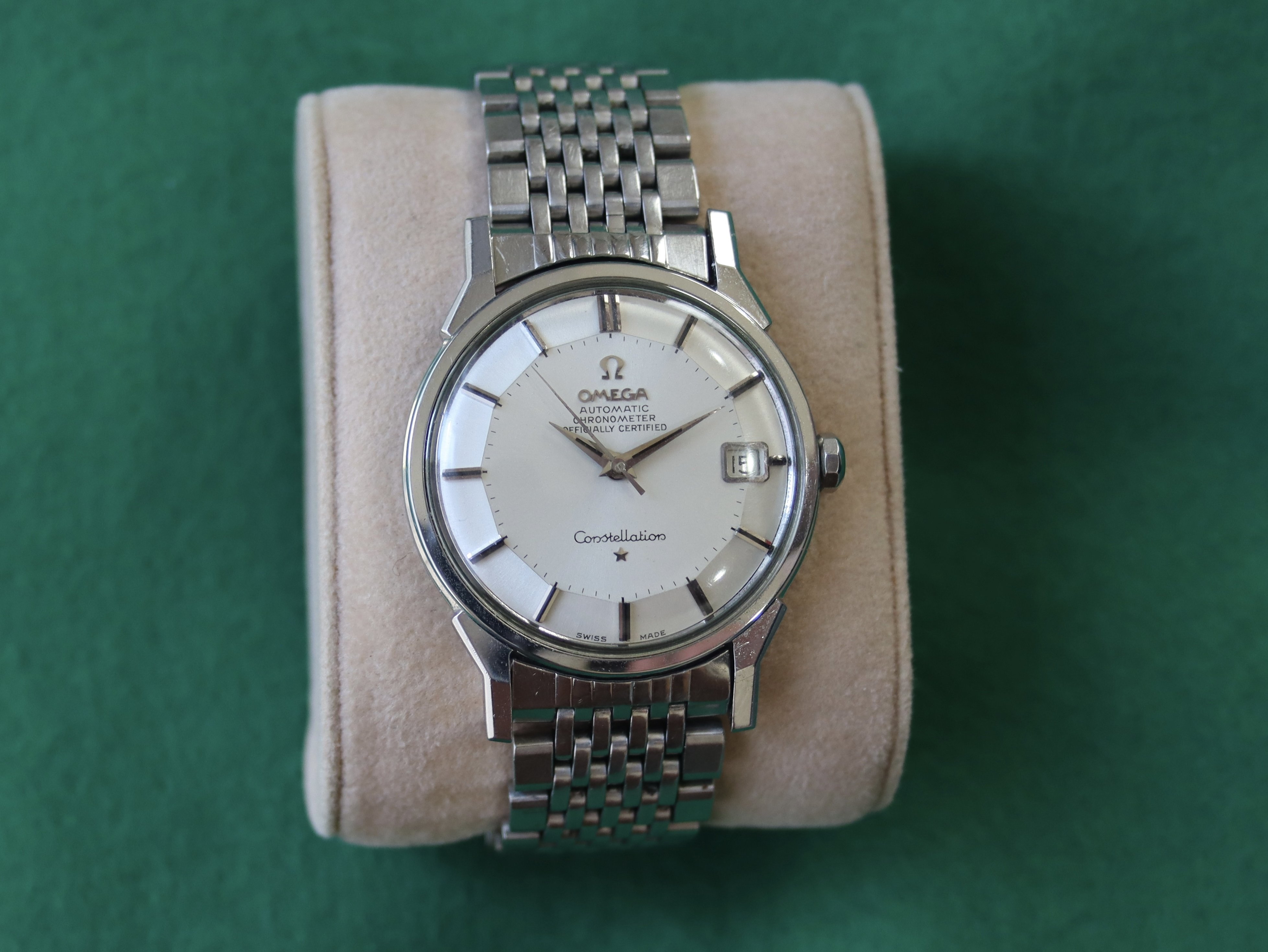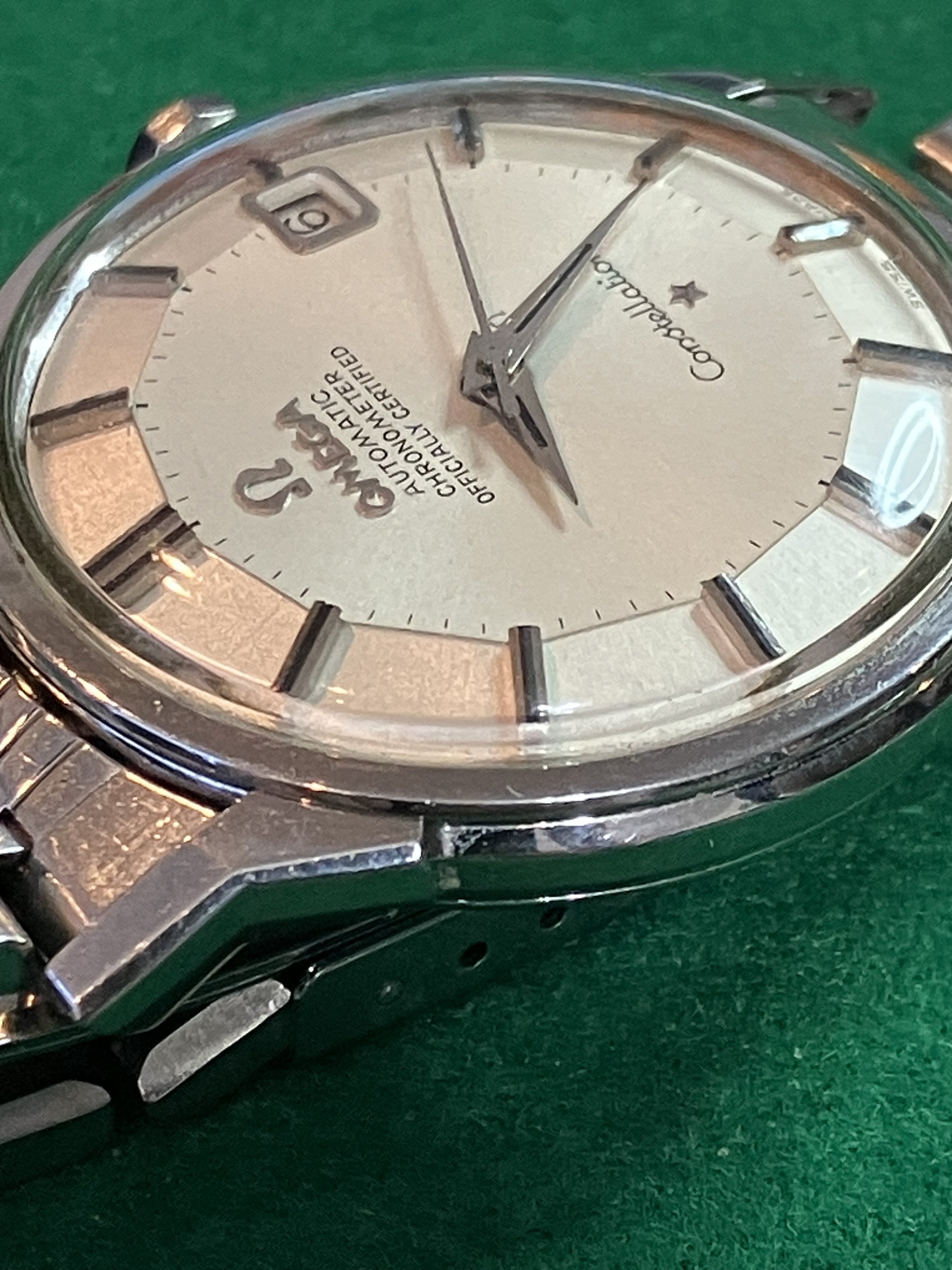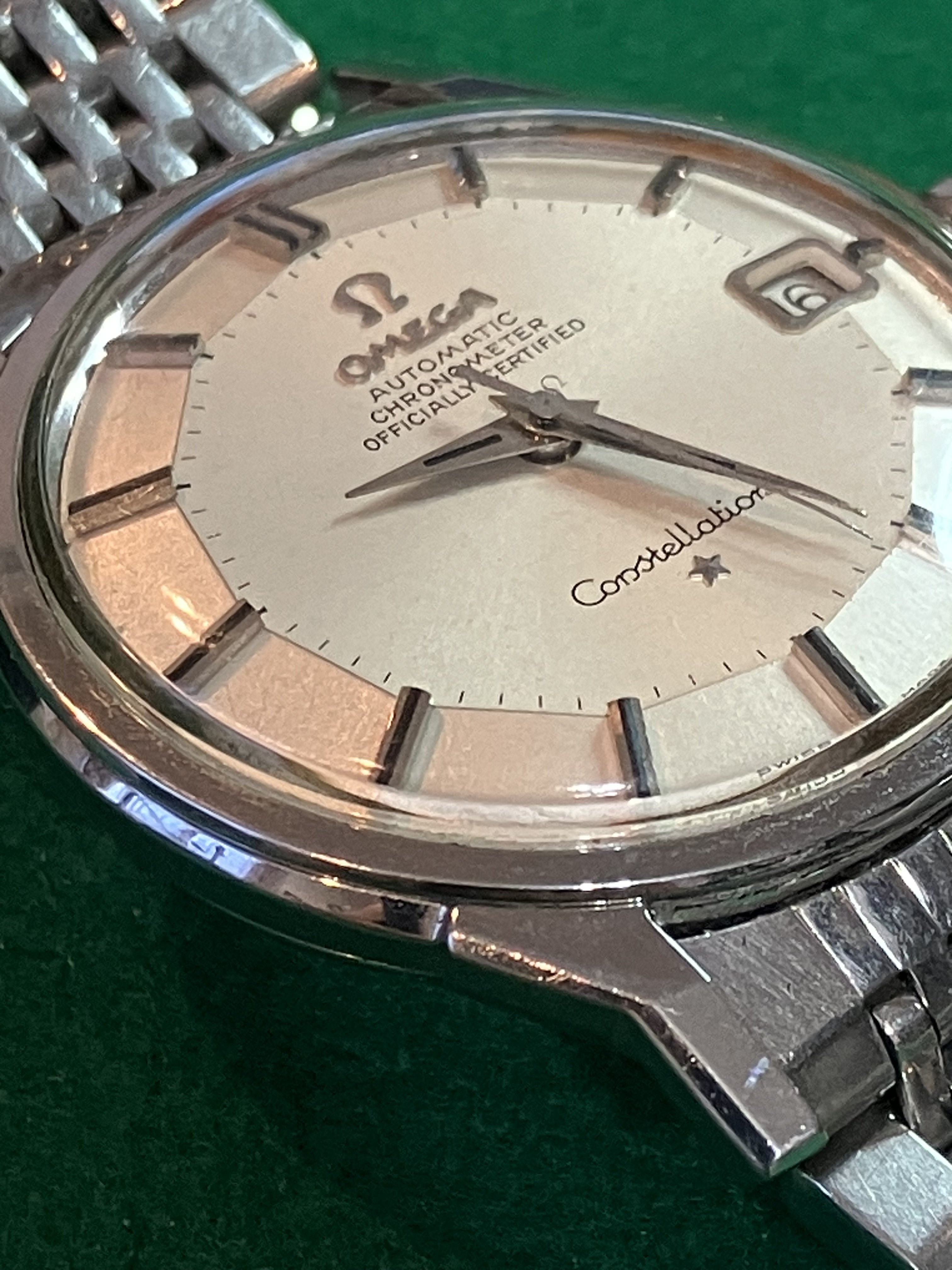 For sale is my 168.005 12-facet (“pie-pan”) Constellation from 1964 with a 1502 BoR bracelet, serviced in September 2019, for US$1890. As the photos attest, the watch looks great on the wrist, with a clean dial under a crystal with some nicks on it. Everything seems to be original with the watch. The quick-set date function works perfectly, happily, since the lovely octagonal crown is not the easiest thing to wind.