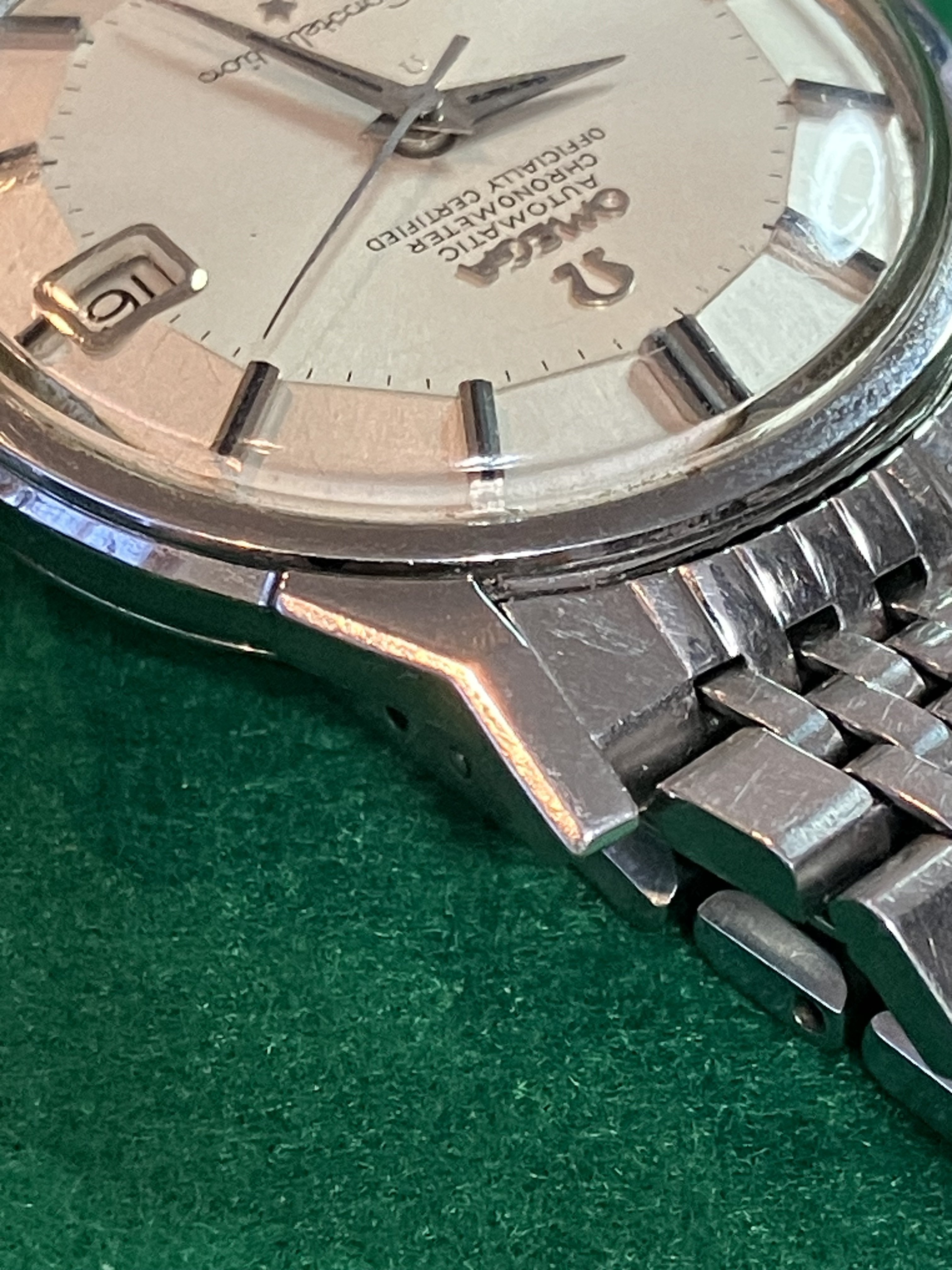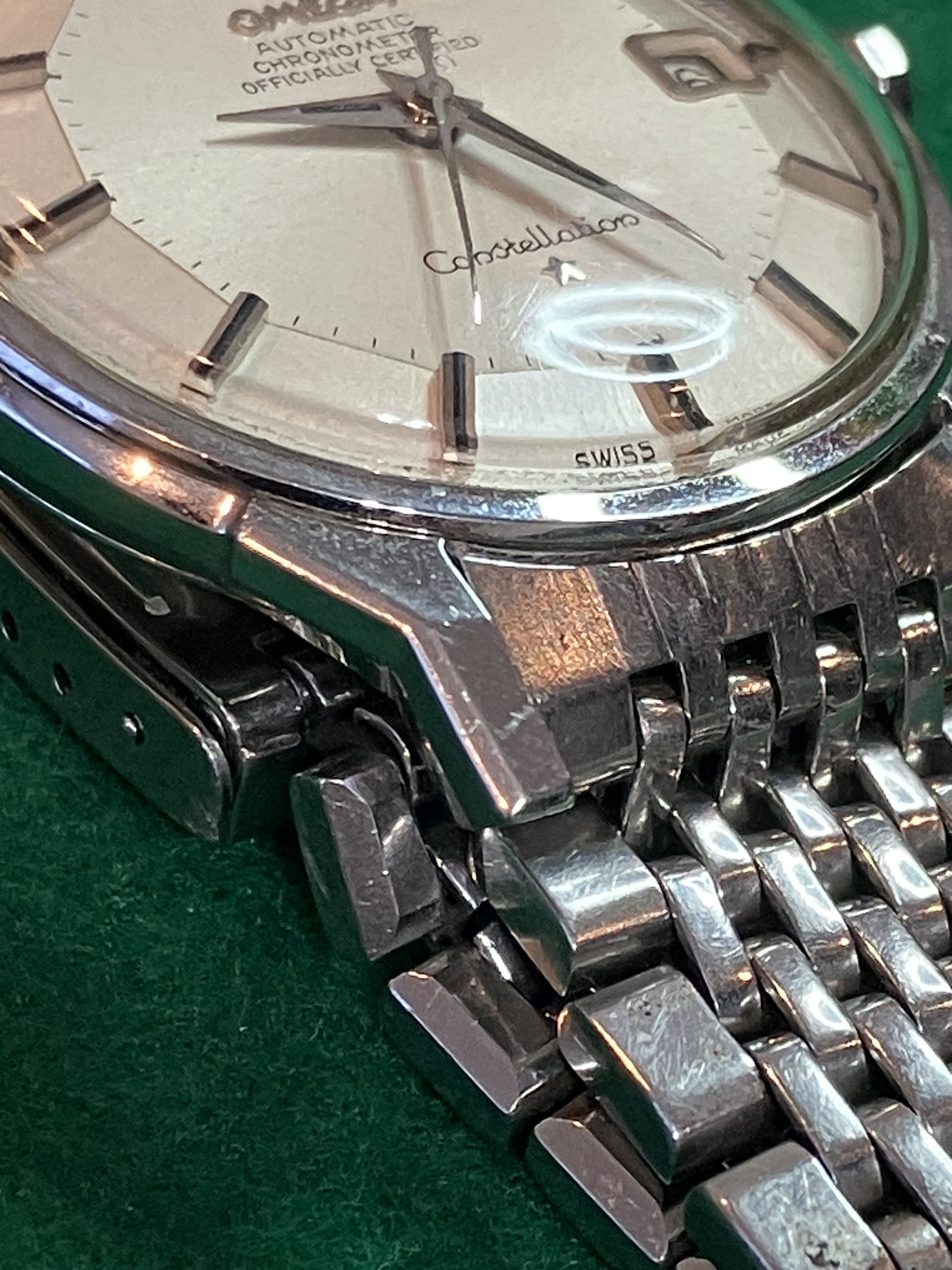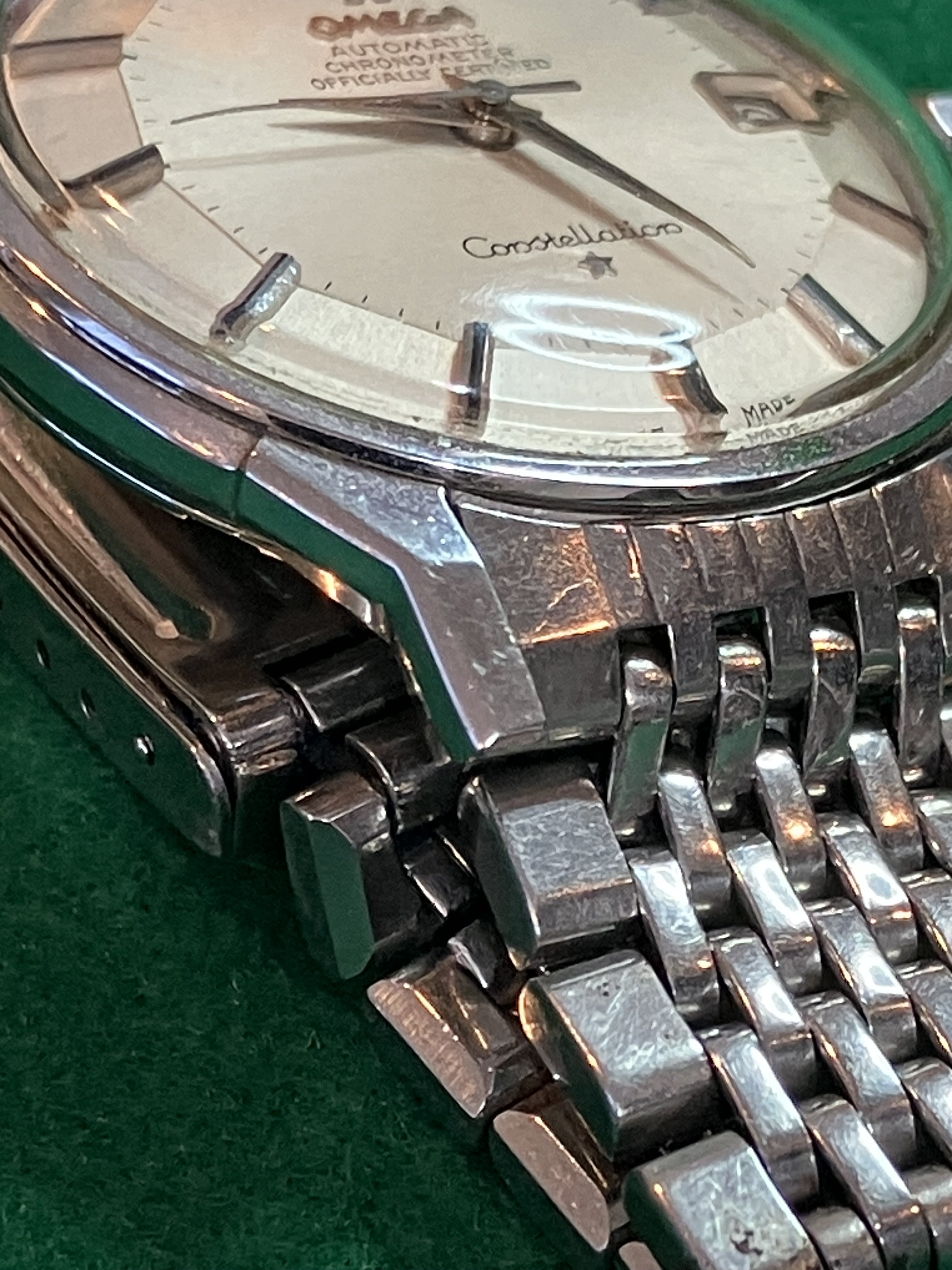 For sale is my 168.005 12-facet (“pie-pan”) Constellation from 1964 with a 1502 BoR bracelet, serviced in September 2019, for US$1890. As the photos attest, the watch looks great on the wrist, with a clean dial under a crystal with some nicks on it. Everything seems to be original with the watch. The quick-set date function works perfectly, happily, since the lovely octagonal crown is not the easiest thing to wind.