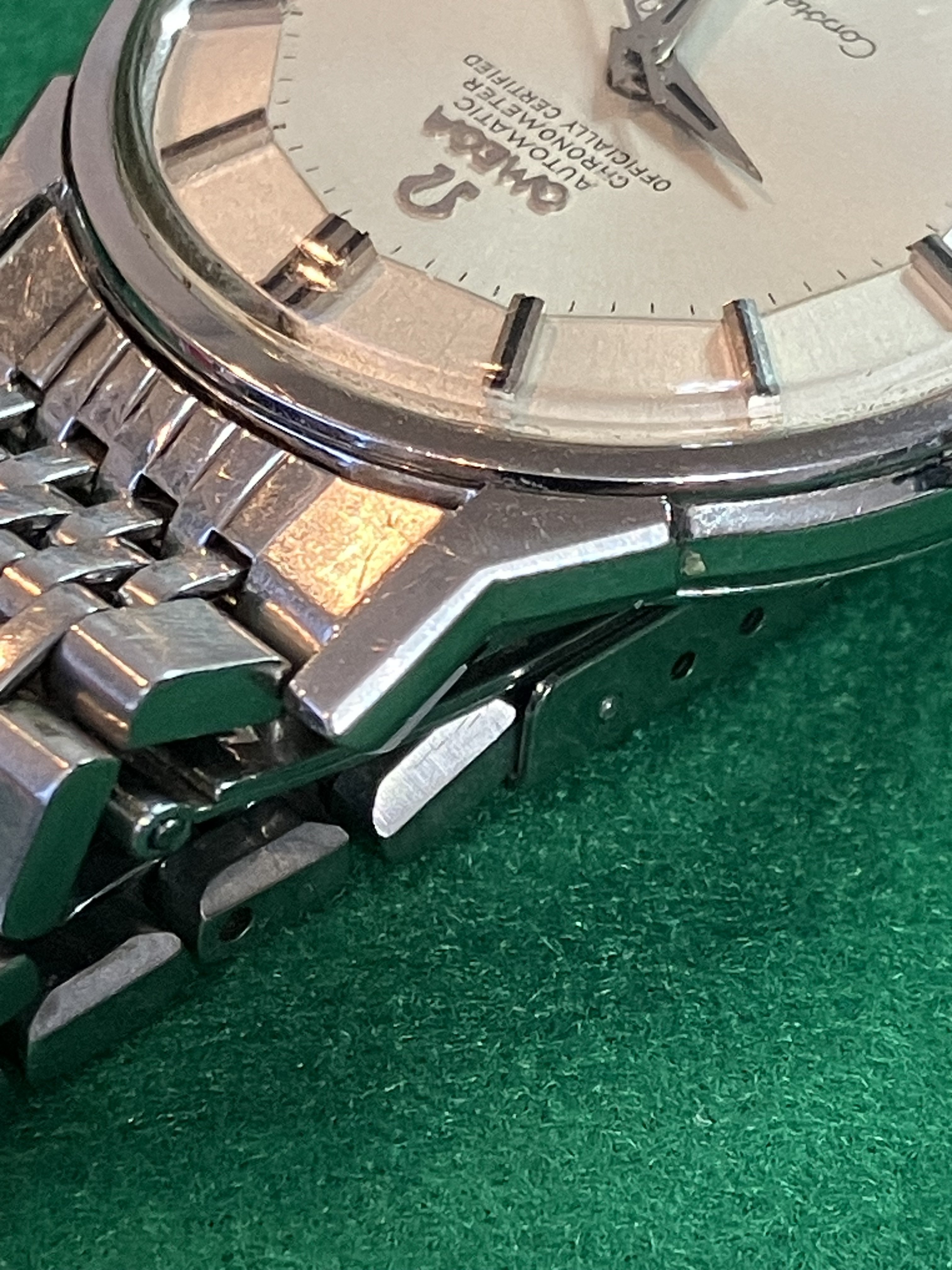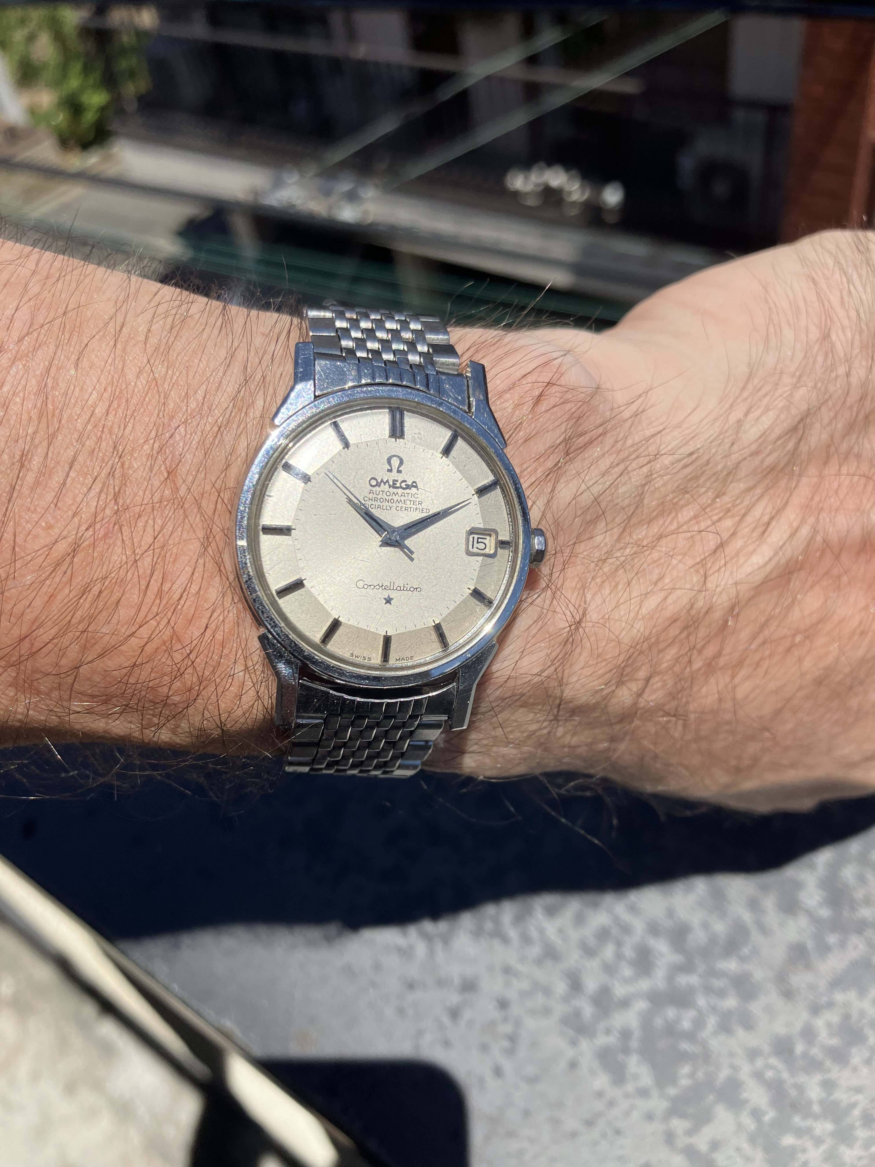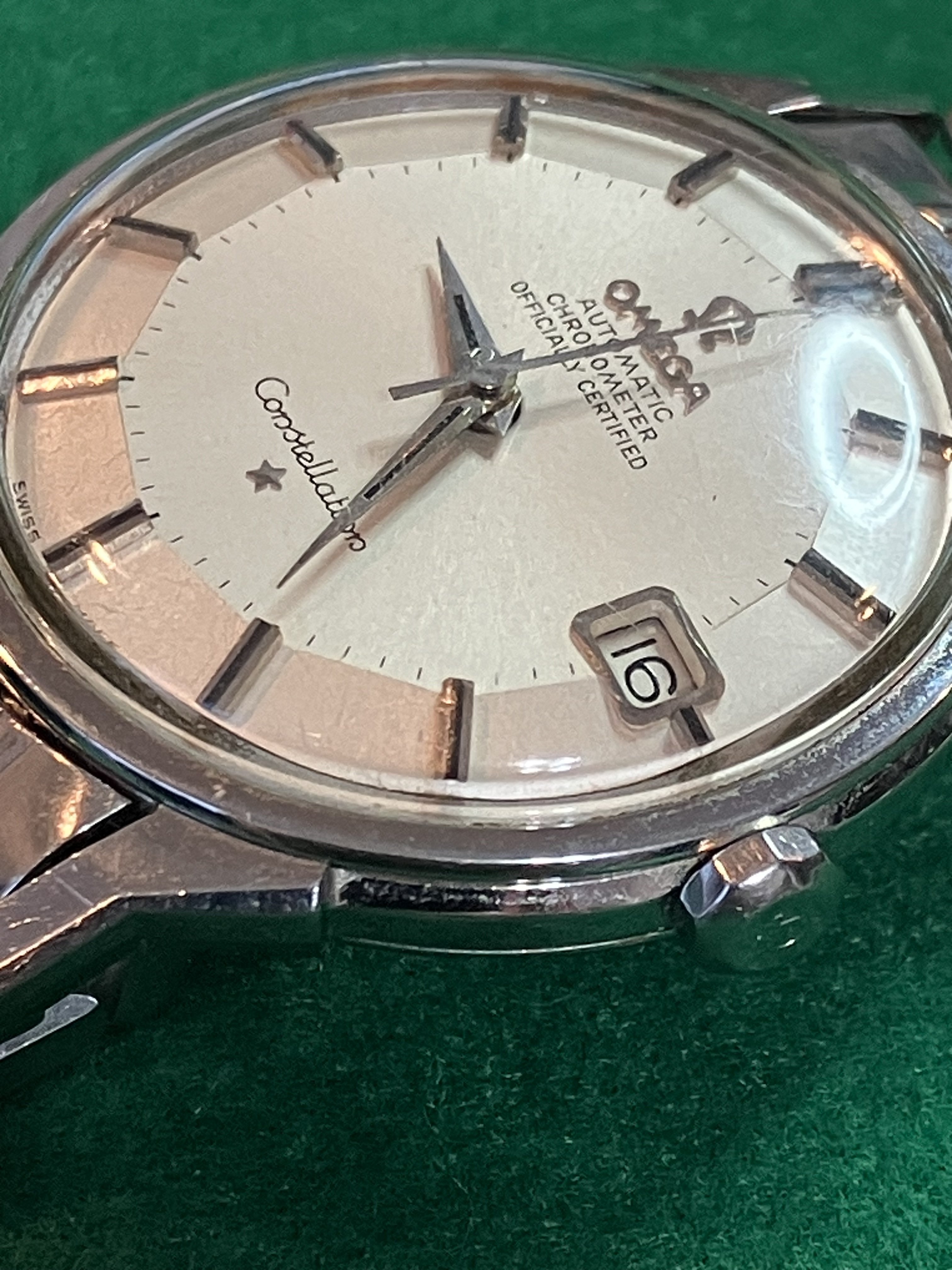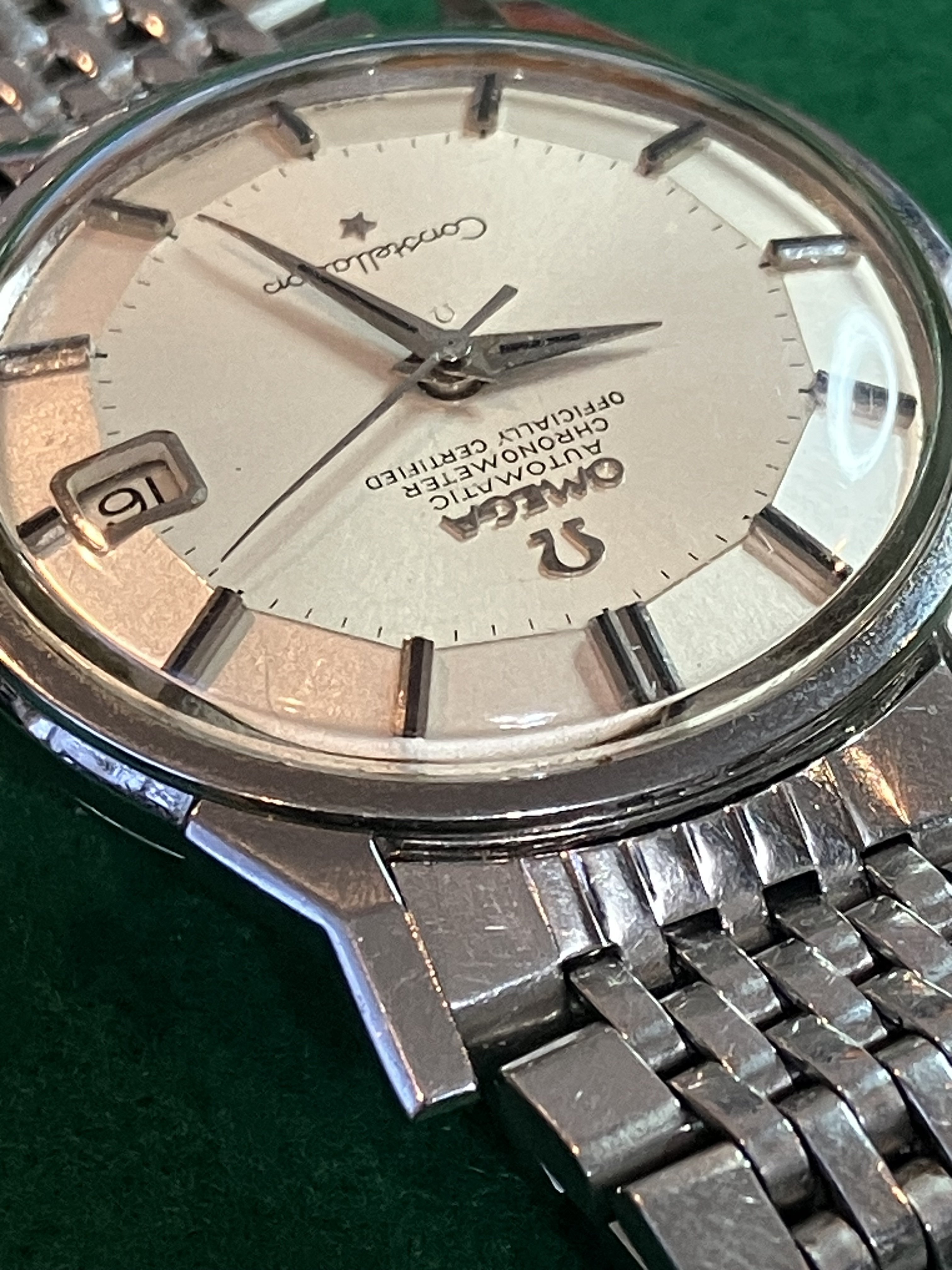 For sale is my 168.005 12-facet (“pie-pan”) Constellation from 1964 with a 1502 BoR bracelet, serviced in September 2019, for US$1890. As the photos attest, the watch looks great on the wrist, with a clean dial under a crystal with some nicks on it. Everything seems to be original with the watch. The quick-set date function works perfectly, happily, since the lovely octagonal crown is not the easiest thing to wind.