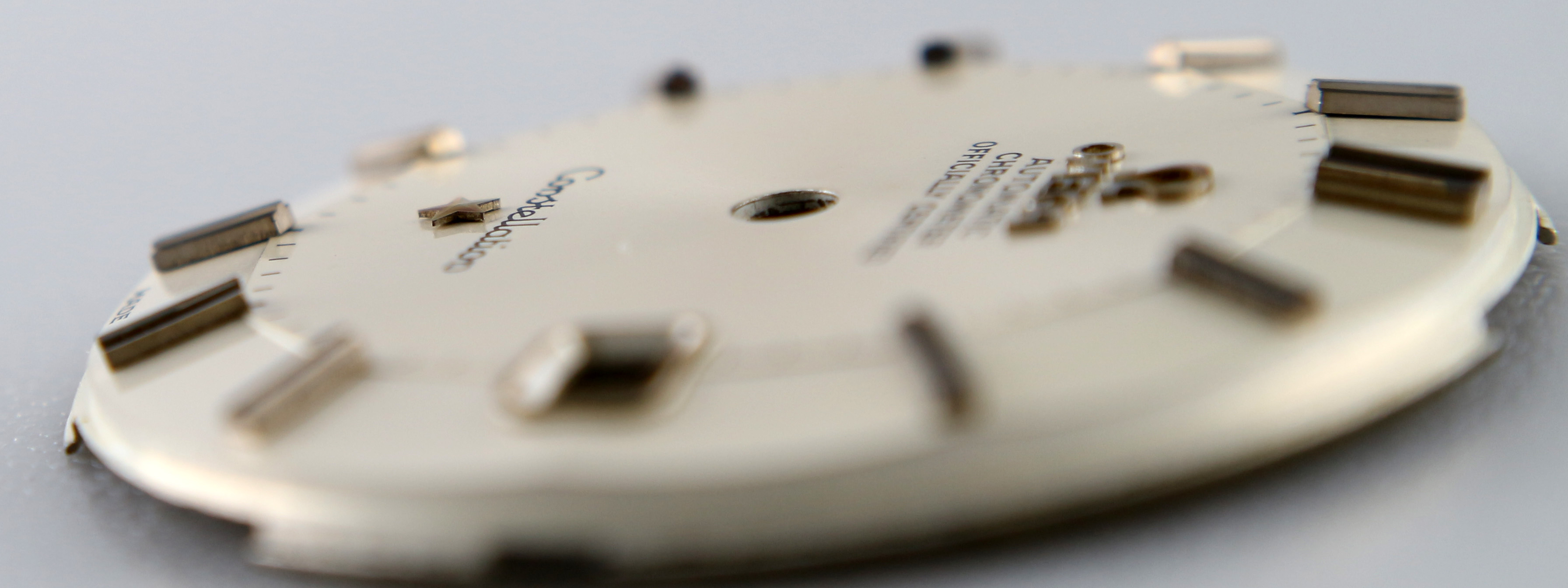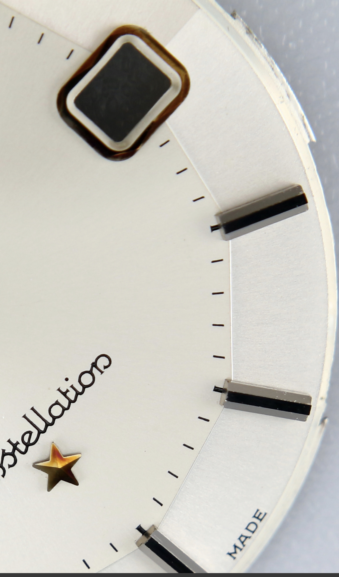 Markers, logo, star, date window are made from solid white gold. That "blueish" color is because of natural oxidation, I can clean them to bright white gold but decided to keep their color of time.