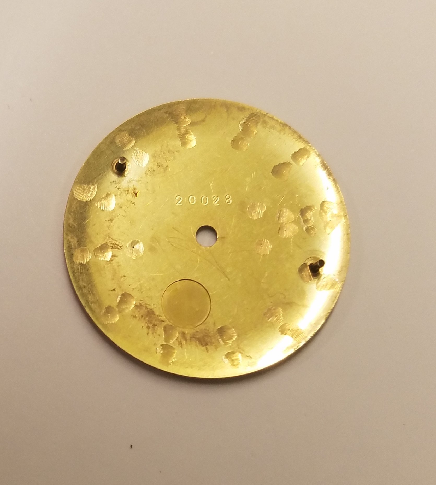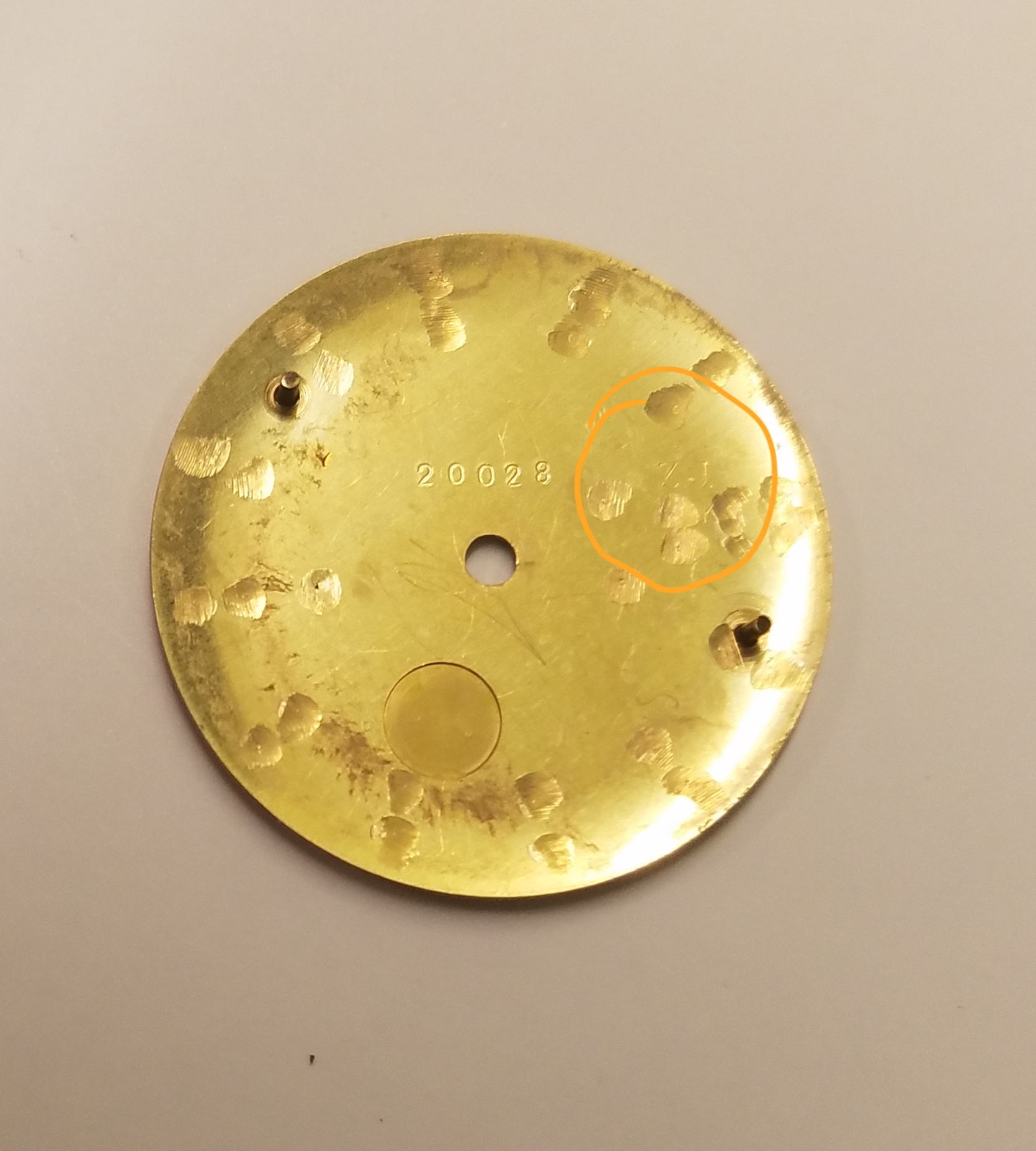 The gold mark is partially rubbed when legs of the indices and logo were grinded off from the bottom of the dial. But you can still find the 18K markings as circled below.