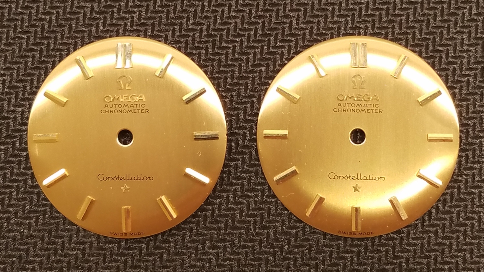 In respect of quality control deficiency, I have another example of mine. I bought 2 pieces (identical one) of 18k Constellation dials from local Omega agent, Omtis Ltd. in Hong Kong back to around 20 years ago. It was the time when Omega began to terminate local agents all over the world. These 2 dials were supposed to be service dials which are NOS of 1960s. They are for model 14381 cal 551.