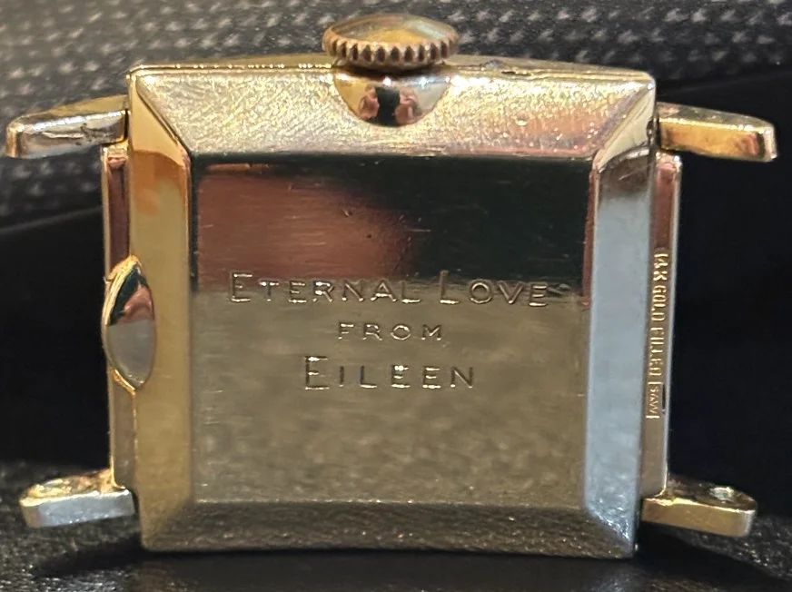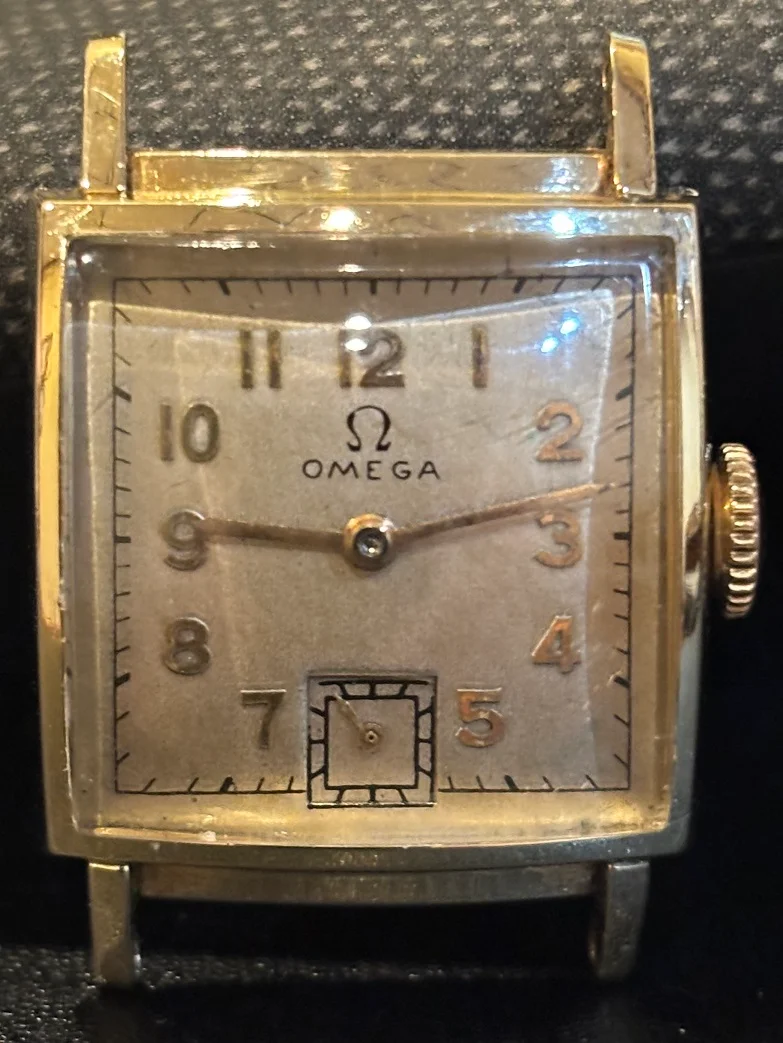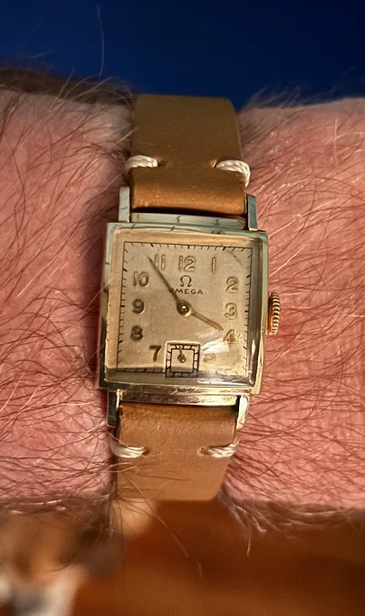·My local jeweler almost daily takes in gold and jewelry that families want to turn into cash, particularly with the current price of gold. Here and there watches come in as well. One batch had a small, square Omega in a gold filled pressfit case. It wasn't much to look at, lots of green on the edges and looks to be an old repaint on the dial, but it wound, set and ticked. Jeweler gave it to me as a freebie and I sent it up to my watchmaker. It's returned from service with a new mainspring and is keeping solid time. I have some 16mm straps coming in for it. With the inscription, it meant a lot to somebody back in the day, serial number in low 9m dates to circa 1939 so maybe a war years gift. It's my first pre-war Omega wristwatch and I look forward to wearing it.