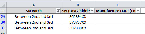 Batch 1 includes serials 3507XXX. Here shown with dates from EoA when available: