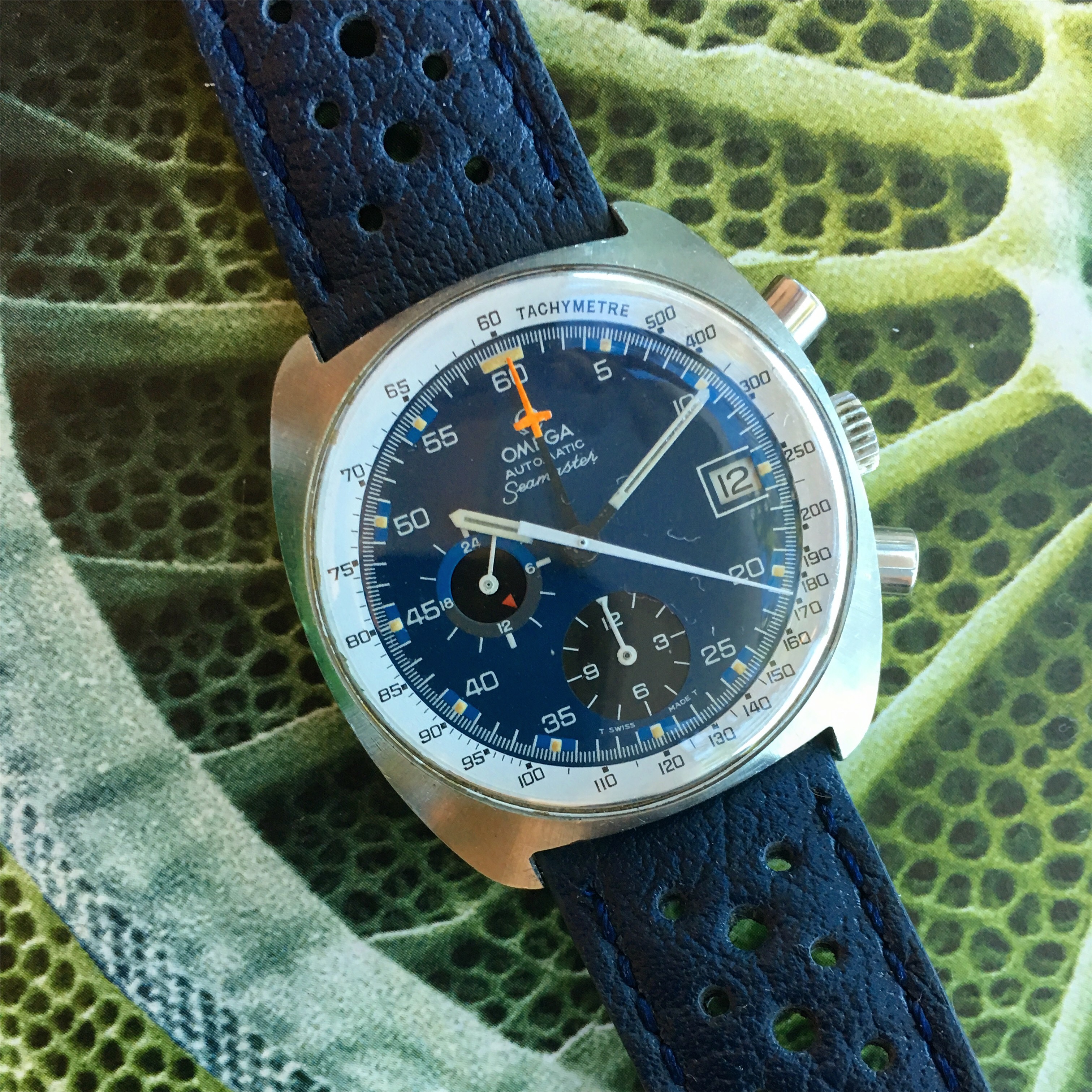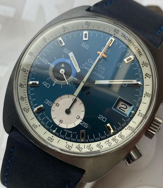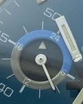 here is a picture with the correct hands. As far as the sub dial I have seen versions with either a gray or red triangle. Note that are a few versions of the blue dials. Ones with raised coffin markers like the one in your picture and ones with flat markers like mine. Hope this helps.