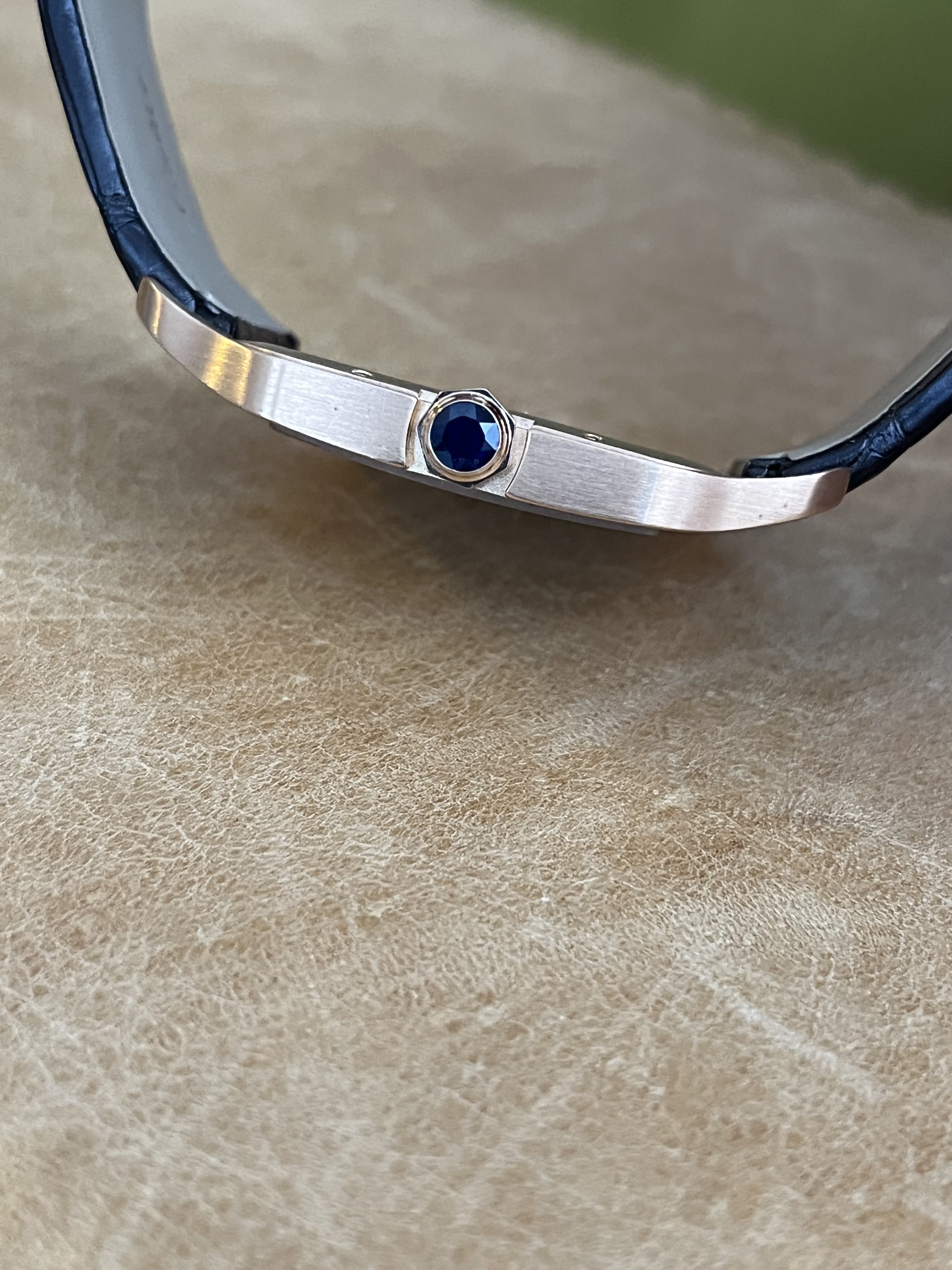 faceted sapphire crown. Scratch resistant sapphire crystal. Silver dial. Painted black roman numerals. Sword shaped oxidized steel hands. Secret Cartier signature at VII. Black alligator strap with the 18K rose gold deployant buckle. Received full service at Cartier last year and was worn once since then. Genuine Cartier Alligator strap in like new condition (worn once for 2 hours). Sold as watch only with Cartier service receipt.