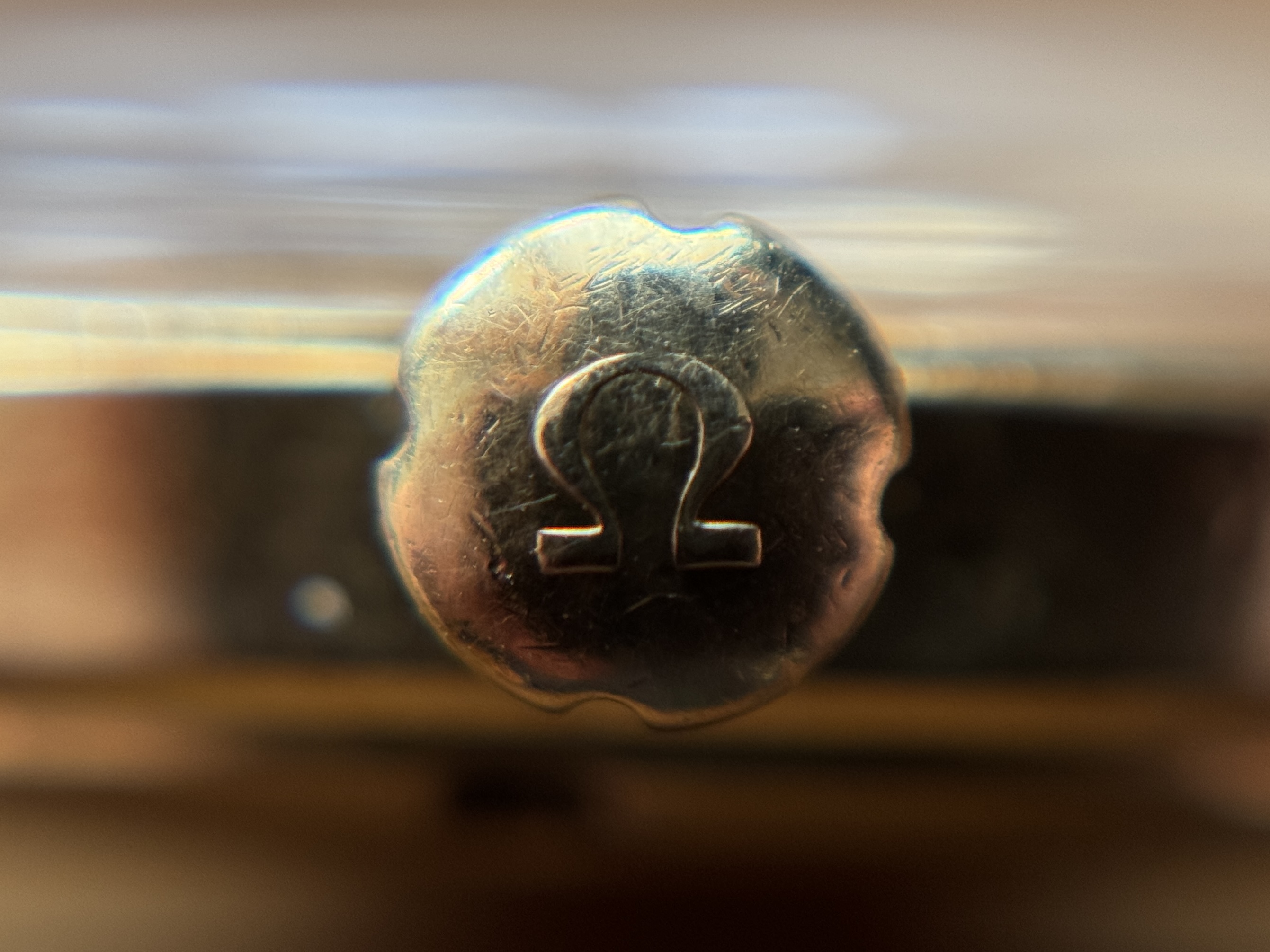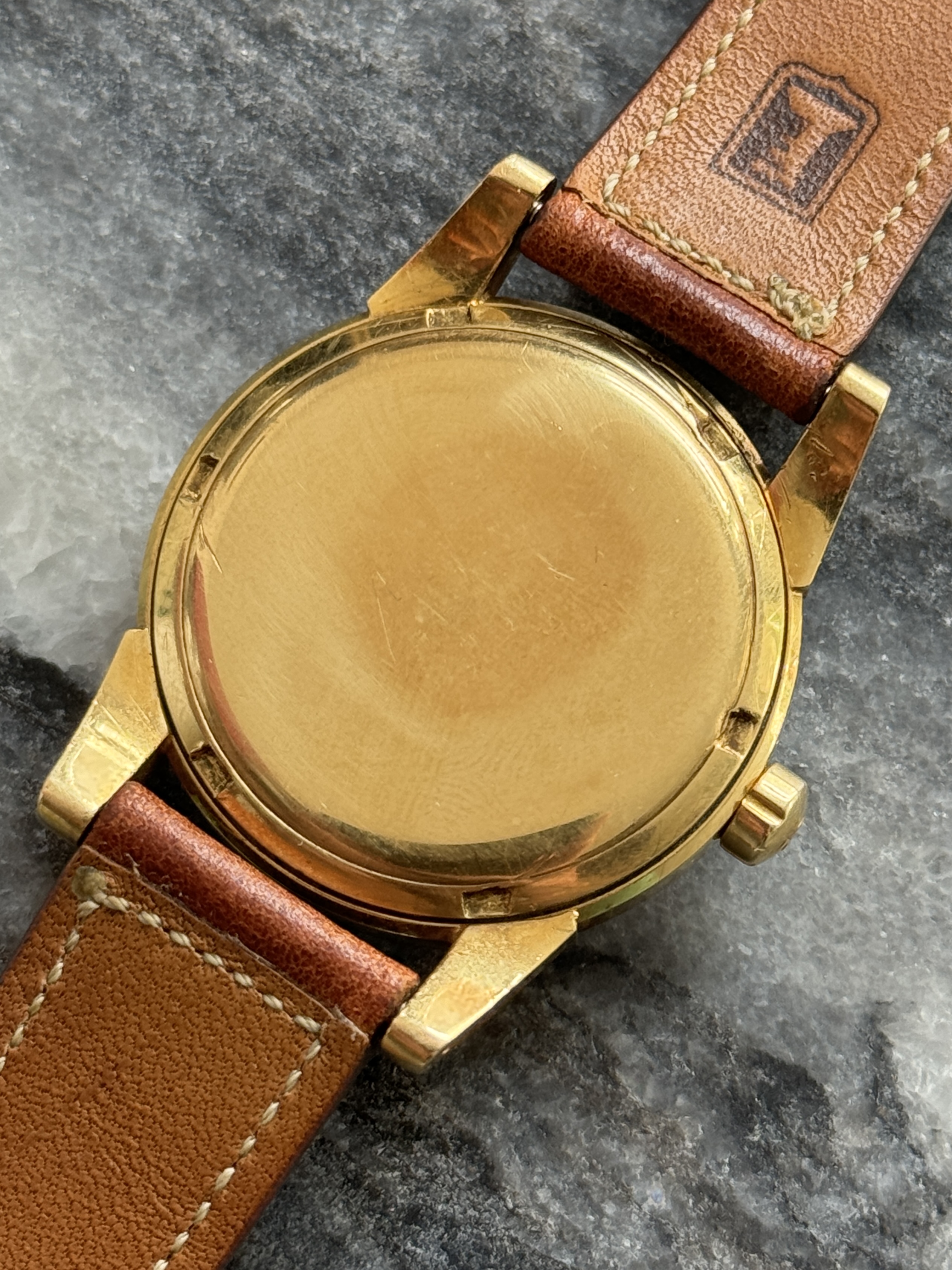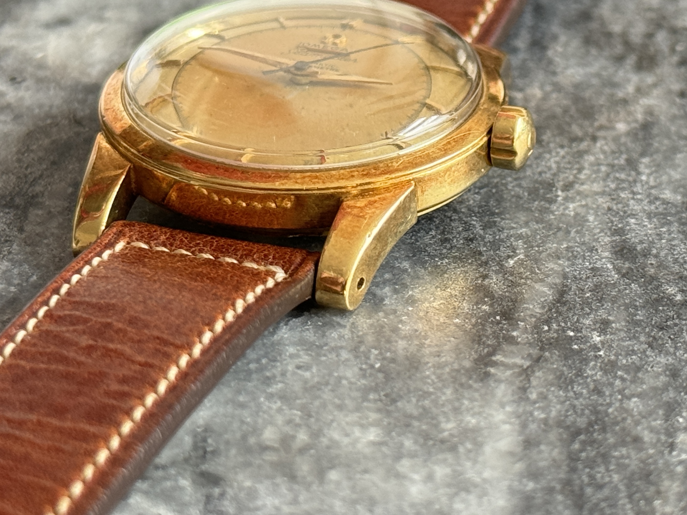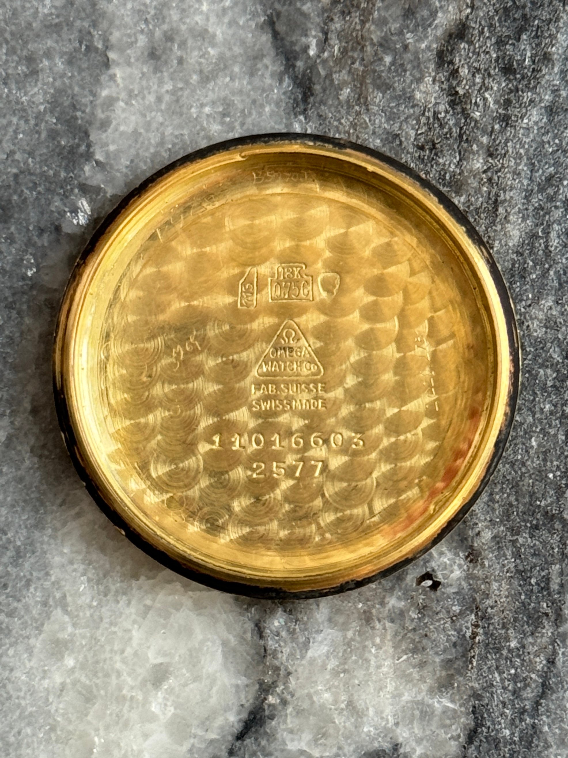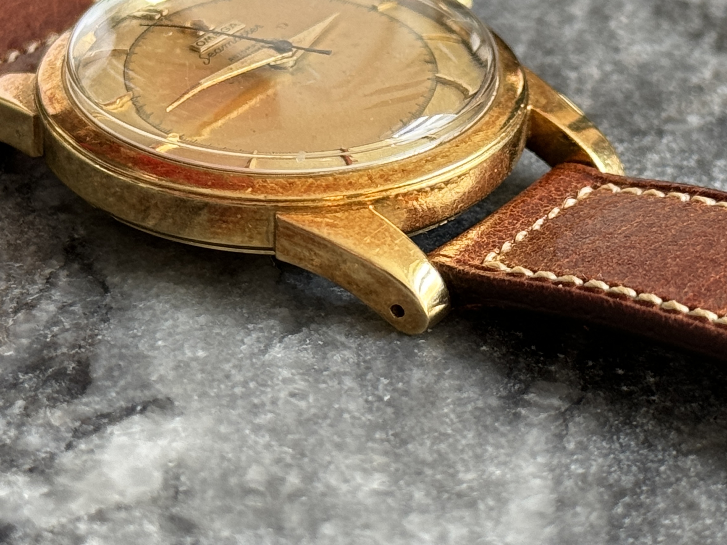 Case: Original 34.5mm „beefy lug“ case in 18k solid gold. Correct case style fort he serial range, those solid gold cases were sort of in between the 2 variants of SS cases in terms of lug thickness. Do note they did not have bevels, so there is nothing missing here. The case is pretty sharp, even the small edge on the bezel is still there. Small scratches and dings everywhere, as you’d expect after >70 years. Some „idiot marks“ from failed opening attempts on the case back. Do note that this is the correct case back style for this case and serial, and it never came with the "SEAMASTER" and "WATERPROOF" inscriptions that later 2577s saw. Correct hallmarks at the side of the case and the back of a lug.