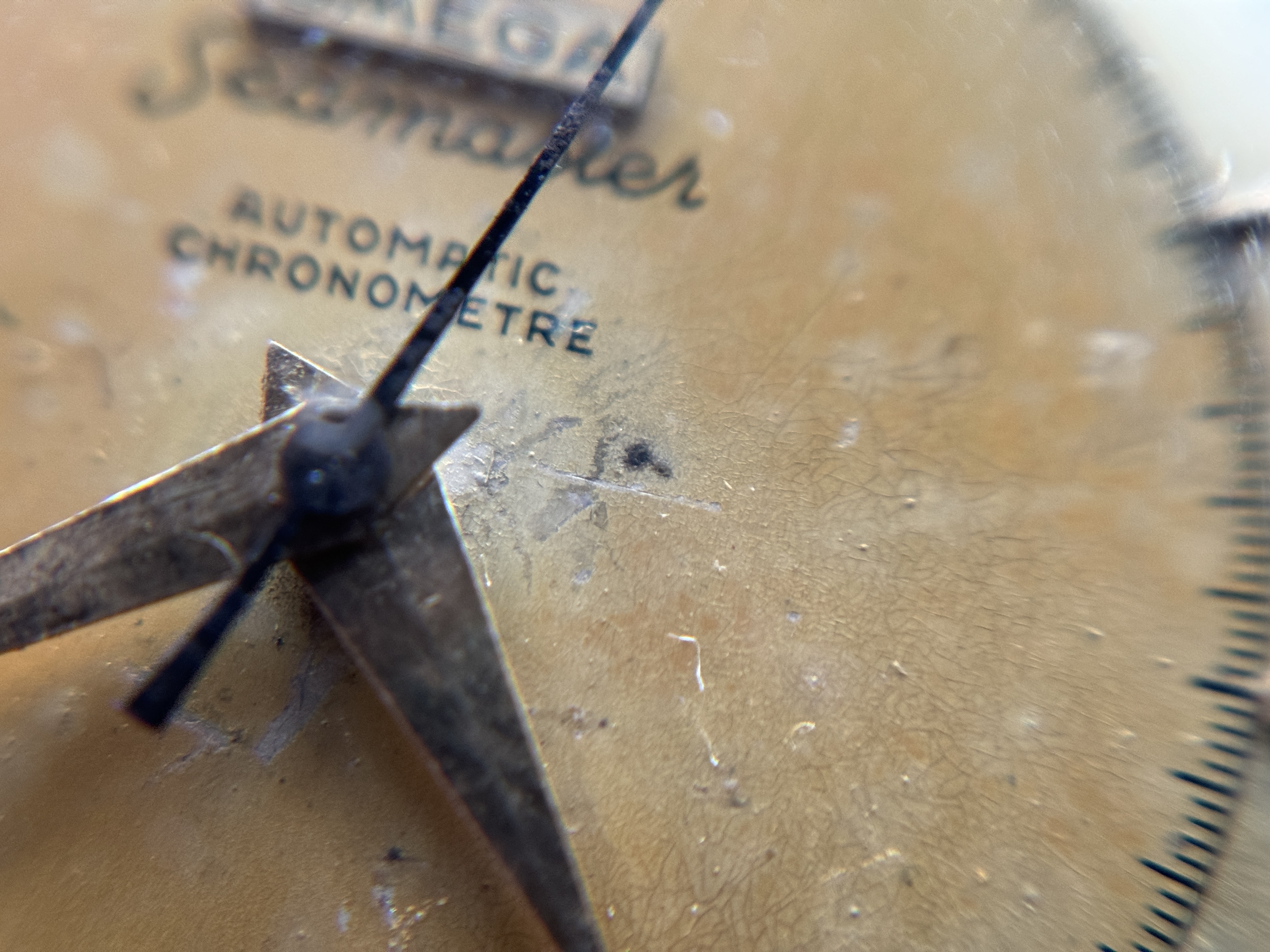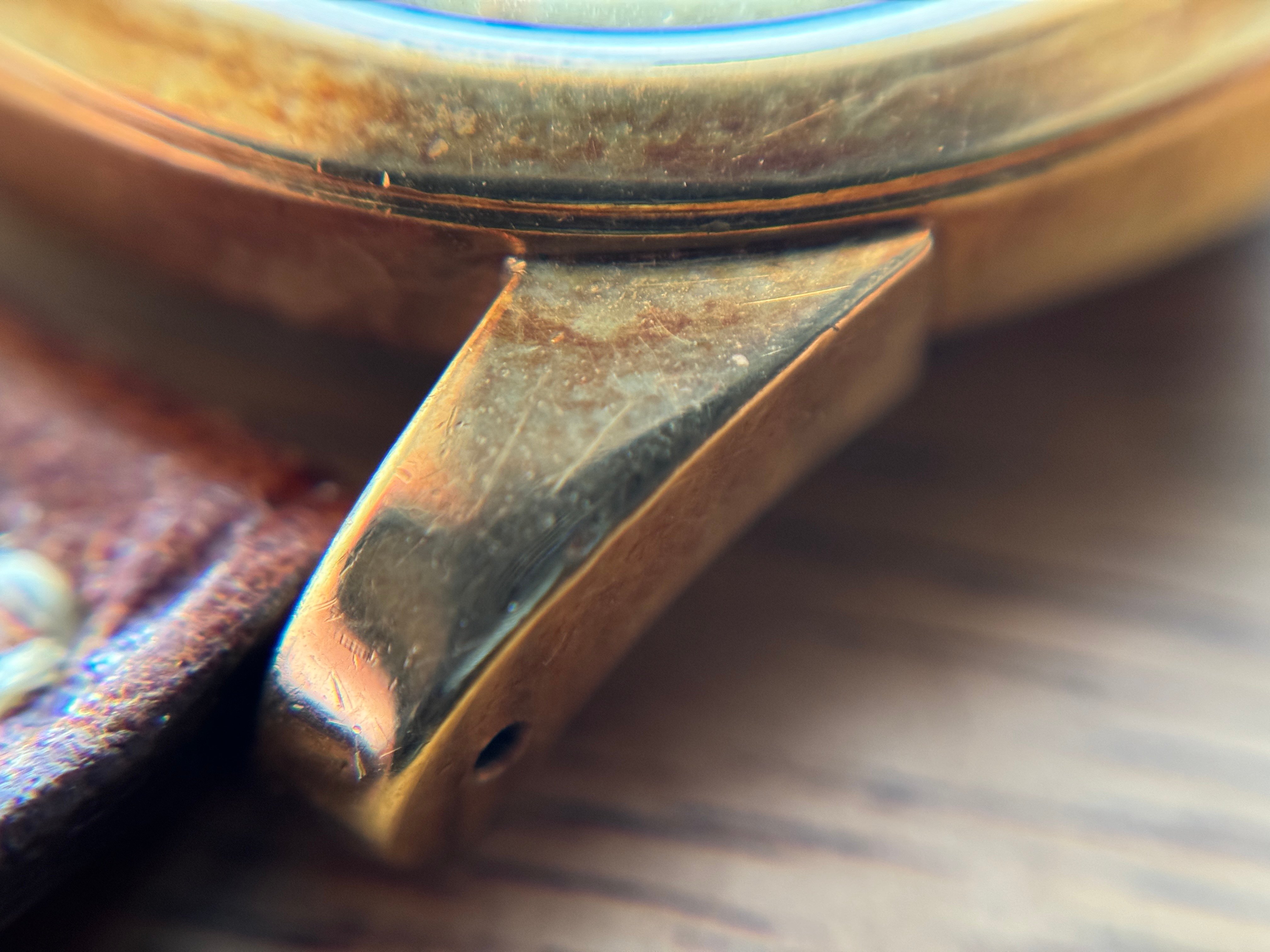 Dial & Hands: Well. It’s not mint, is it 😁 Still: Fully original, very uncommon „plank“ dial that’s simply a cool thing to behold. Two-tone finish, which, just like the writing, is fully preserved. The inner circle has aged to a deep, deep yellow. There are marks and discoloration everywhere, as you can see, most notably around the outter edge near the tension ring and in the very center, sometimes covered by the hands. I’ll include 50x close-ups further down. The text, all on the top half of the dial with the French „chronometre“ spelling is unusual, but fully correct for the serial. The hands are in good shape, the blued second hand is a beautiful bonus.