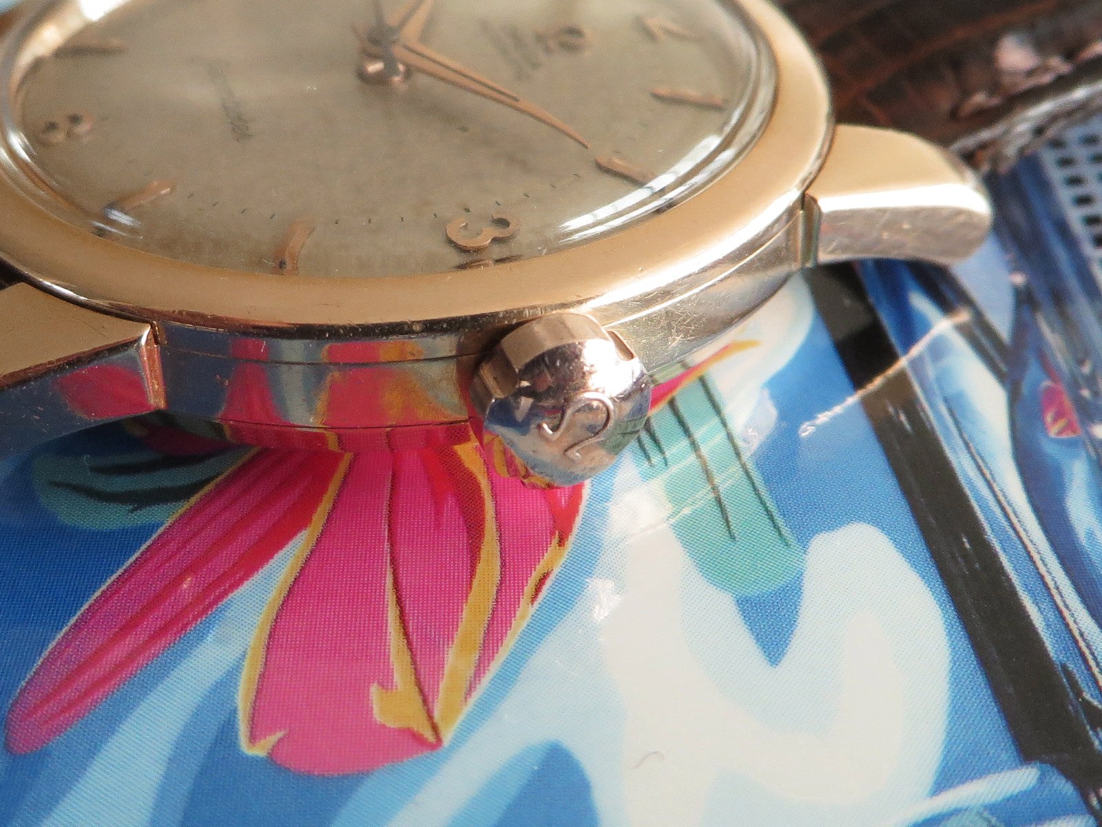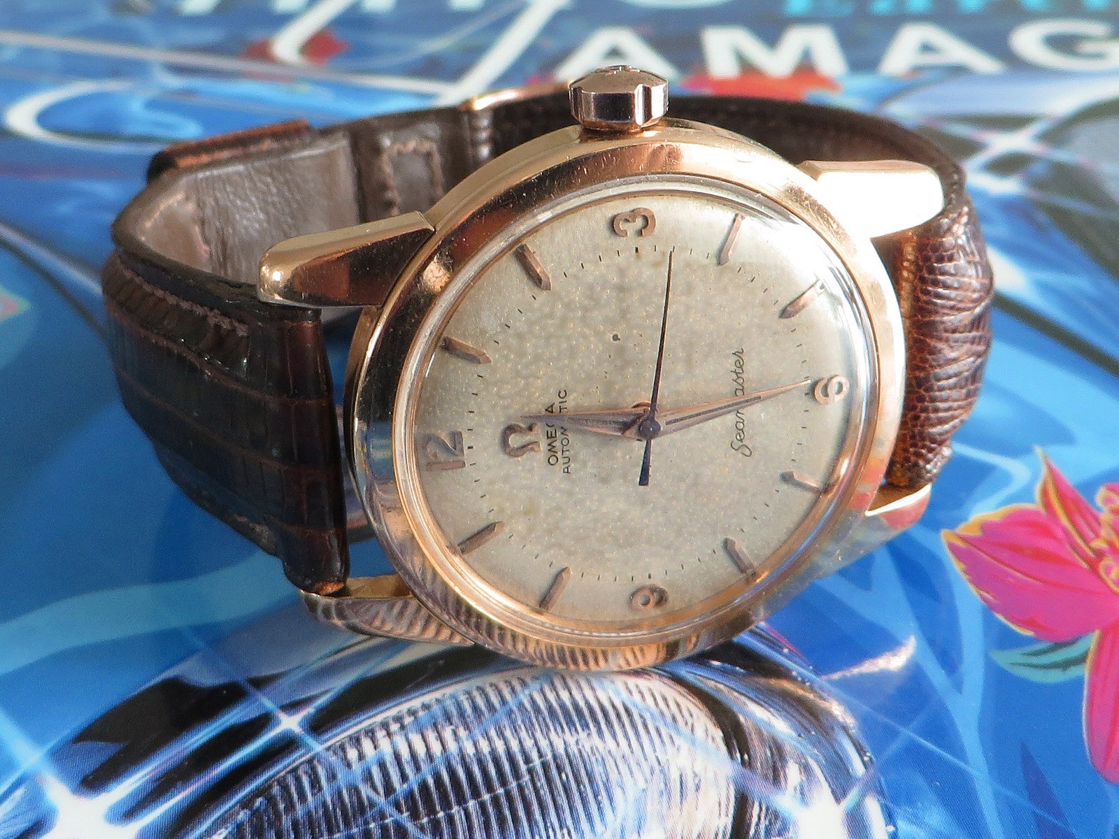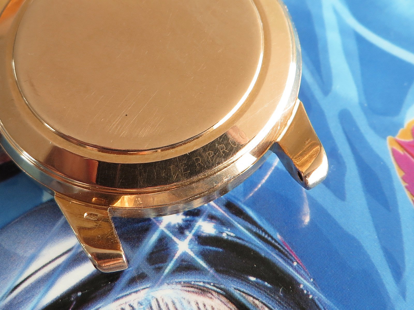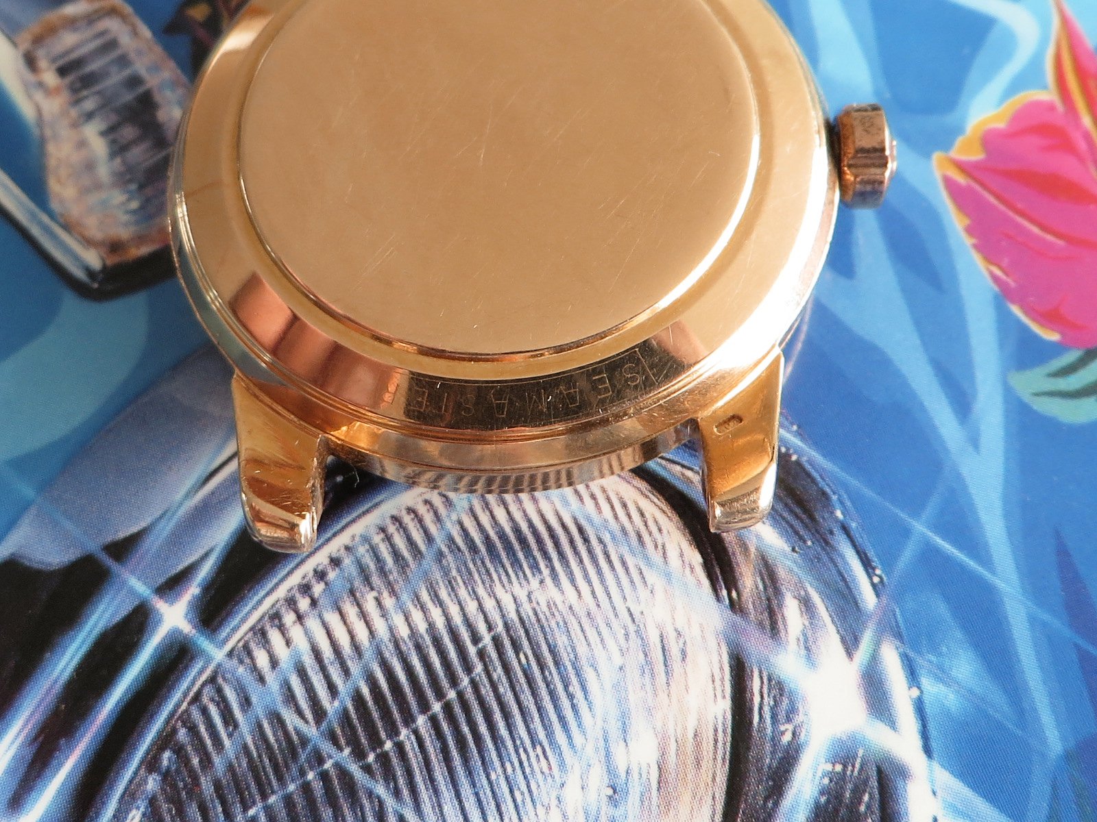 18K SOLID ROSE gold case with classic fat lugs, fitted with a NOS vintage signed rose gold crown (slightly different tone), the SEAMASTER and WATERPROOF markings on the back are still clearly visible. Based on the condition of the back I don't believe the case has been polished, but the lugs have softened from honest use. There is also some wear to the inside the lugs (from a bracelet?). Not a show piece but a very wearable classic solid gold Seamaster.