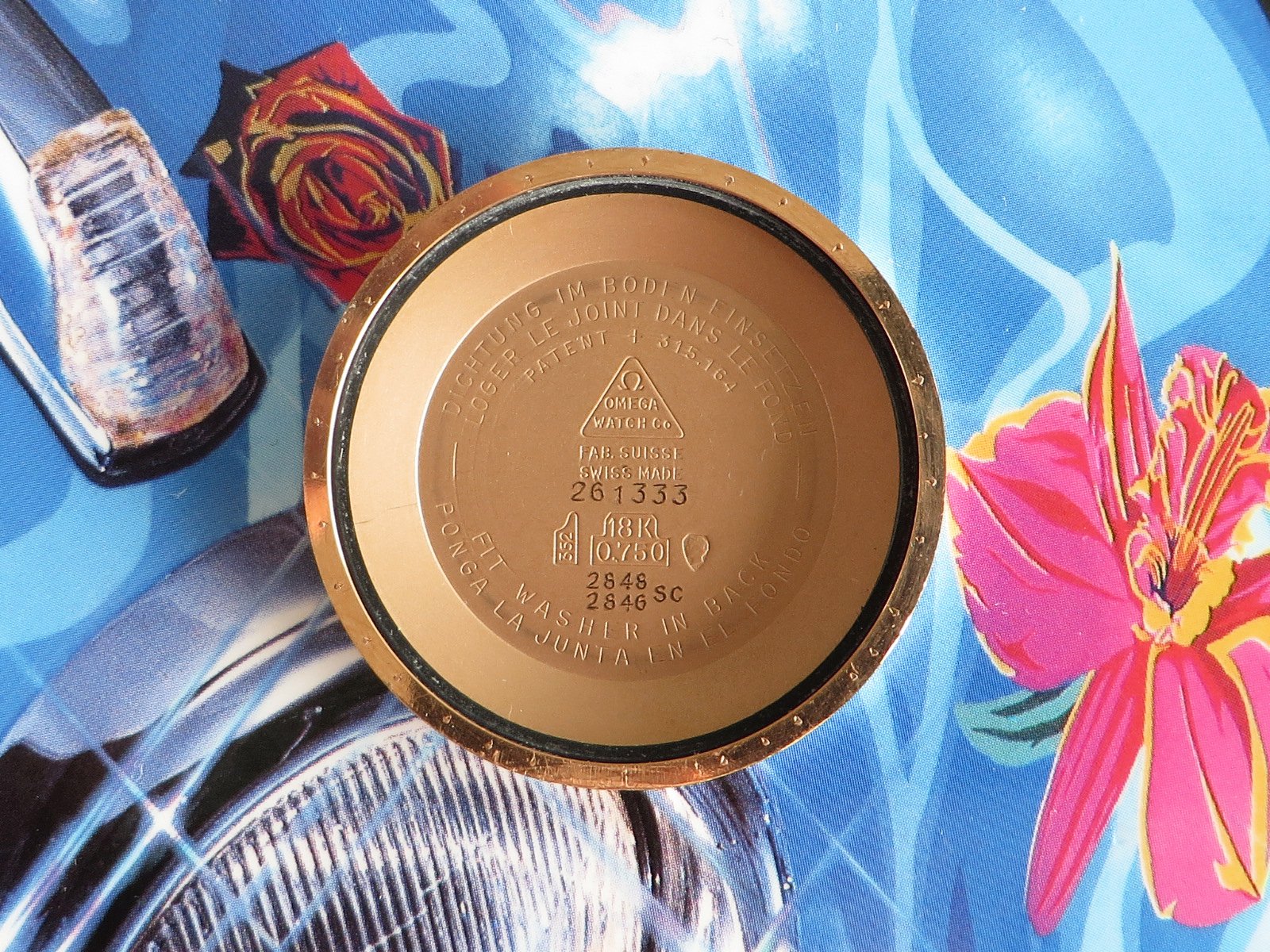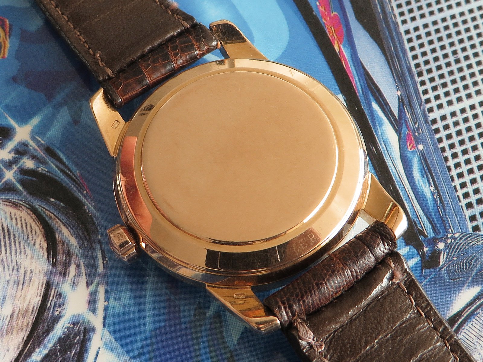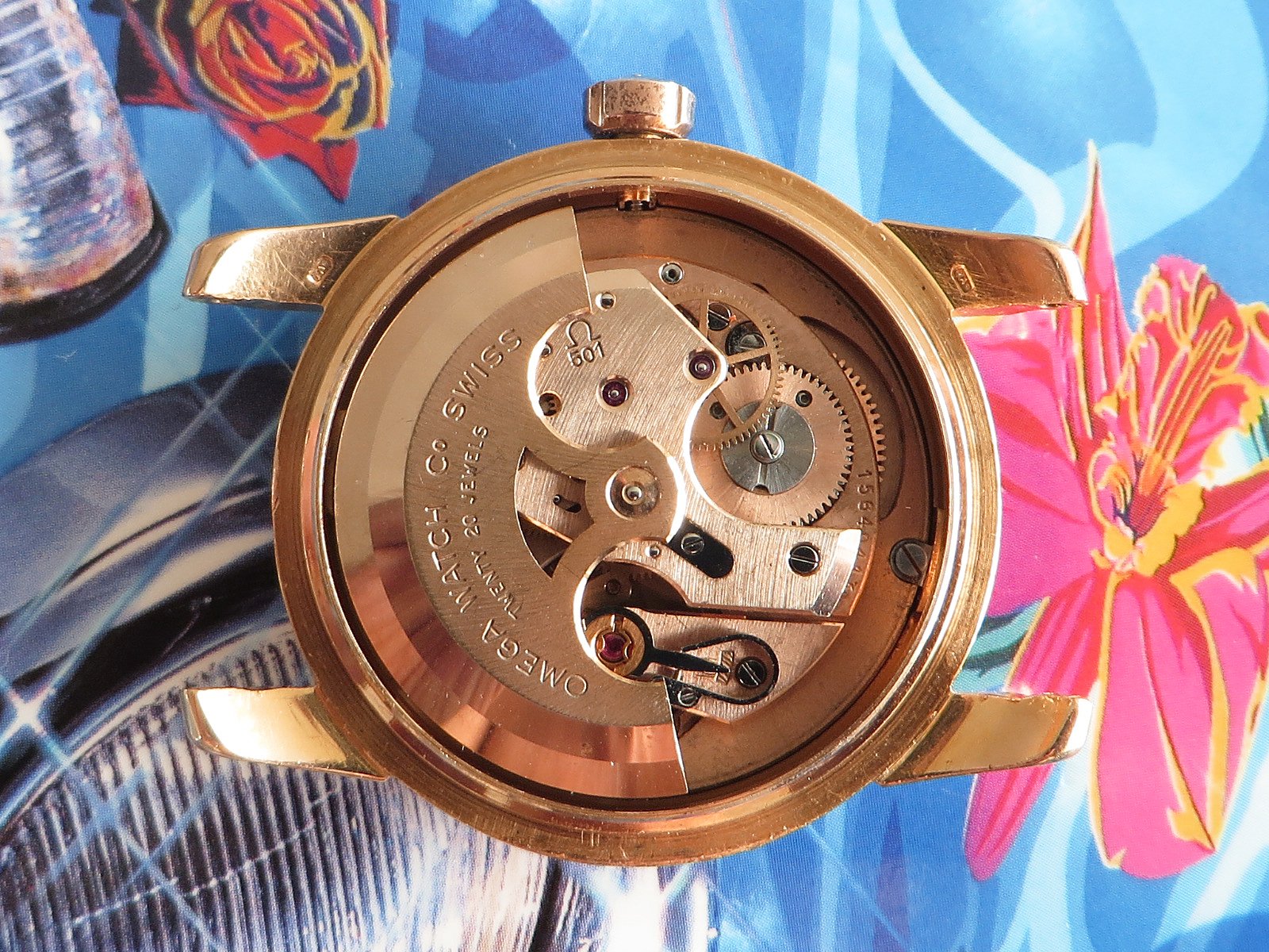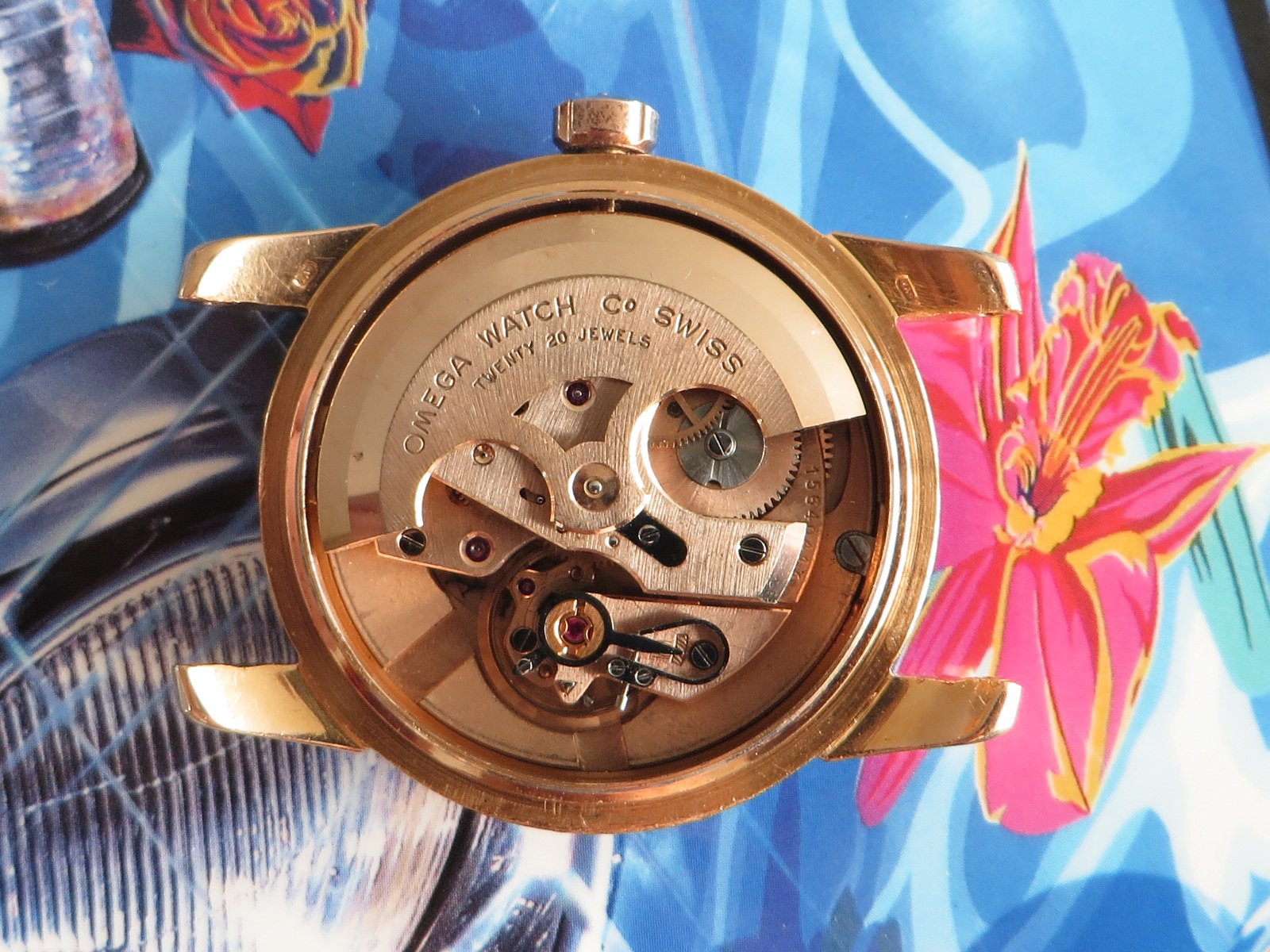 18K SOLID ROSE gold case with classic fat lugs, fitted with a NOS vintage signed rose gold crown (slightly different tone), the SEAMASTER and WATERPROOF markings on the back are still clearly visible. Based on the condition of the back I don't believe the case has been polished, but the lugs have softened from honest use. There is also some wear to the inside the lugs (from a bracelet?). Not a show piece but a very wearable classic solid gold Seamaster.
