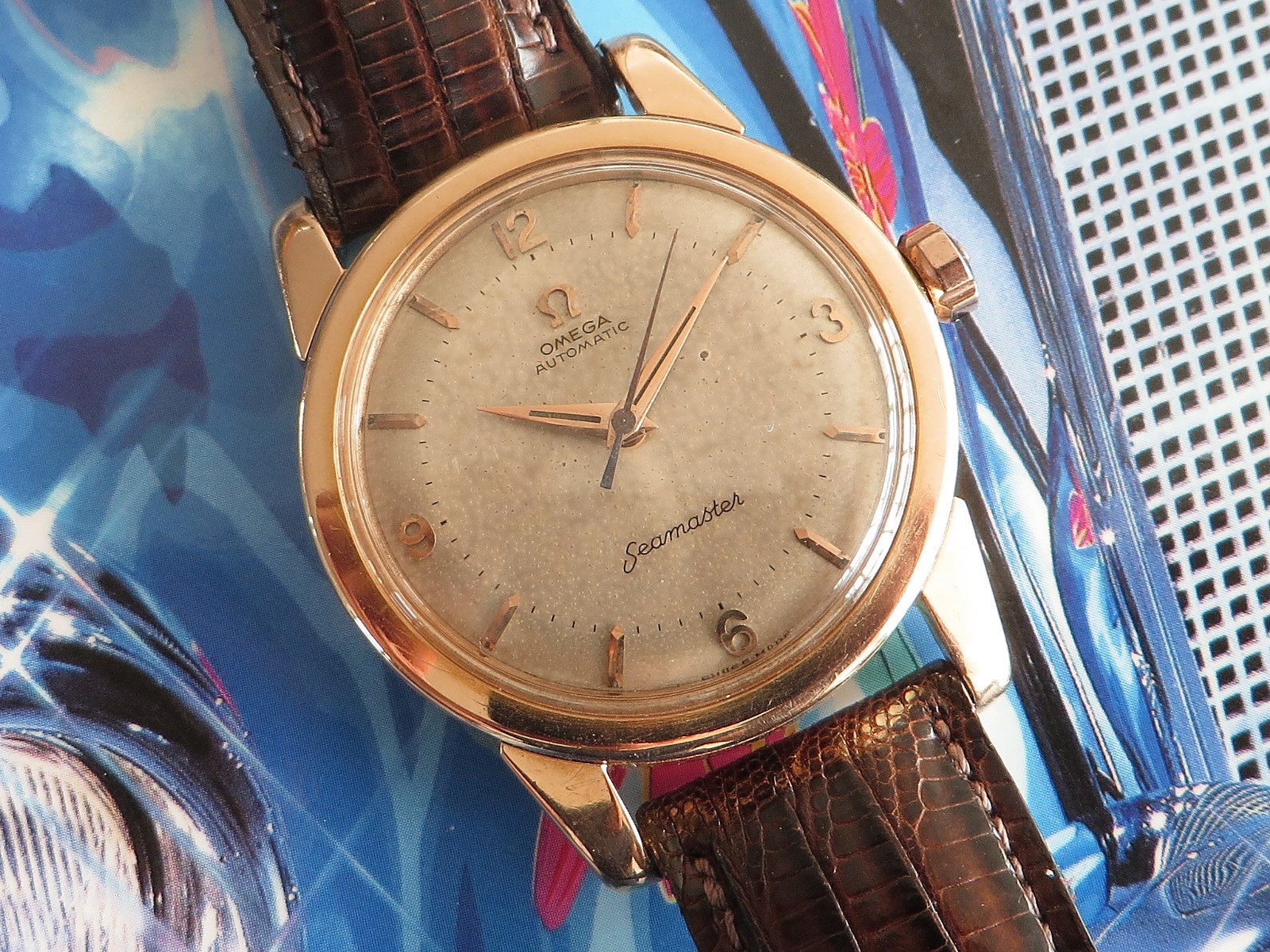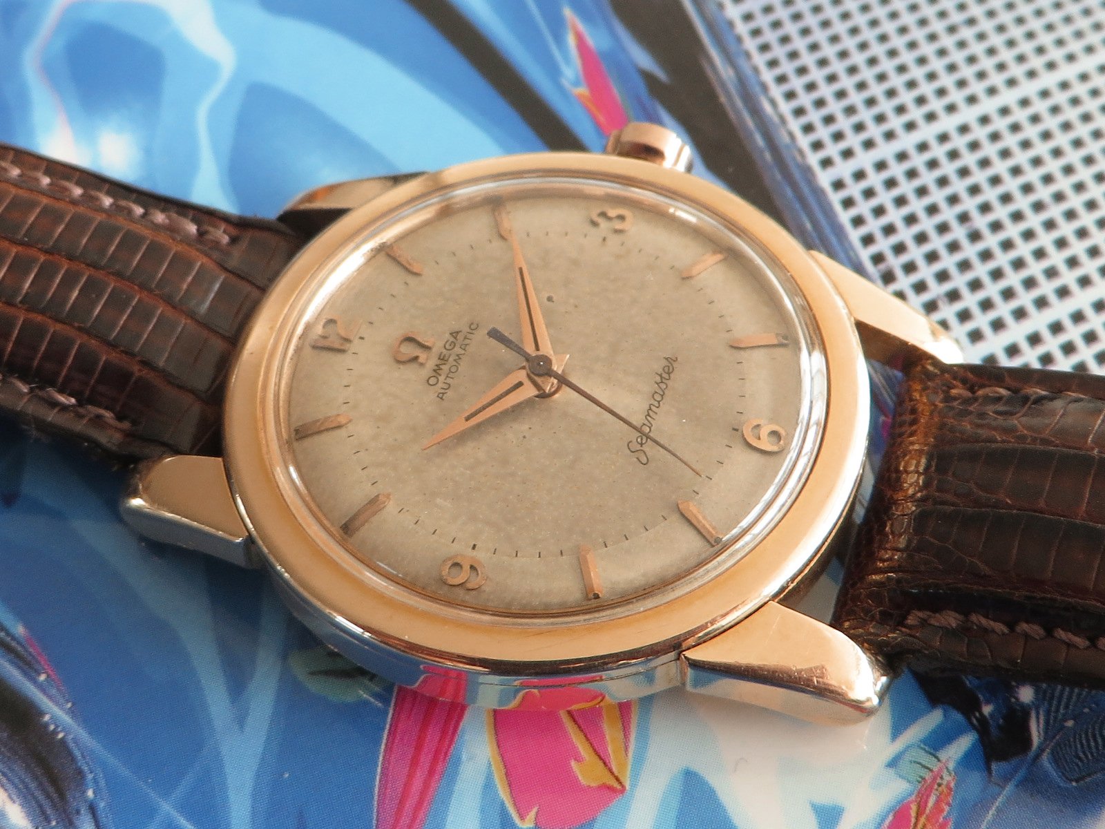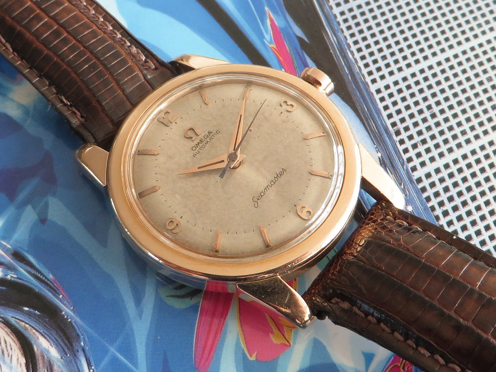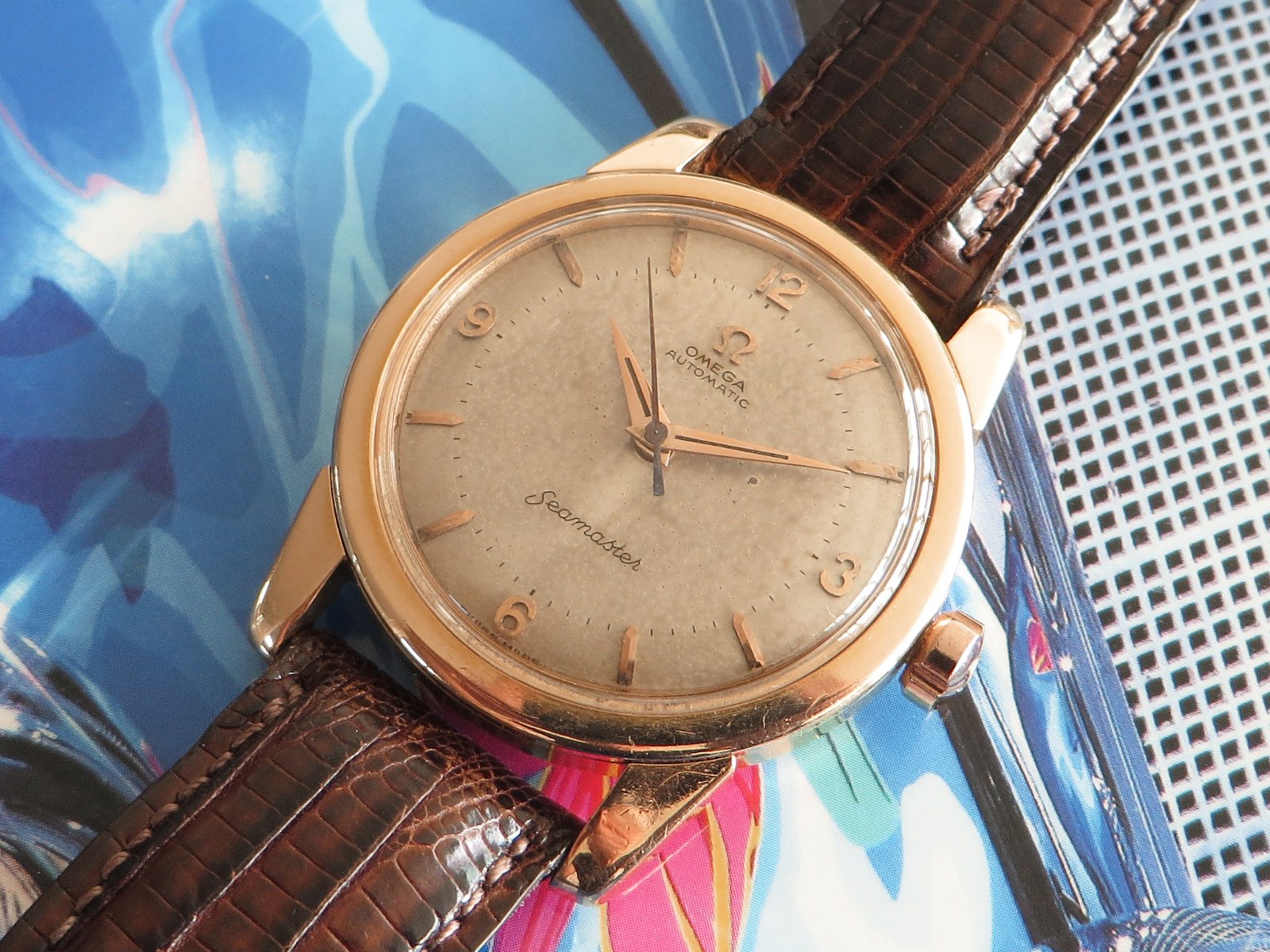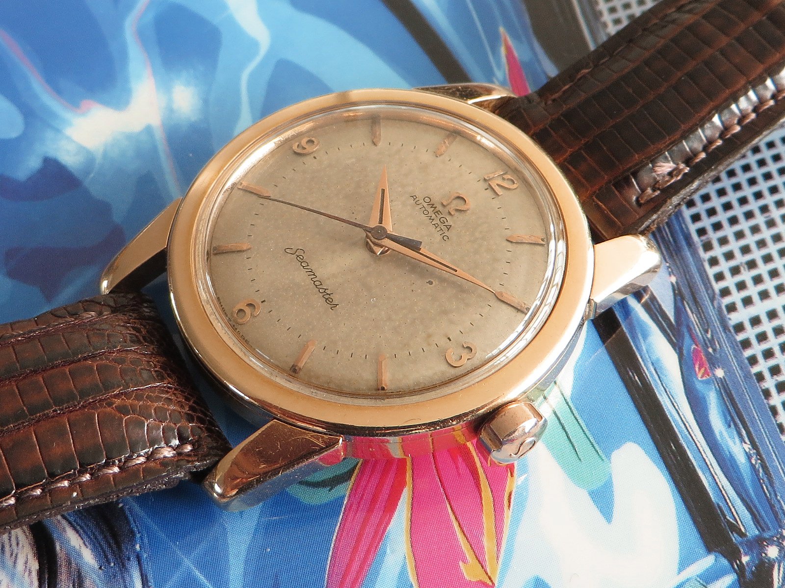 ··Vintage Omega AficionadoOriginal patinated dial with a subtle two-tone effect featuring applied Arabic numerals and multi-faceted pointed tip figures with applied Omega symbol, all in 18K rose gold as are the original dauphin hands. The original signed low dome crystal is free of cracks or flaws.