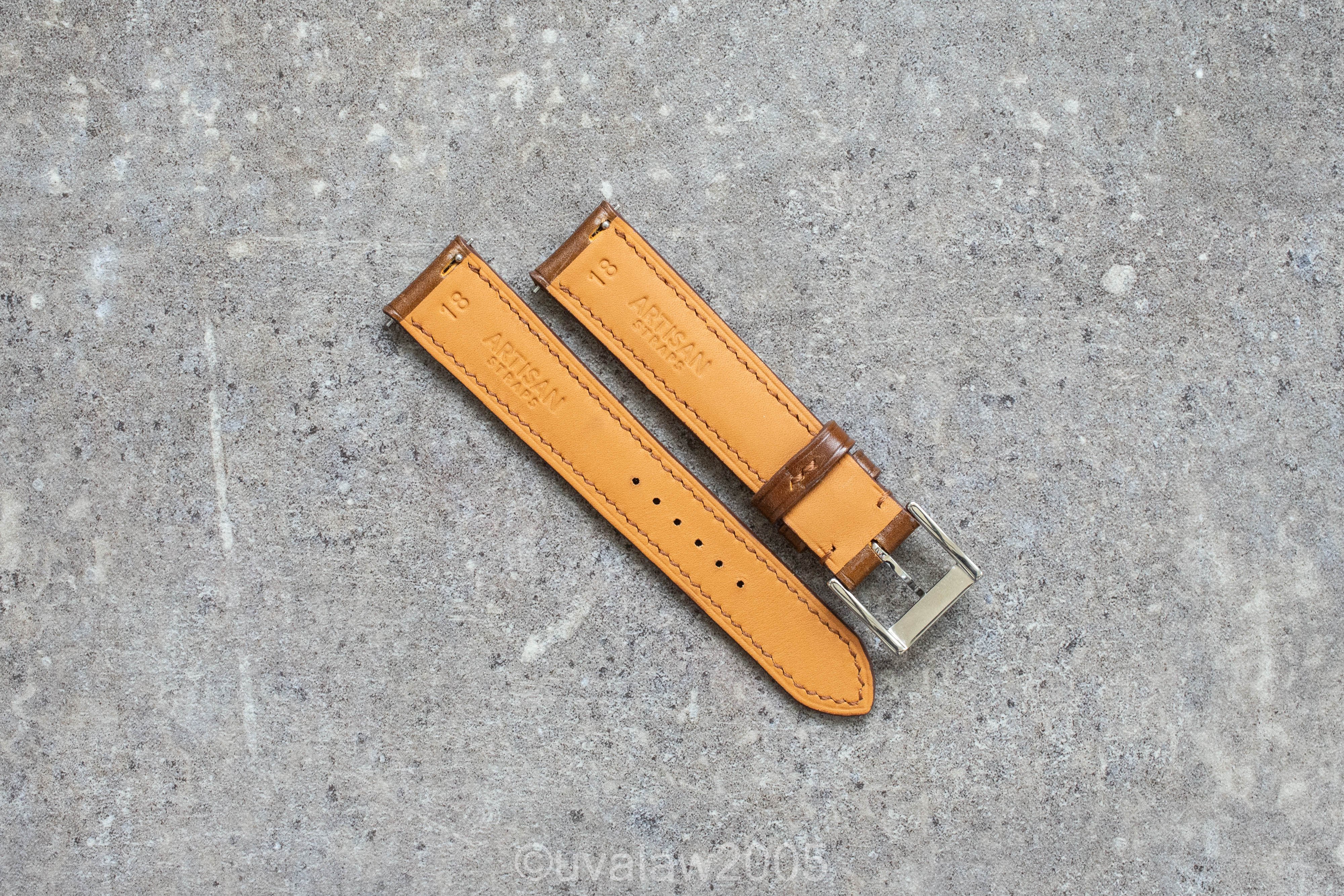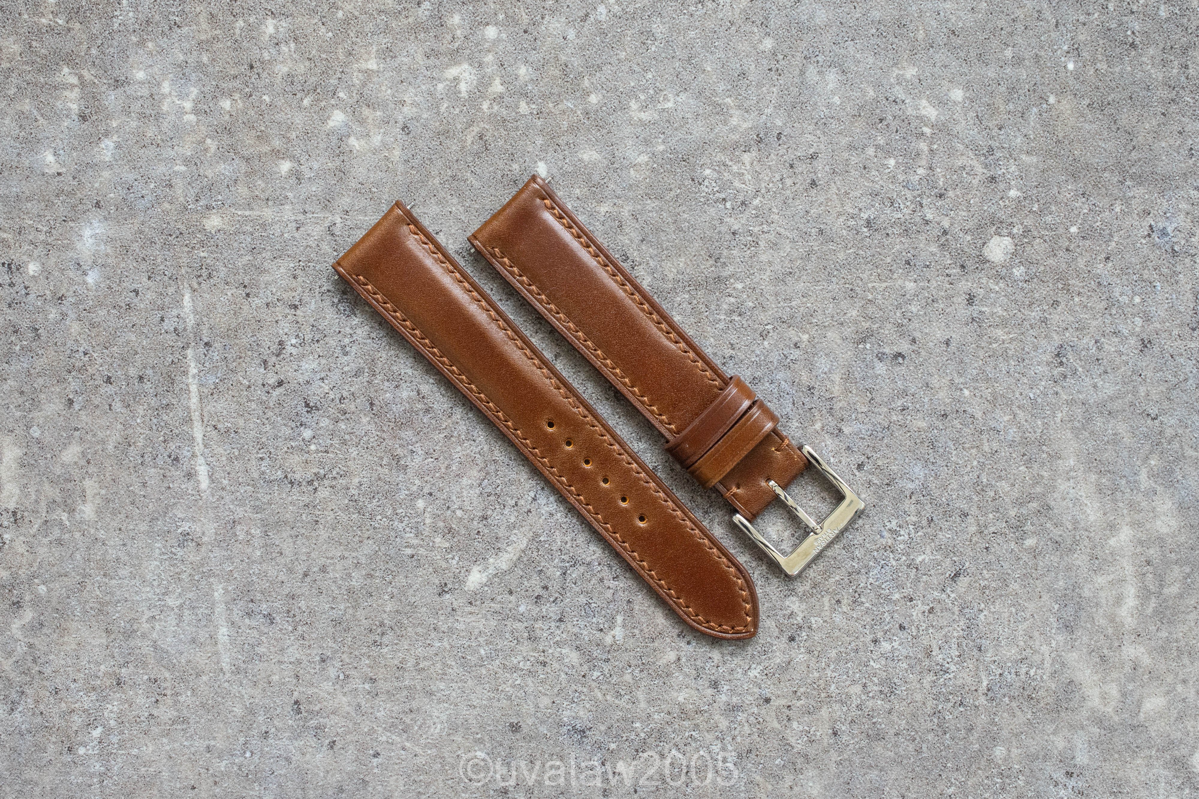 ·For sale is a brand new 18mm custom handmade Cognac Shell Cordovan leather strap from Artisan Straps. Lightly padded strap measures 105mm/75mm, tapers to 16mm, and has quick release spring bars.
