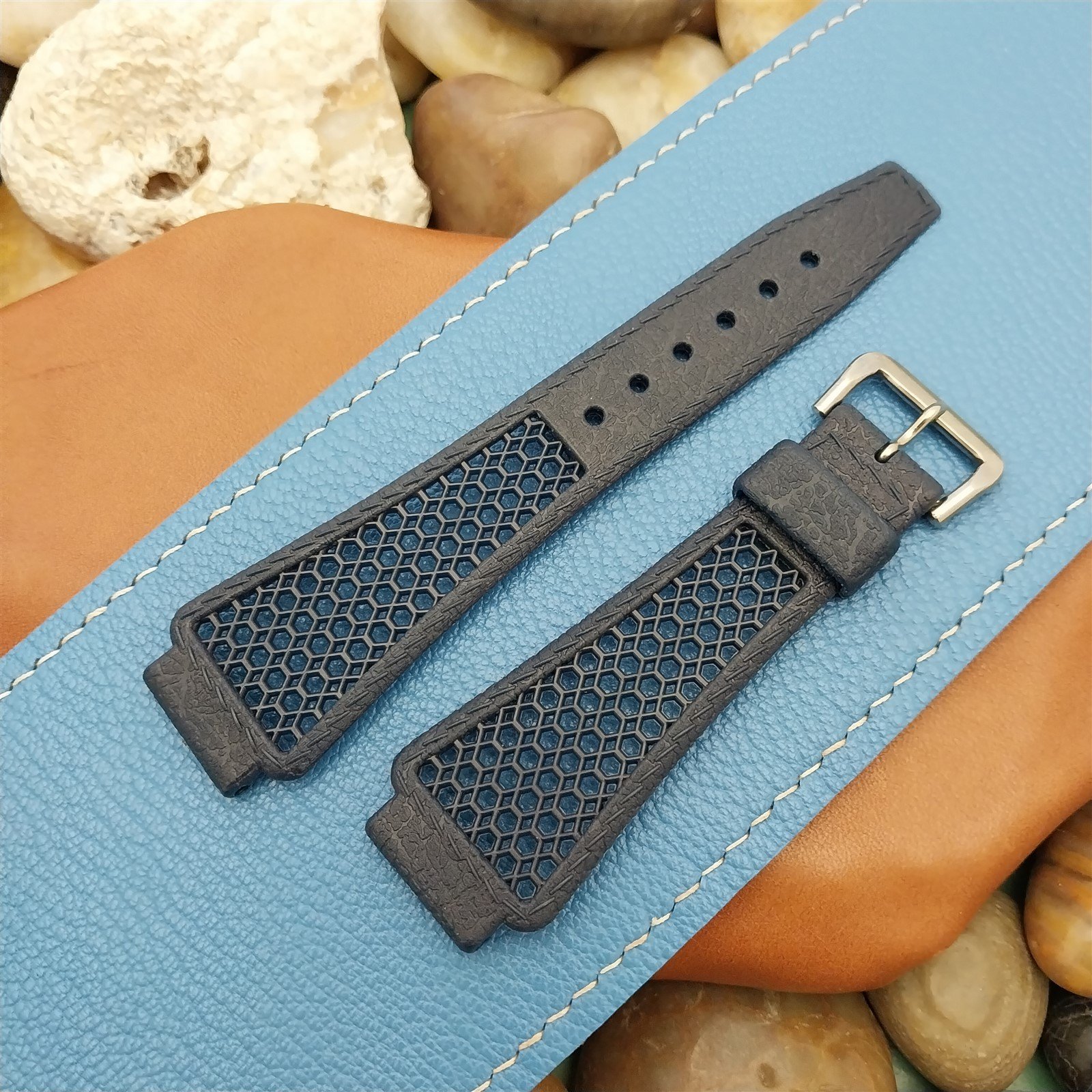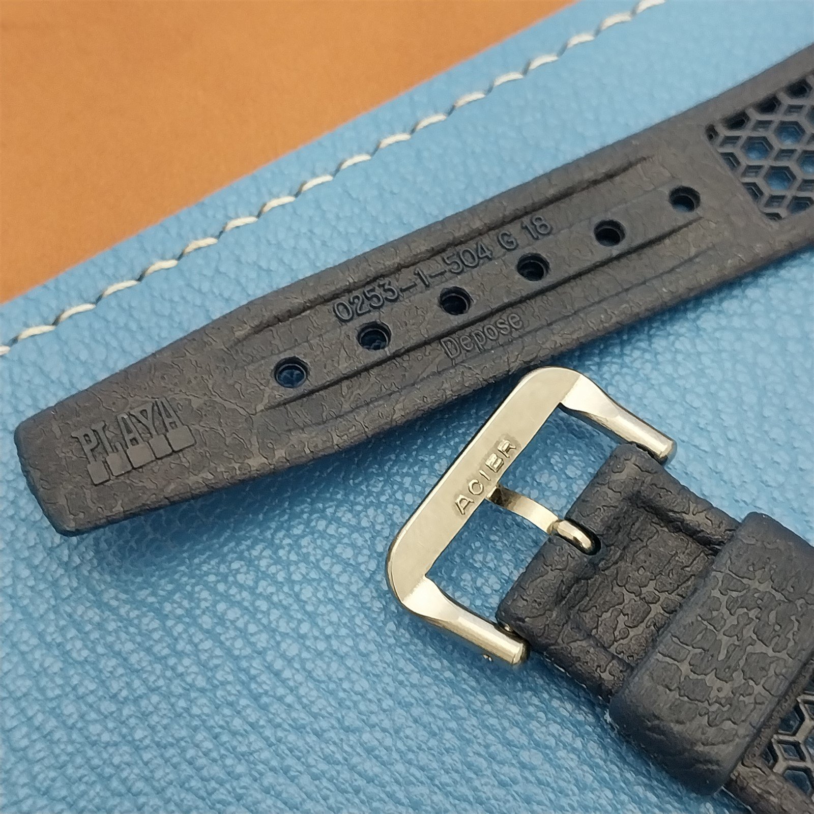 ·NOS unused 1970s old-stock Golay & Guignard Playa ventilated blue synthetic diver watch strap with ACIER stainless steel buckle.