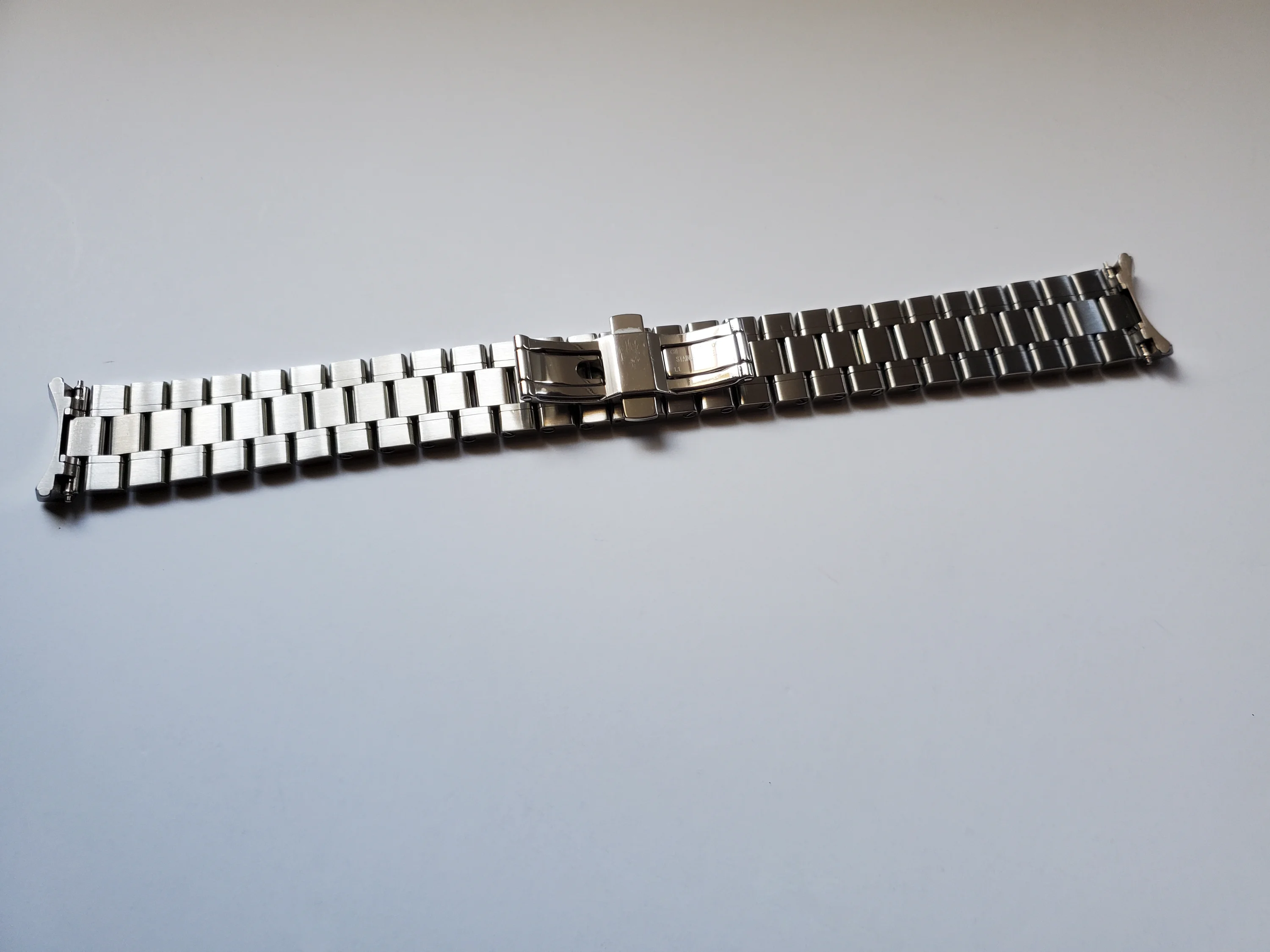 Up for sale is a pre-owned 18mm genuine Omega stainless steel bracelet in excellent condition with light scratches mostly on the polished bits. This bracelet fits the modern Speedmaster 38mm with the 3330 movement that has the oval subdials (eg., 324.30.38.50.01.001). It has brushed outer links and polished center links. Has the cute little Seahorse design on the butterfly clasp. Fully-linked with 12 total removable links and measures approximately 7 inches long. Includes a pair of genuine Omega 18mm spring bars. Please ensure compatibility with your watch before purchase.