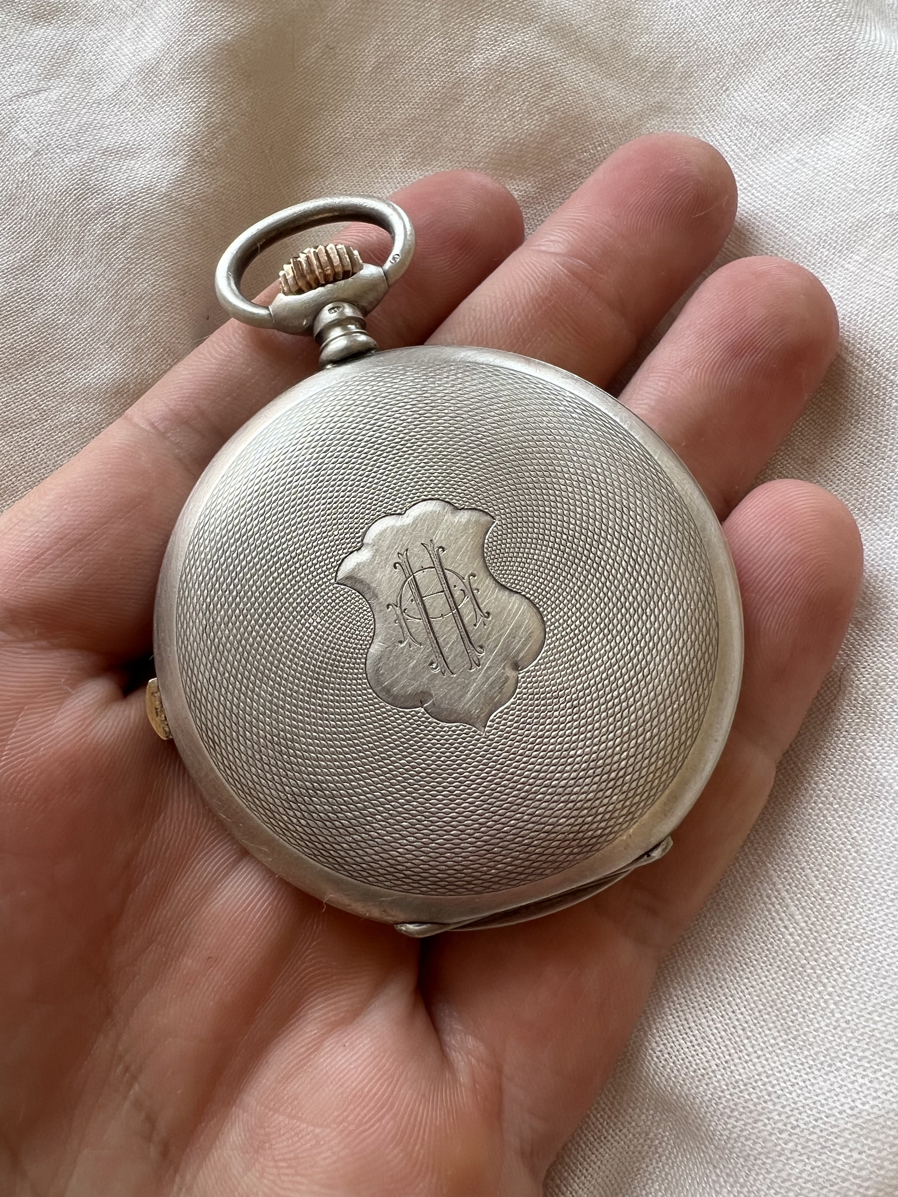 Wanted to share a new acquisition (and my first pocket chronograph). Caliber 19.73N, case serial dates to ~1909, sold in Argentina, where the eBay seller was located. Has an interesting engraving from later in its life (1952) when it was presumably gifted.