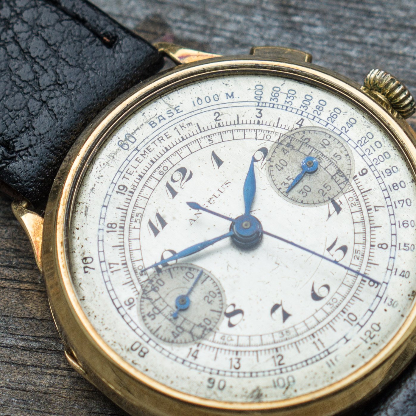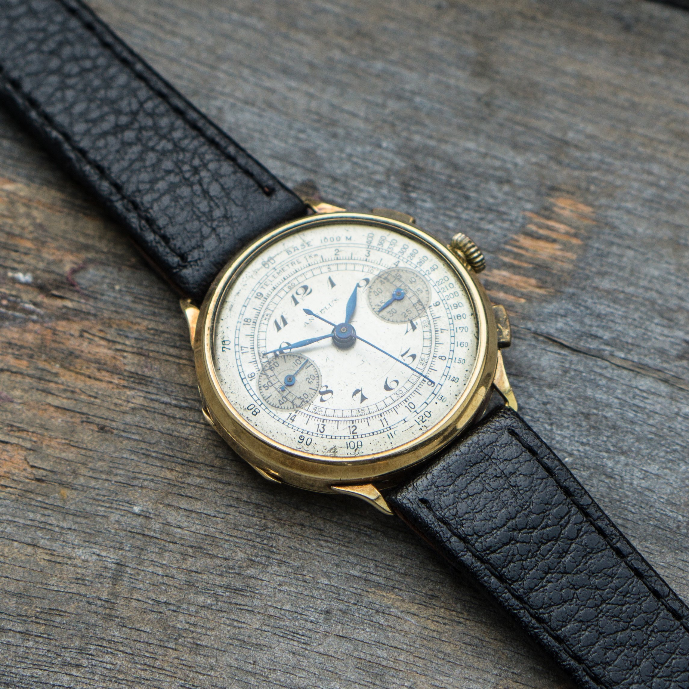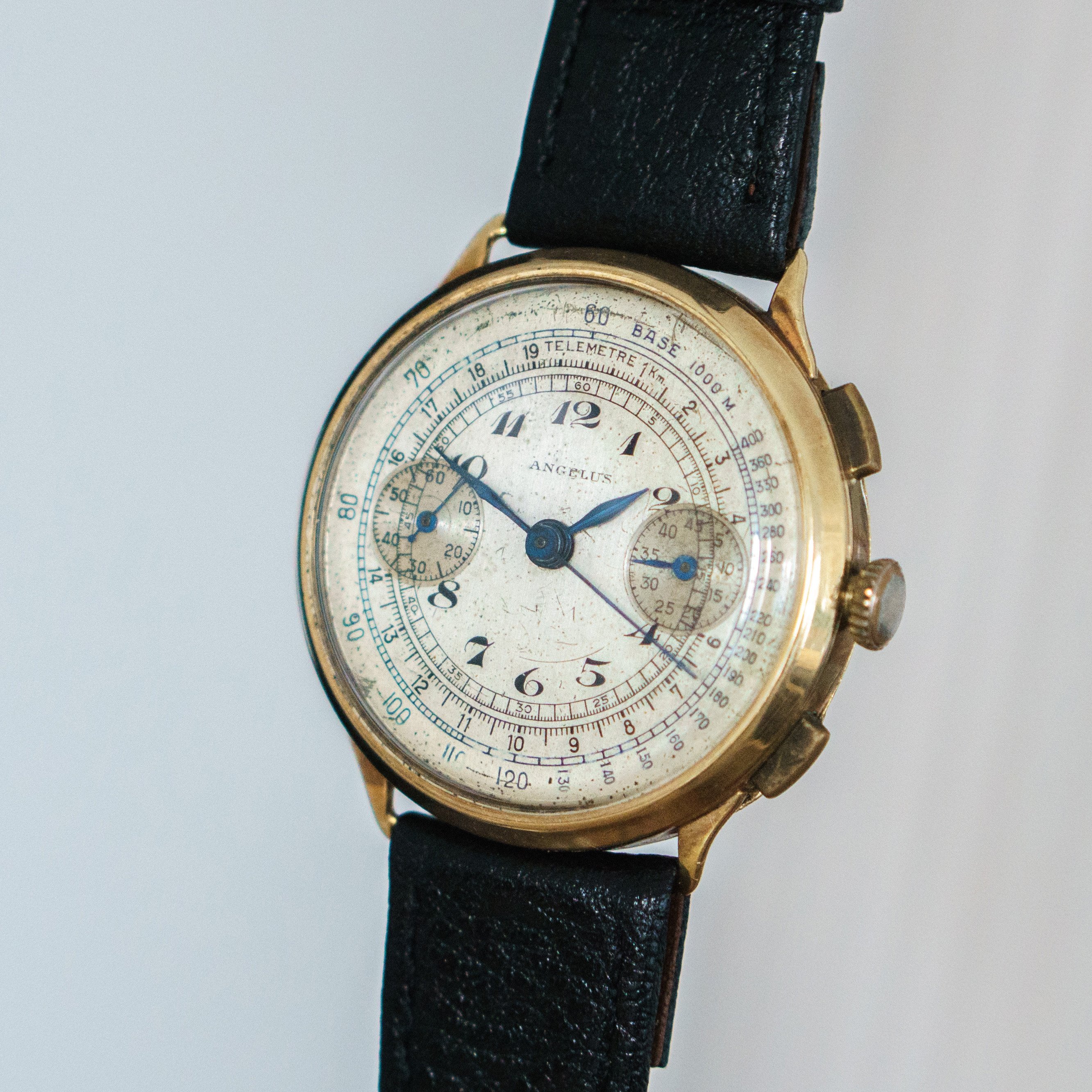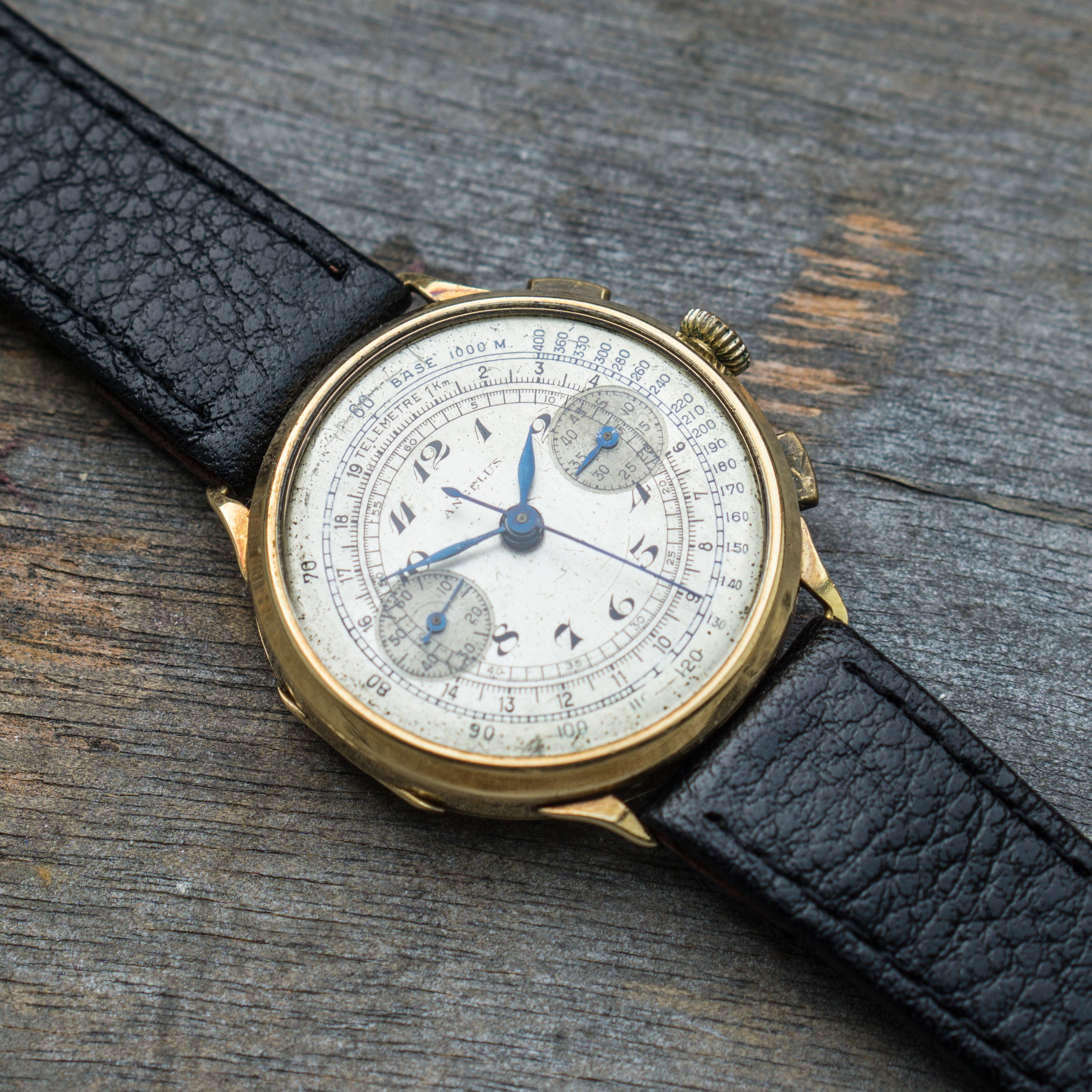 since my focus is on other projects ( and I need the money for them) I let this Angelus Chrono project go. Lets talk about the "pros". The case is made of 14K solid gold and the size is with 36mm huge for its time. Time means early to mid 30s, since the watch houses the early Angelus Chronograph Movement Cal. 210. Another hint to its age, is the caseback, that opens up like we know from pocket watches. Cool feature. The dial has Patina but also a lot of charme. The hands are blued annd also all orginal.