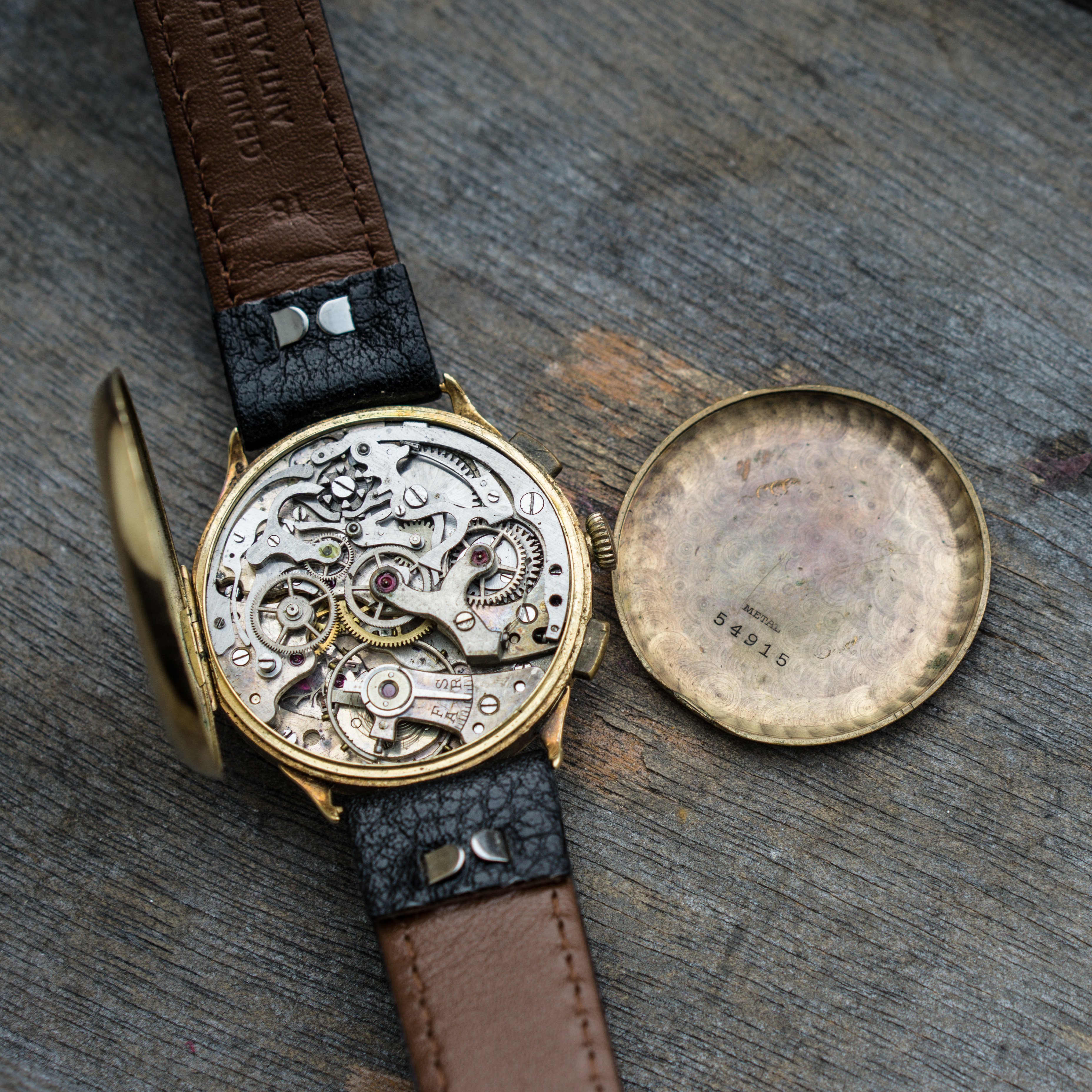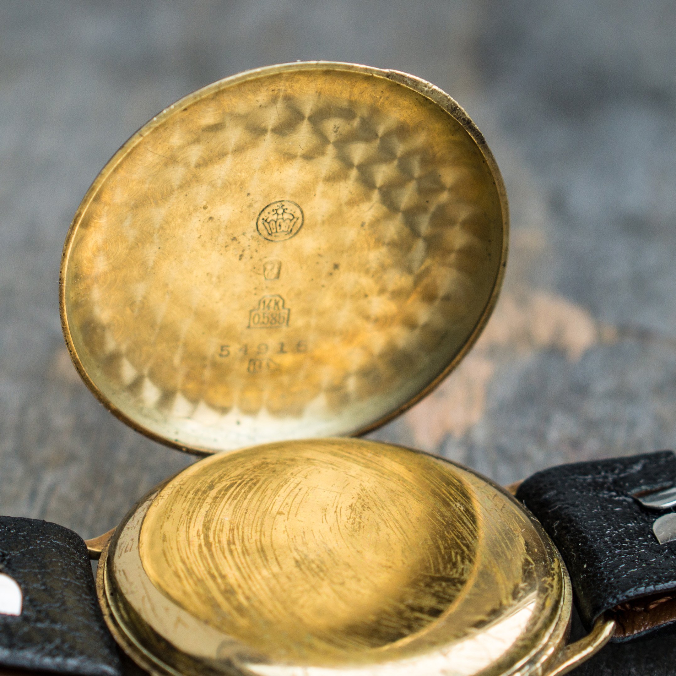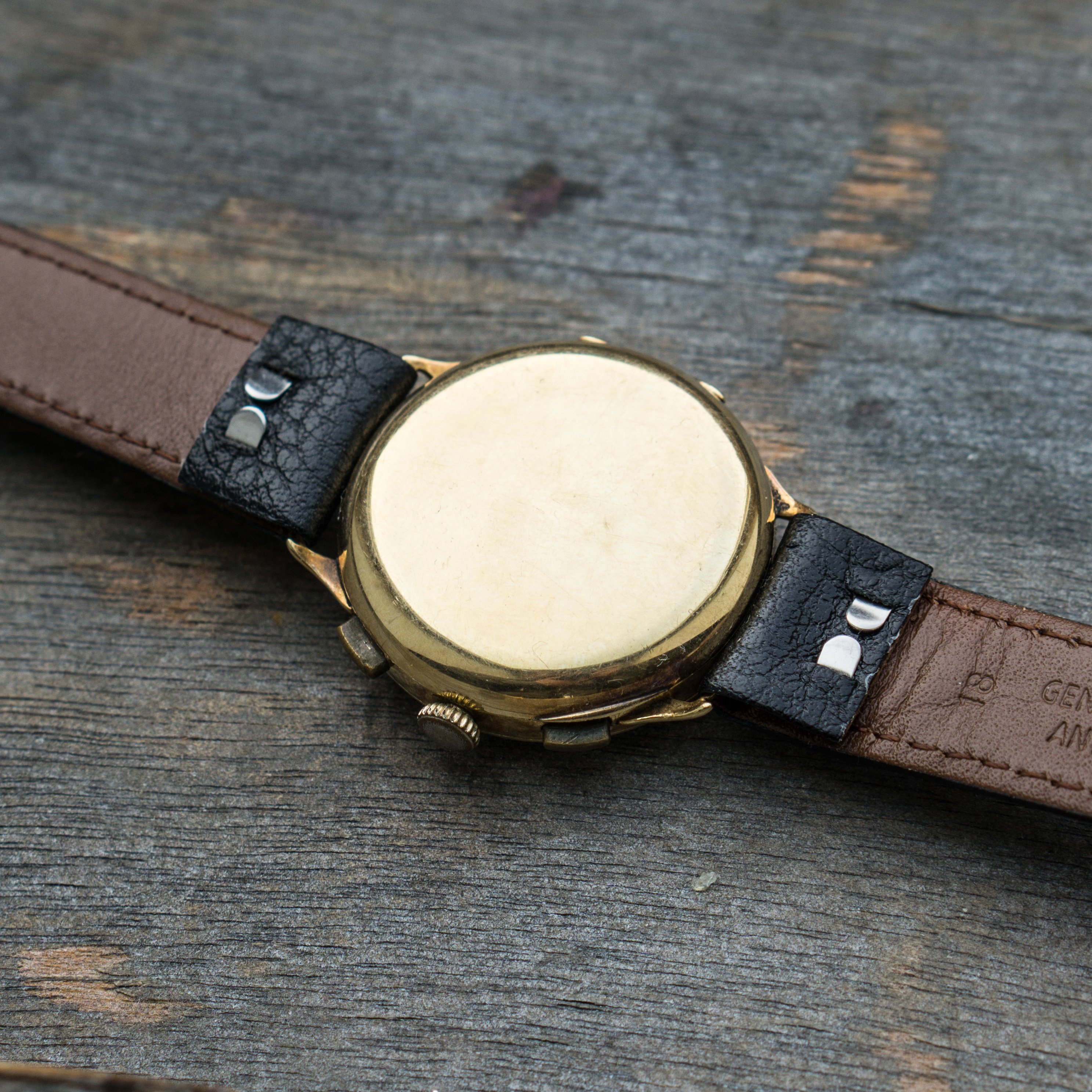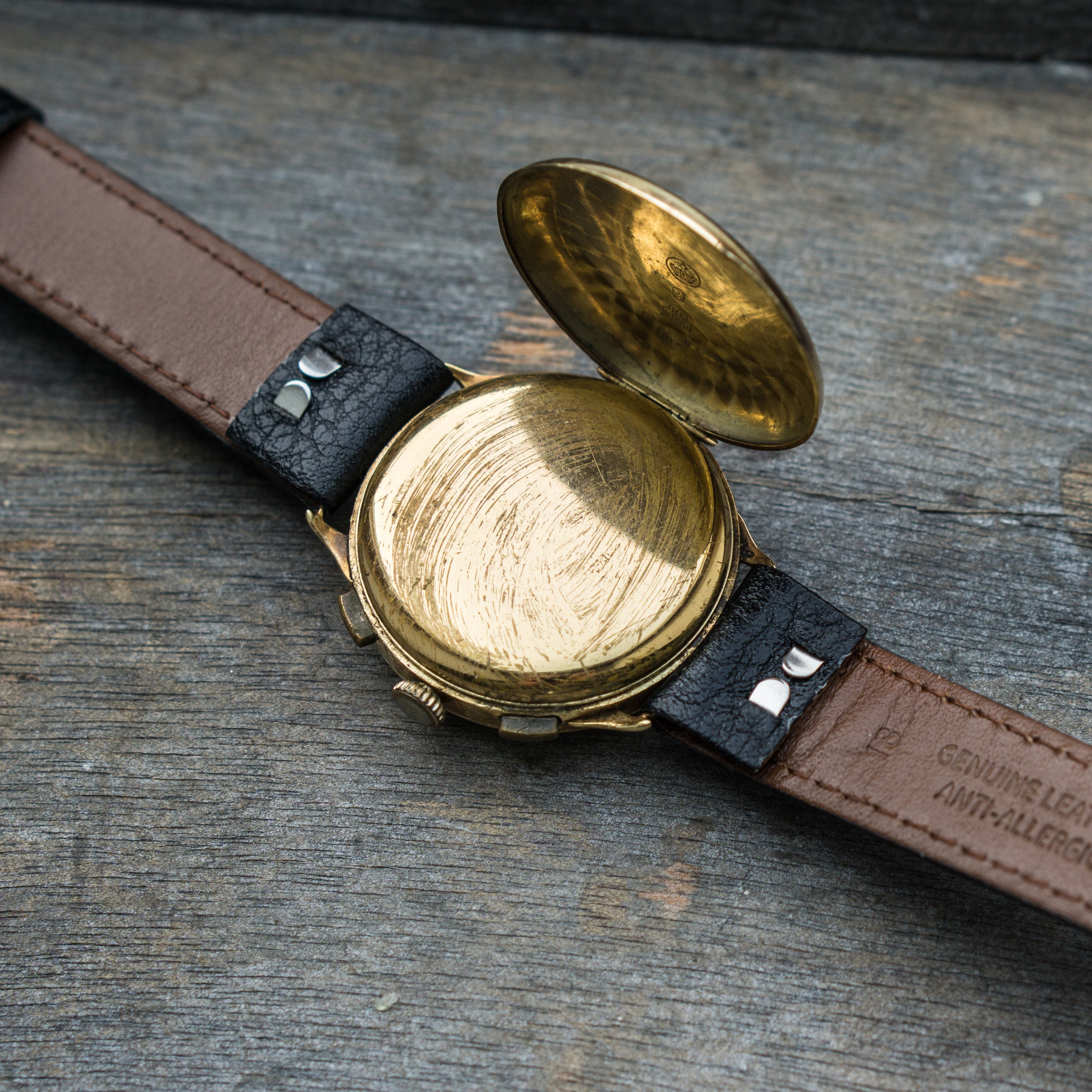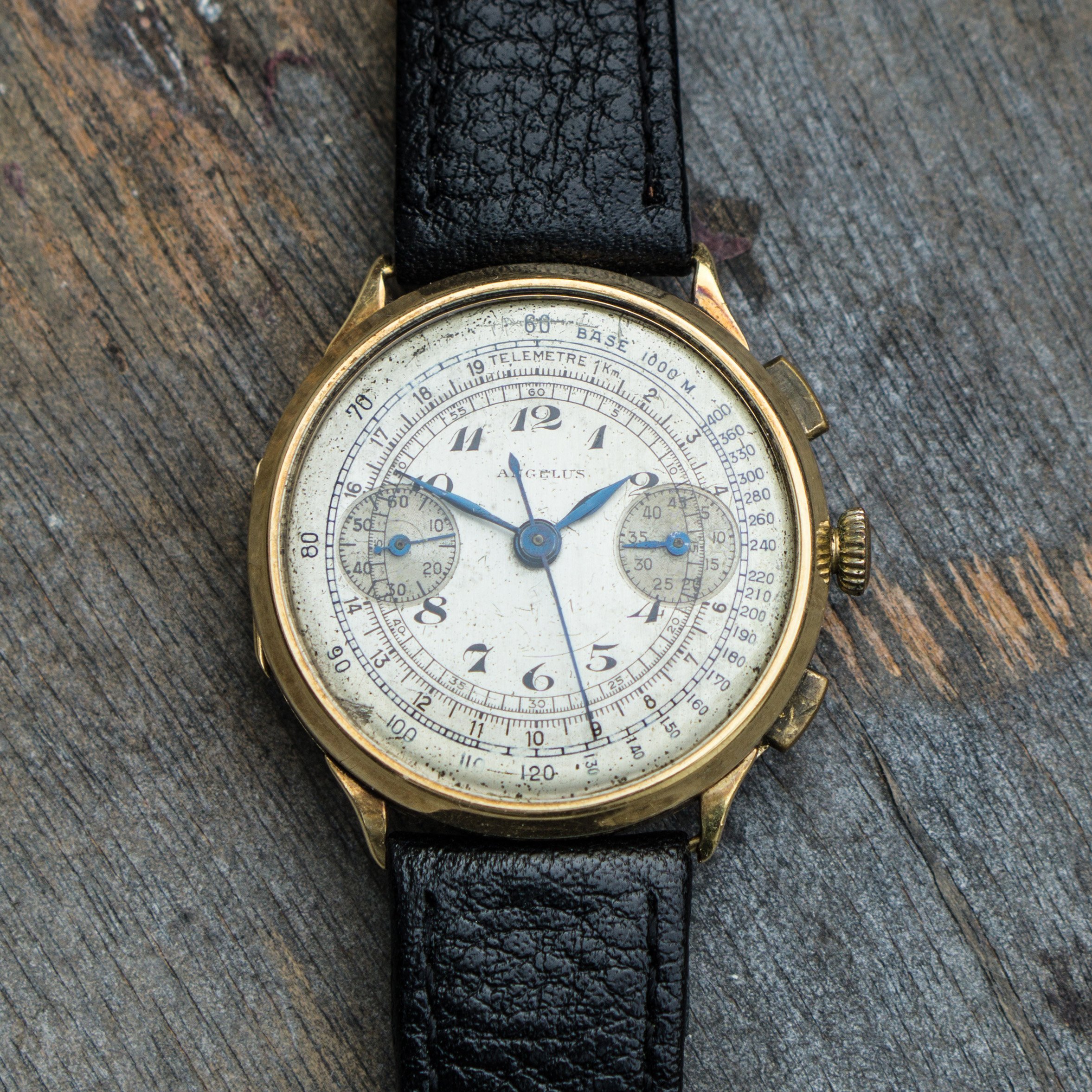 since my focus is on other projects ( and I need the money for them) I let this Angelus Chrono project go. Lets talk about the "pros". The case is made of 14K solid gold and the size is with 36mm huge for its time. Time means early to mid 30s, since the watch houses the early Angelus Chronograph Movement Cal. 210. Another hint to its age, is the caseback, that opens up like we know from pocket watches. Cool feature. The dial has Patina but also a lot of charme. The hands are blued annd also all orginal.