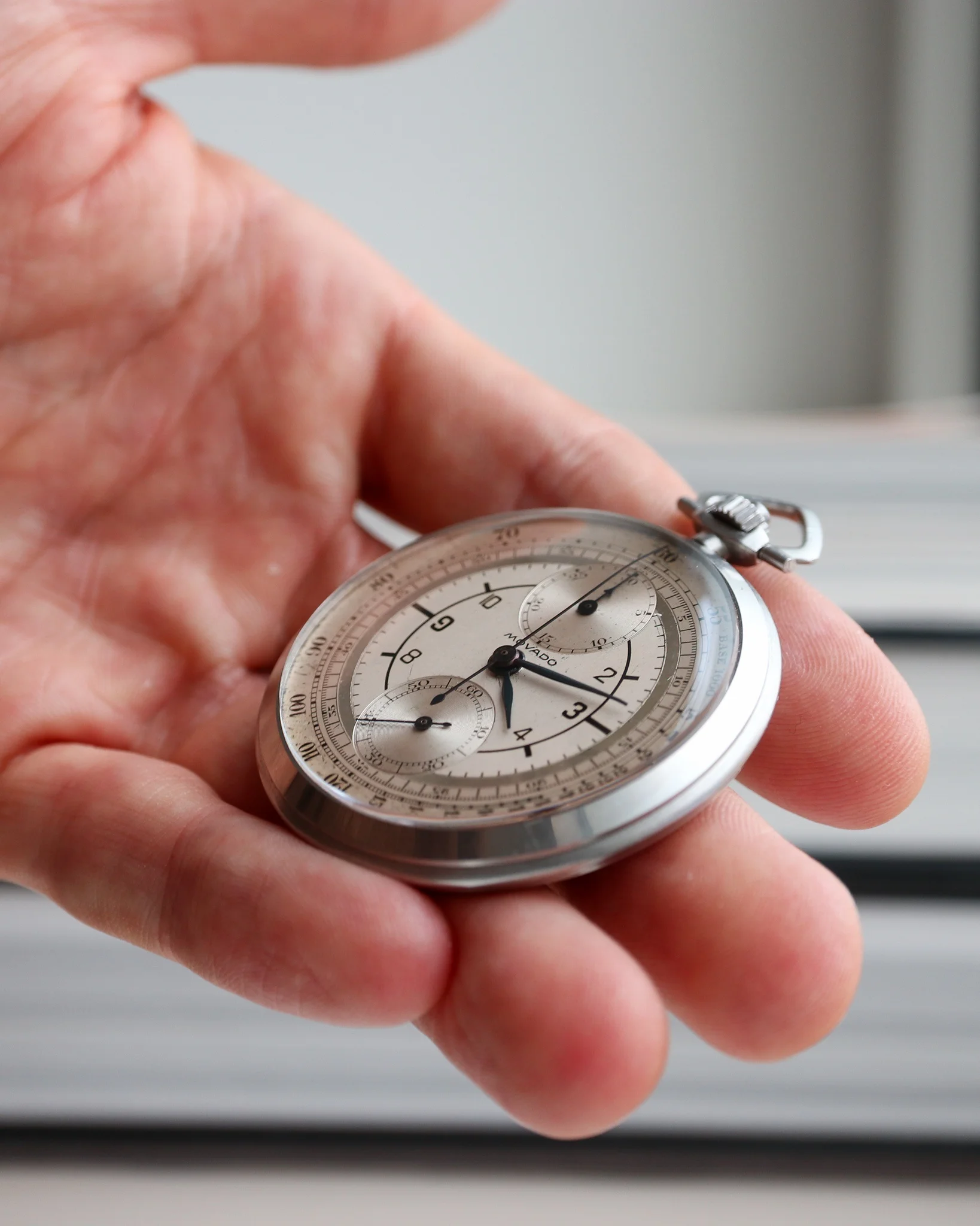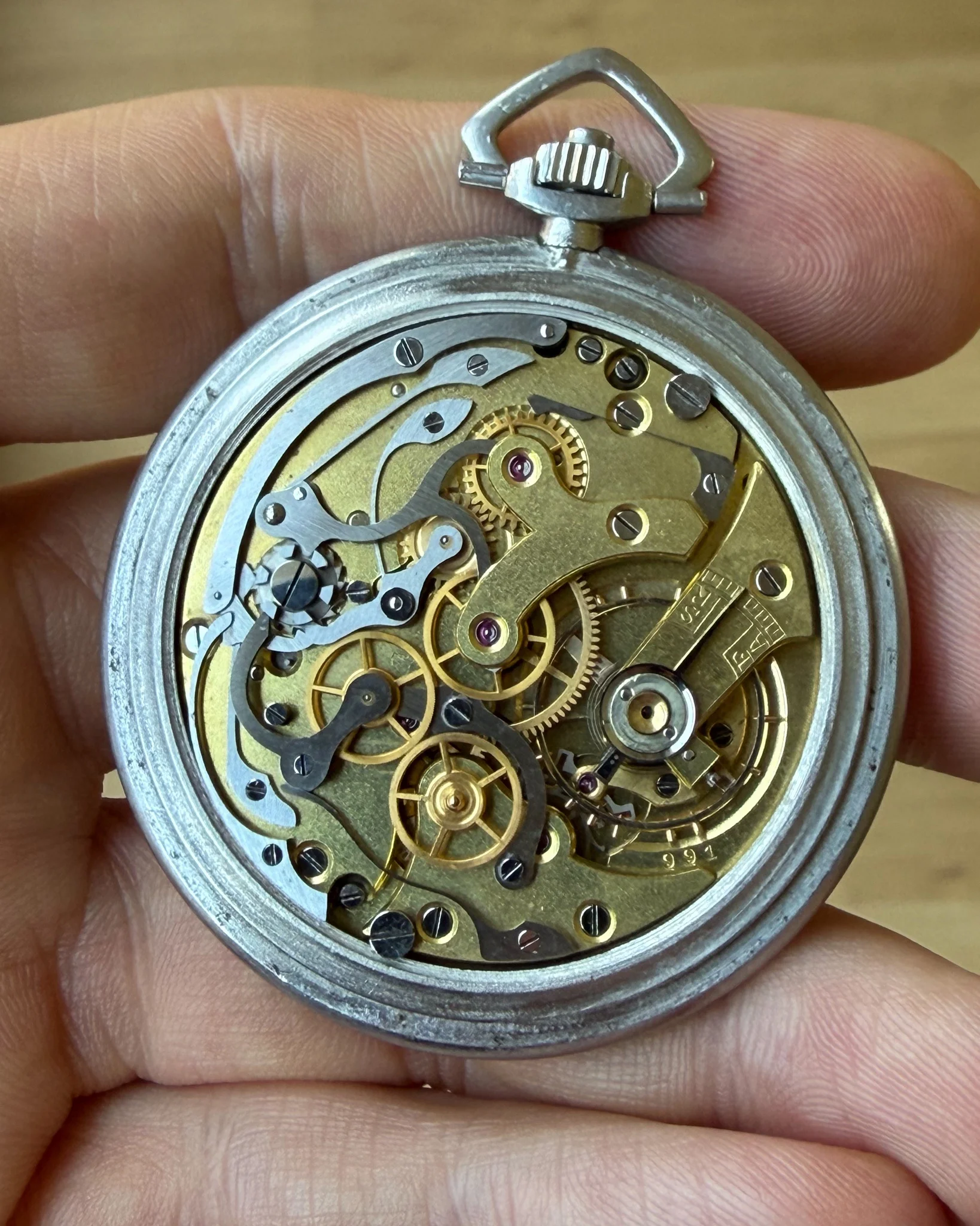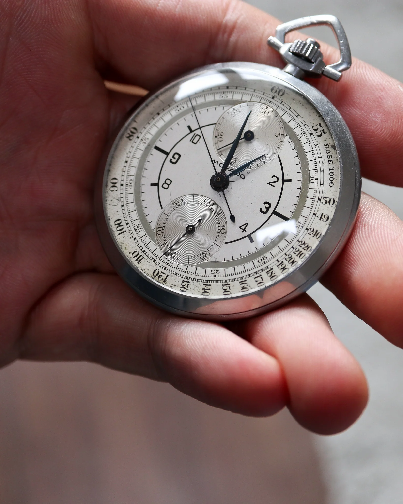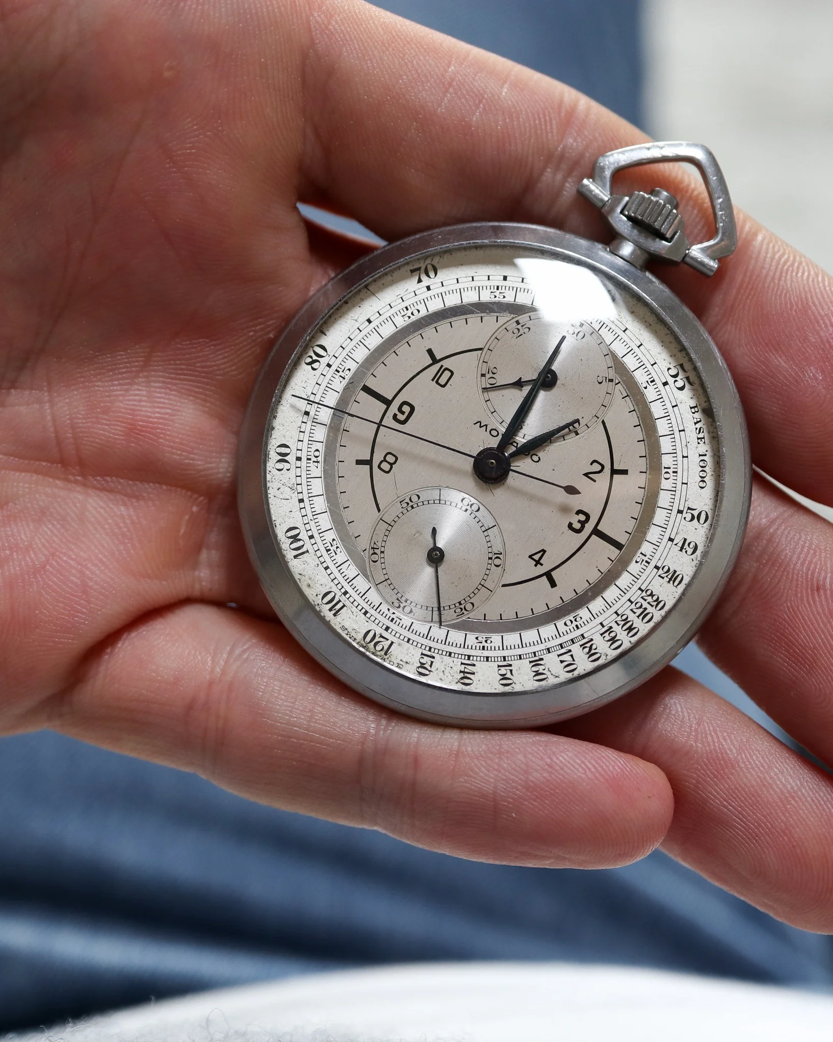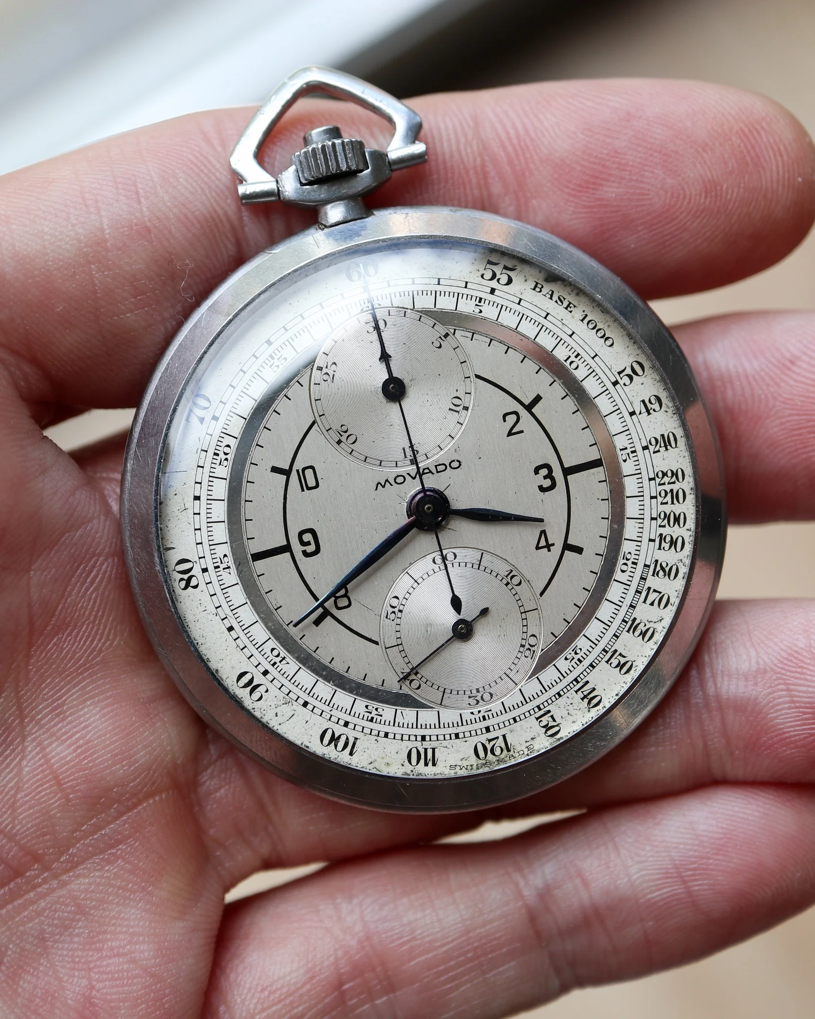 ·Rare piece of Movado history for sale - a pocket chronograph with Valjoux 60VP inside. Fully serviced end 2023 and a new correct crystal fitted then. The necessary parts were replaced then. Works great and as it should in all functions. It has the package; bi-color sector dial, blued hands, steel staybrite step case, and a very rare early chronograph movement in superb condition. I also uploaded a youtube video below, don't forget to select the highest quality setting 😀