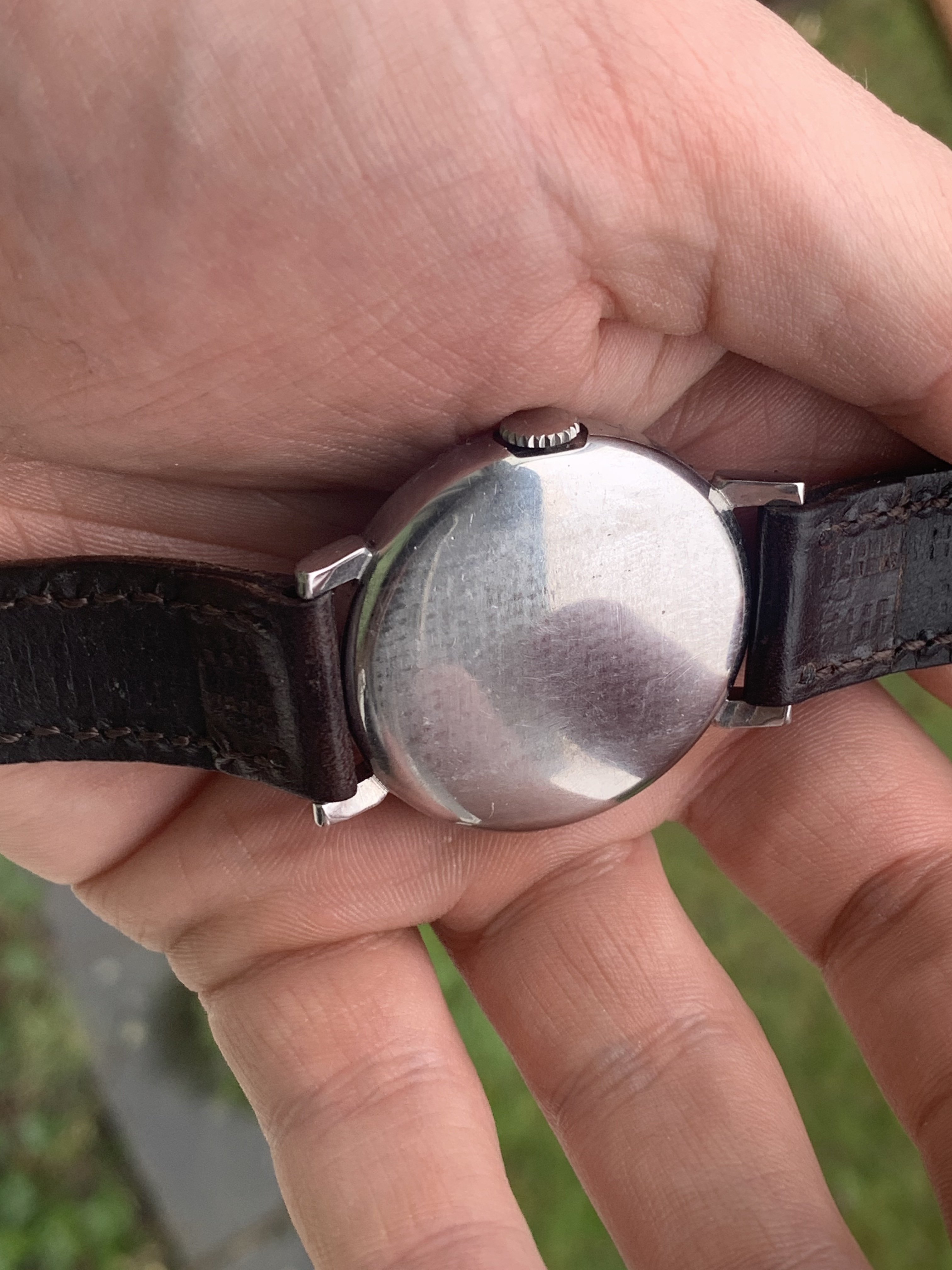 Case: The case retains the chamfers and edges that define this cases character but it may have seen a light polish sometime during its lifetime. It measures 35mm so is quite a rarity to find one of this size during the 30s. It uses spring bars, so can fit your regular straps just fine.