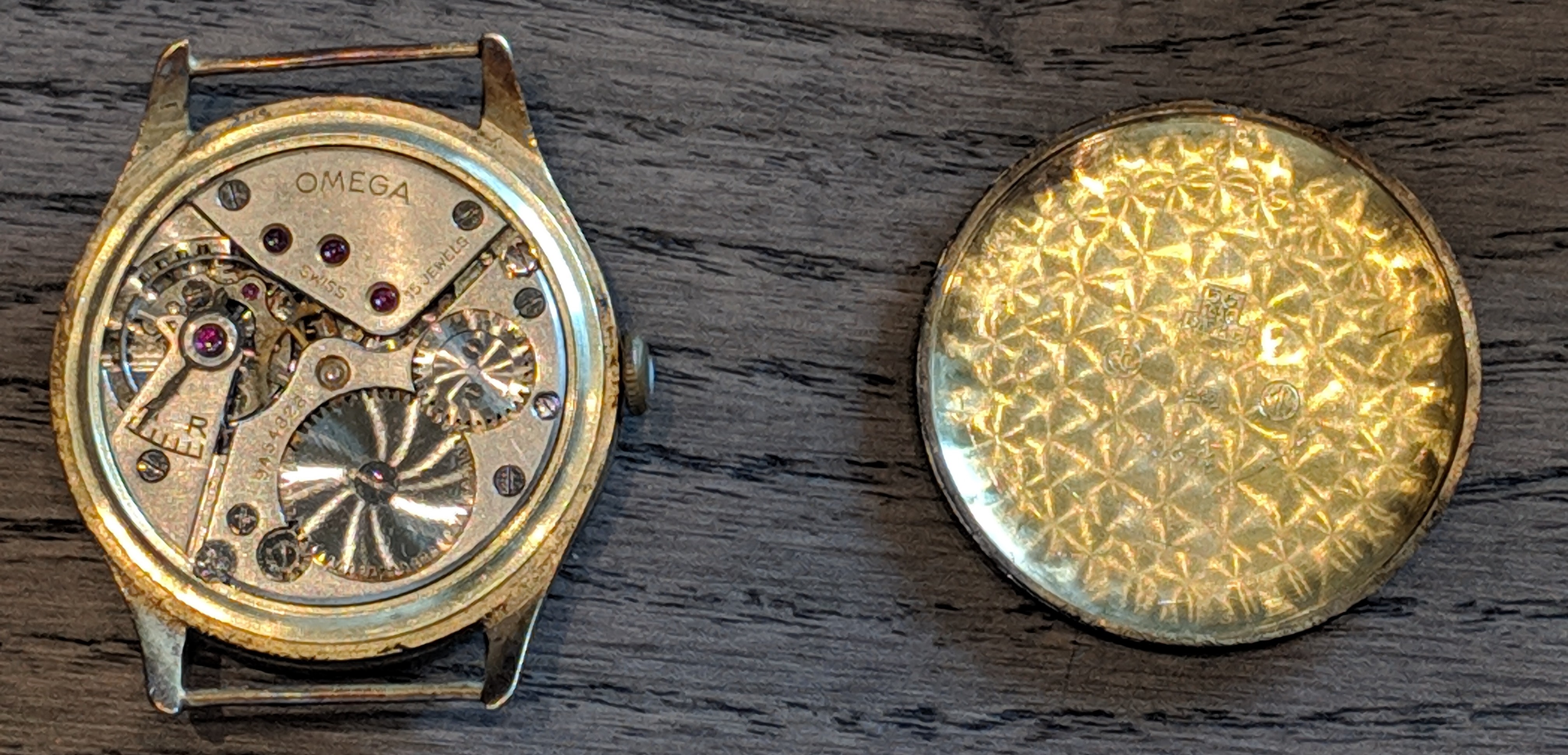 A few weeks ago my grandfather's 1939 30T2 with wedge Roman Numerals on the face was stolen by thieves who broke into our house. See attached photos, both with the original gold case and a steel case that was used later as the gold case was warped. The movement number was 9454328 . The face is the same as this watch: https://www.vintage-portfolio.com/shop/verkauft/currently-in-service-omega-35mm-vintage-watch-30t2/ . I believe my grandfather's watch was bought in Warsaw or Lodz, Poland, right before the war, and miraculously survived.