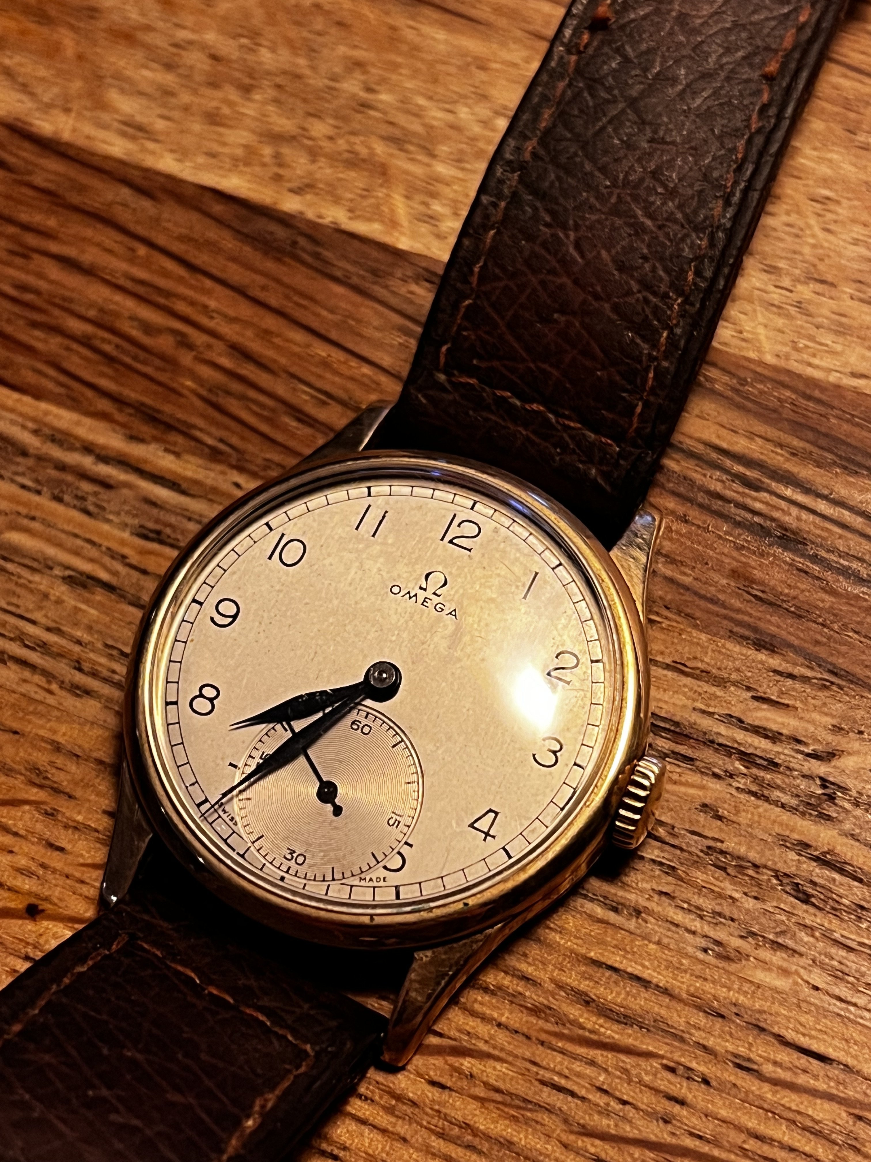 I’ve got an Omega watch which as far as I can tell from the serial no. is from 1939. Apart from that I can’t find any more info. It could even be fake! I have attached photos of the face, movement and inside of the case. Any info would be greatly appreciated!