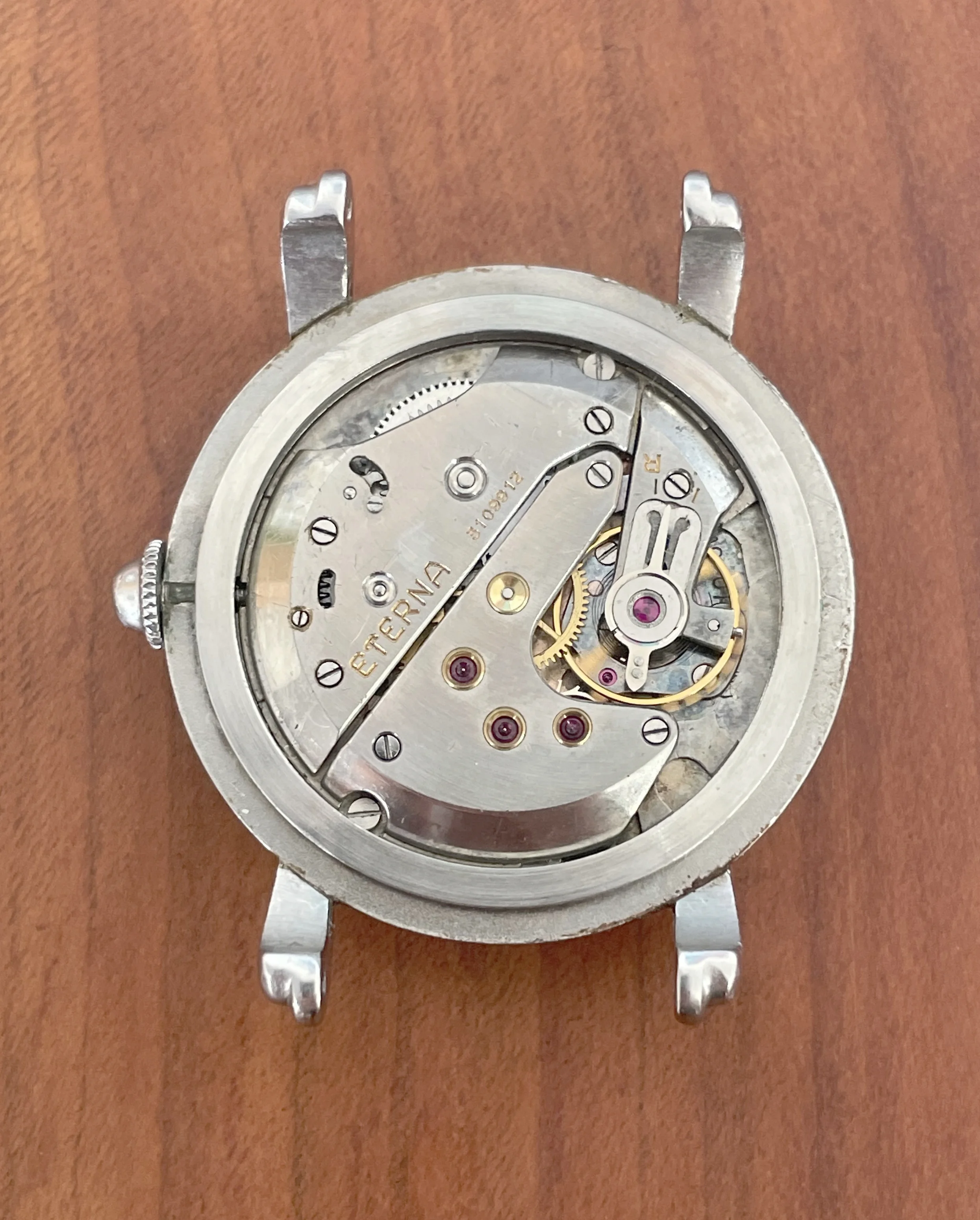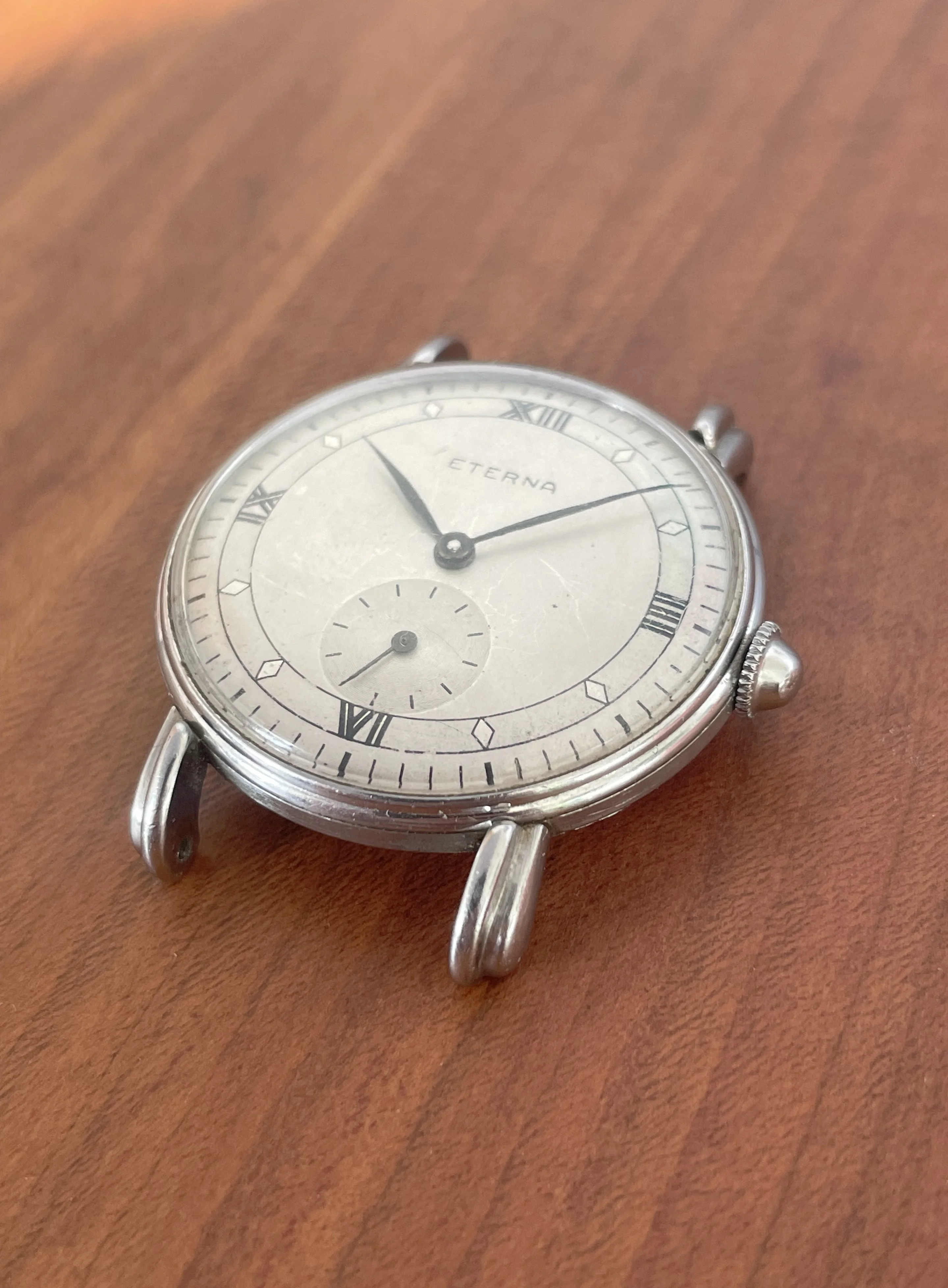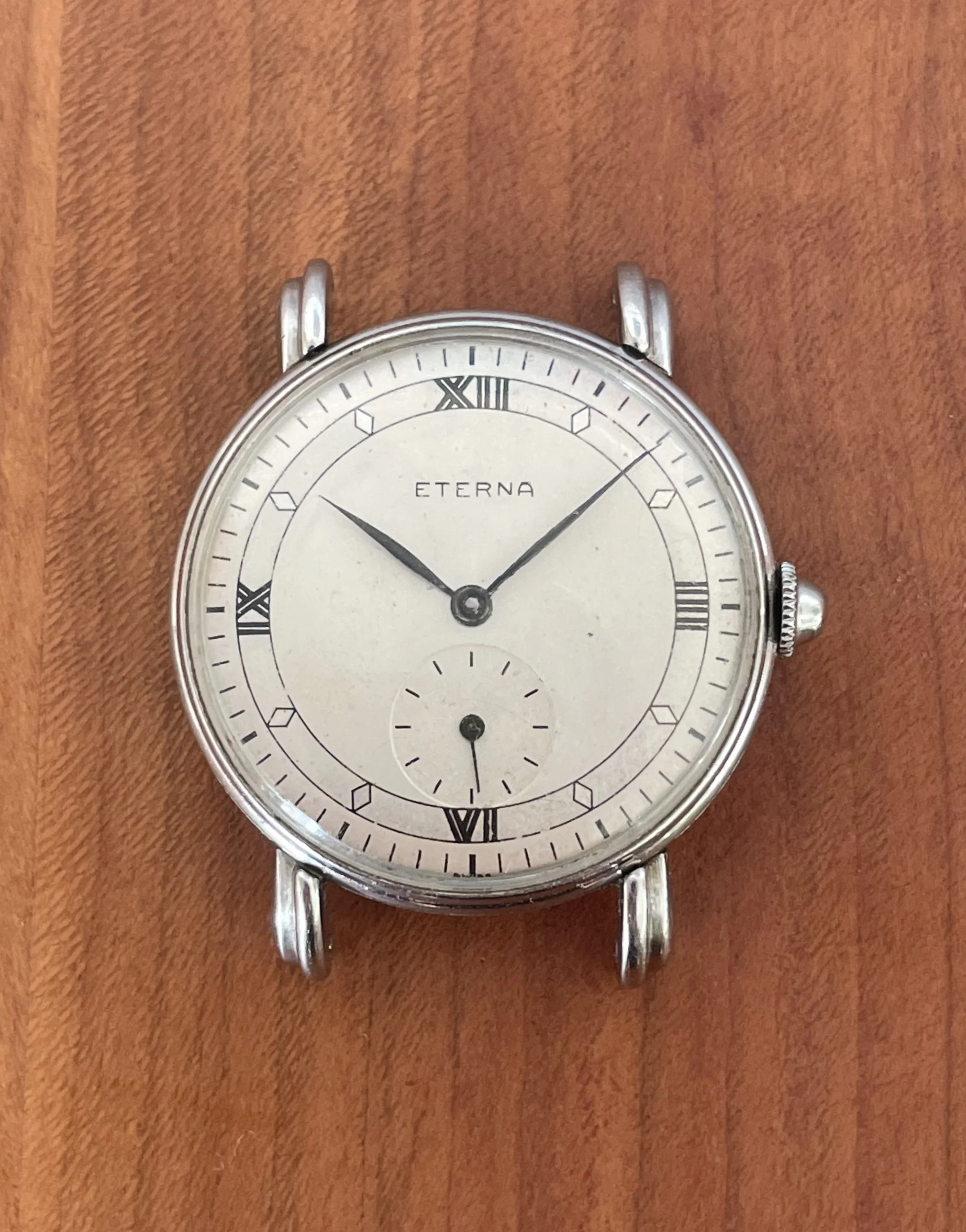 Posts 258 Likes 554 Tohz ·Feb 21, 2025 For sale is this 1940s Eterna with a fancy case and a nice dial design. Case: 33mm stainless steel case with stepped lugs. Dial: Silver dial with Roman numerals Movement: Cal. 1020 manual wind. Service history is unknown Price: €340 or best offer + shipping I'm located in Austria. Edited: Mar 2, 2025