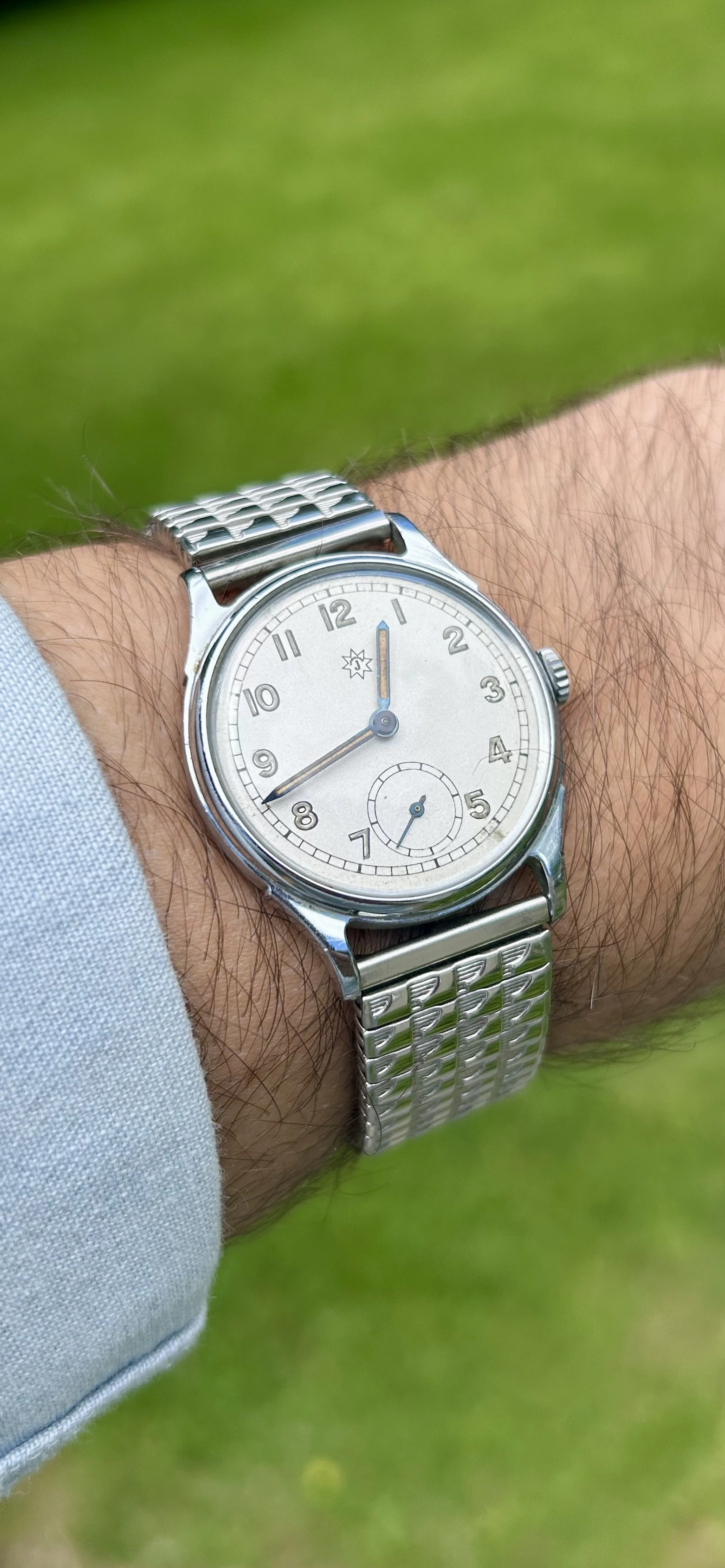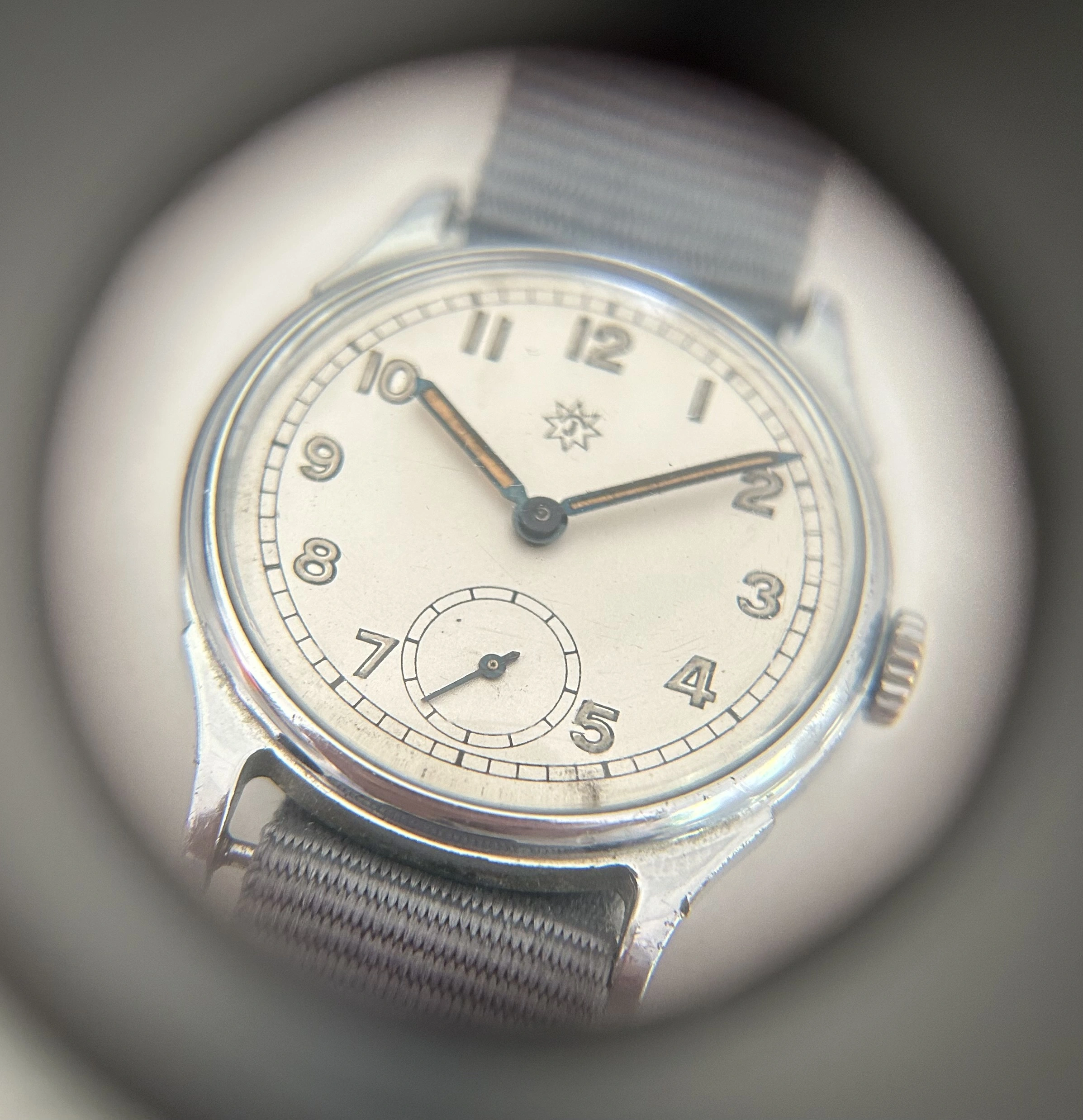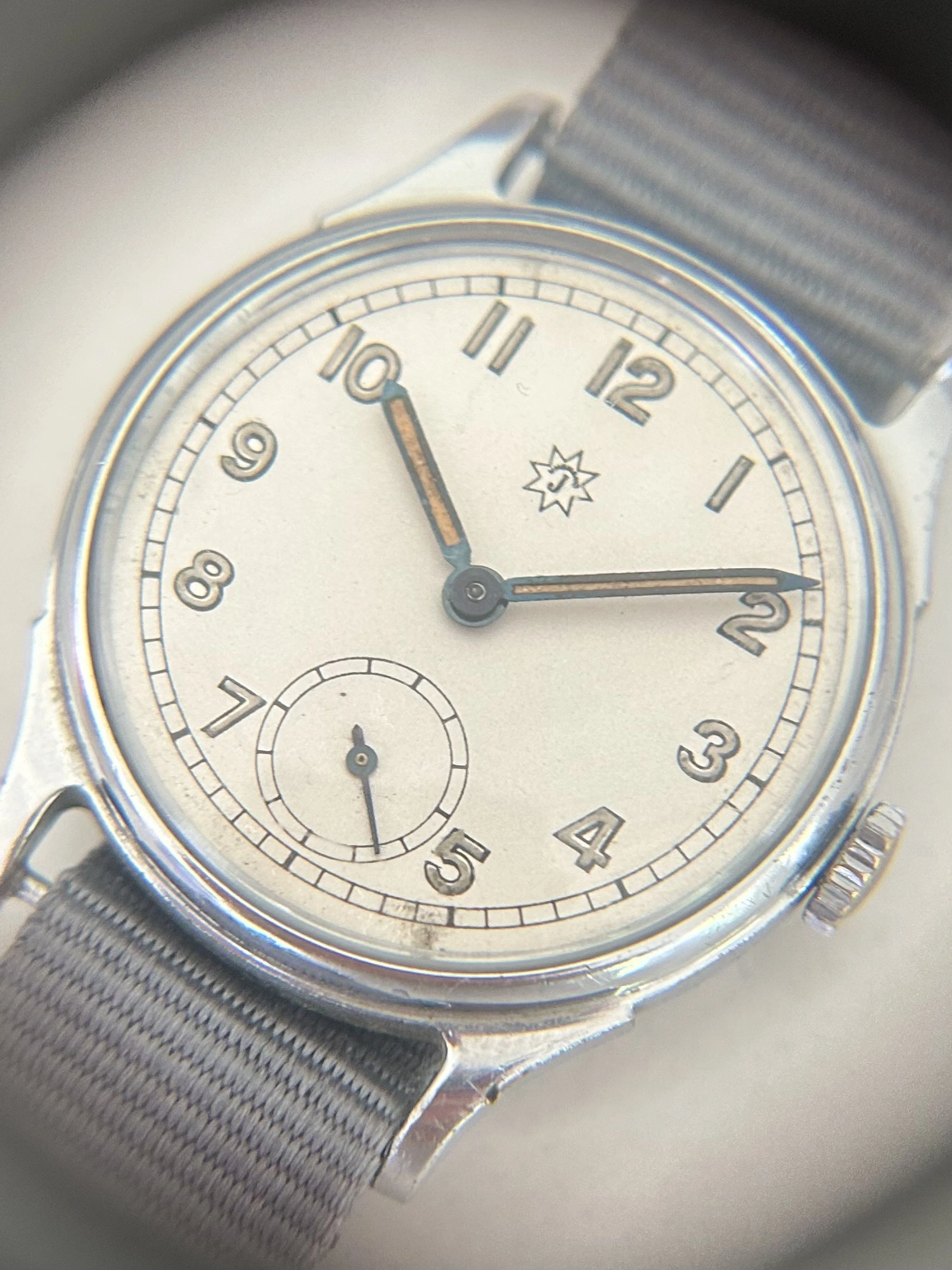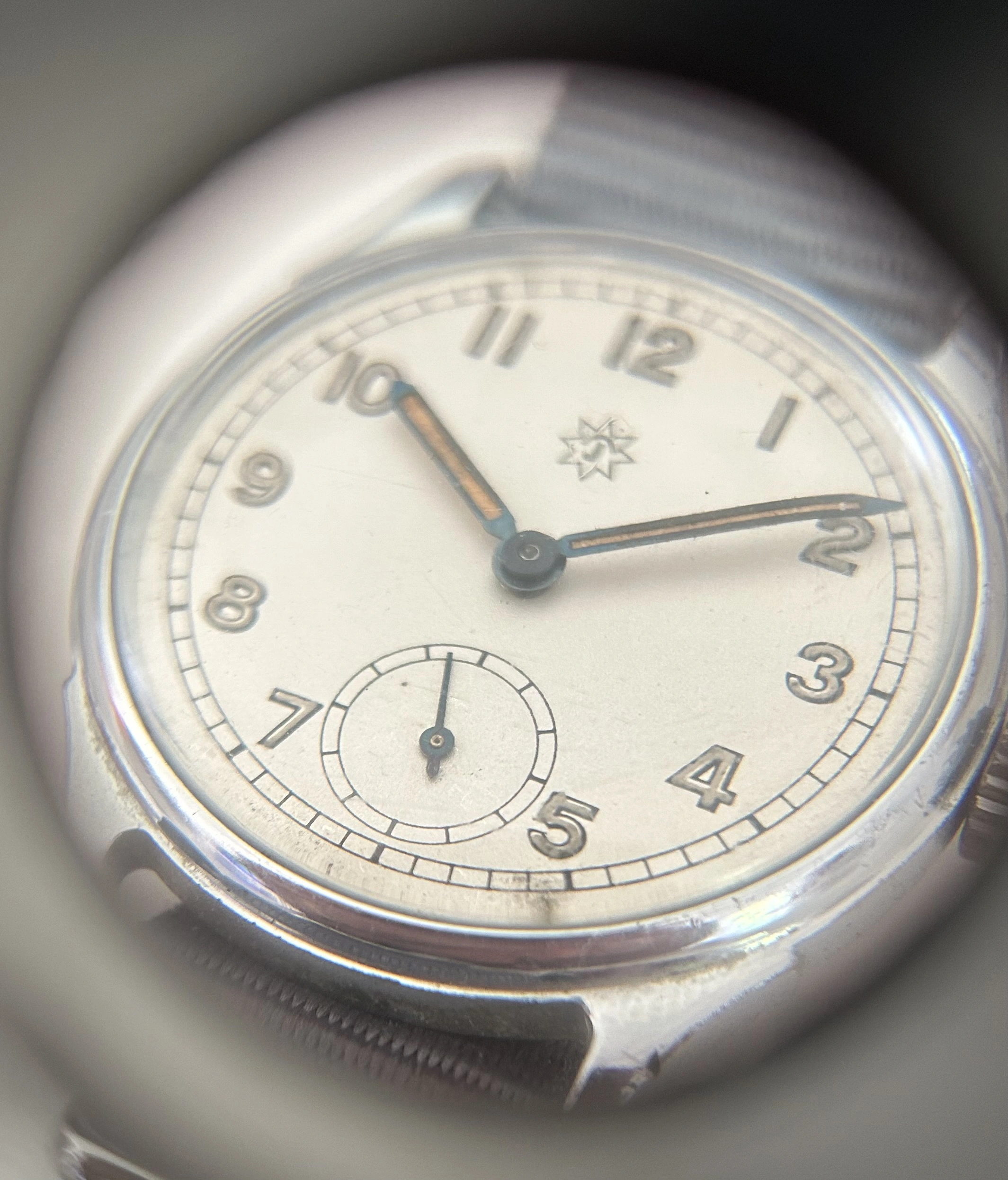 The hands are heat-blued steel, lume-filled, with a stunning warm orange tone that catches light beautifully - all matching and aged evenly. It’s signed with the correct Junghans 8-pointed star, period-accurate and well-centered.