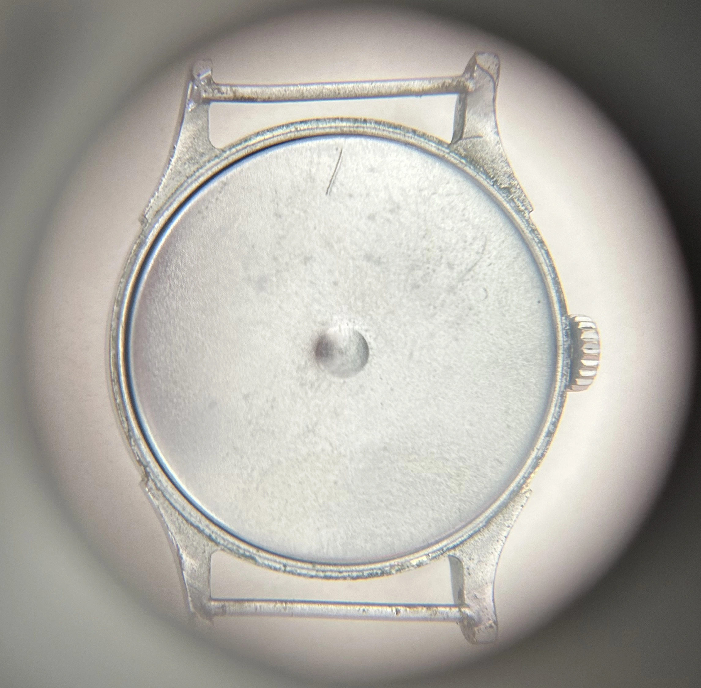 34mm chrome-plated case that remains crisp and unpolished. Edges are sharp, lugs clean, and plating is remarkably intact - no corrosion or pitting to note.