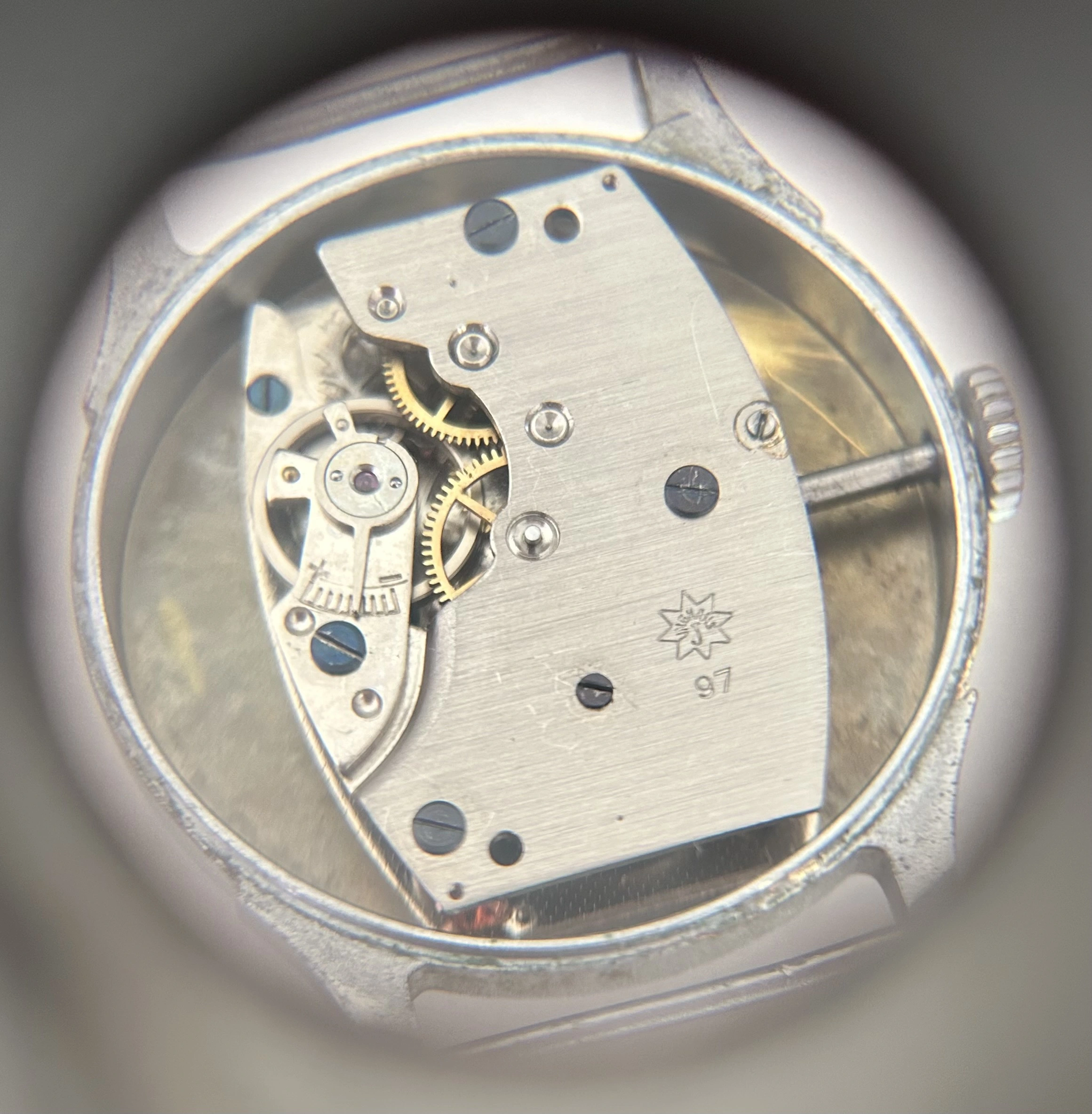 Inside beats the Junghans J97, a proprietary 15-jewel hand-wound movement developed in the 1940s and protected by its original dust cover. The caliber features small seconds at 6, a traditional flat hairspring, and runs at 18,000 bph. It winds smoothly and keeps time well. No service under my ownership, but it has proven reliable on the wrist.