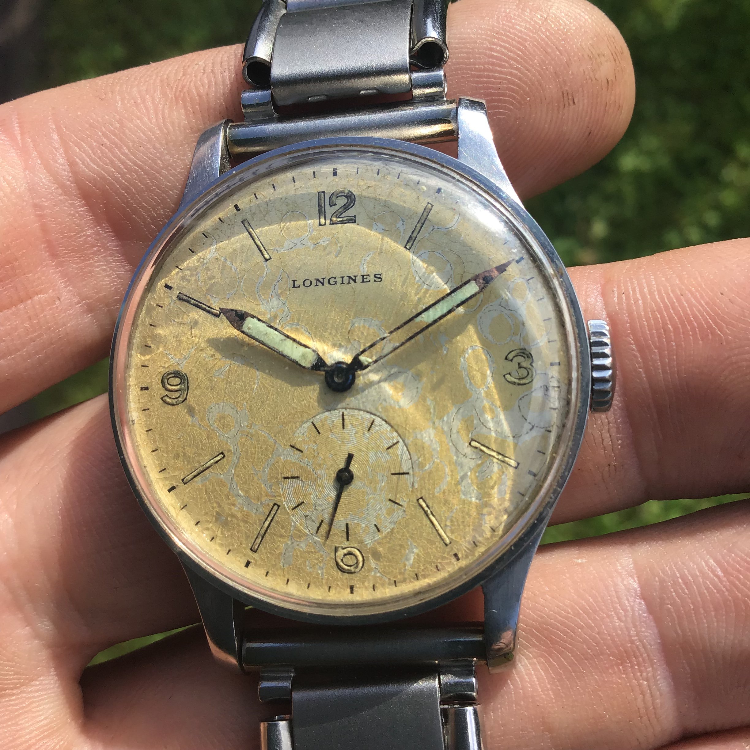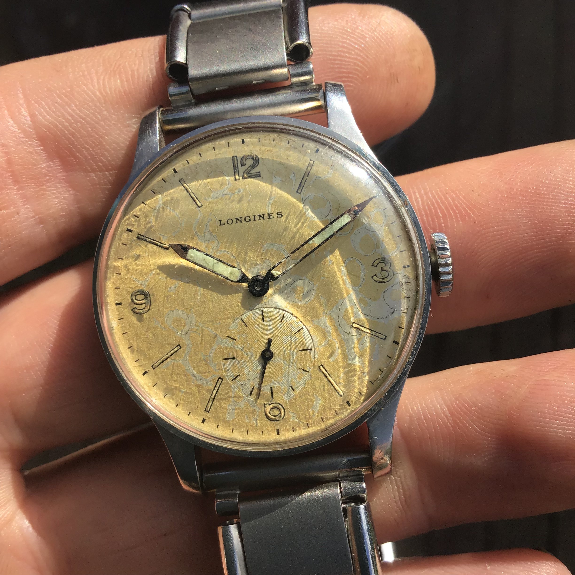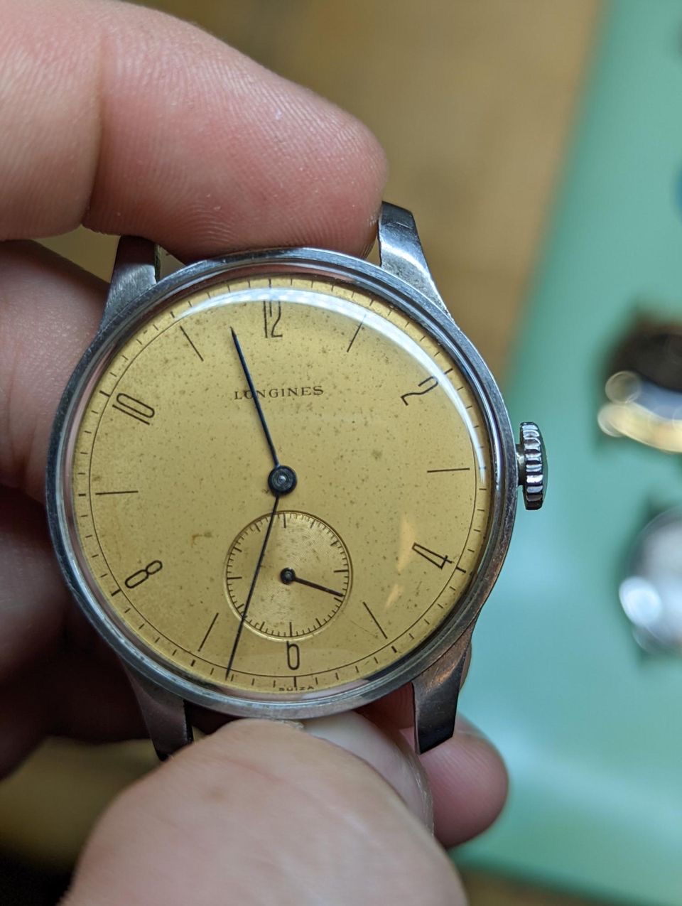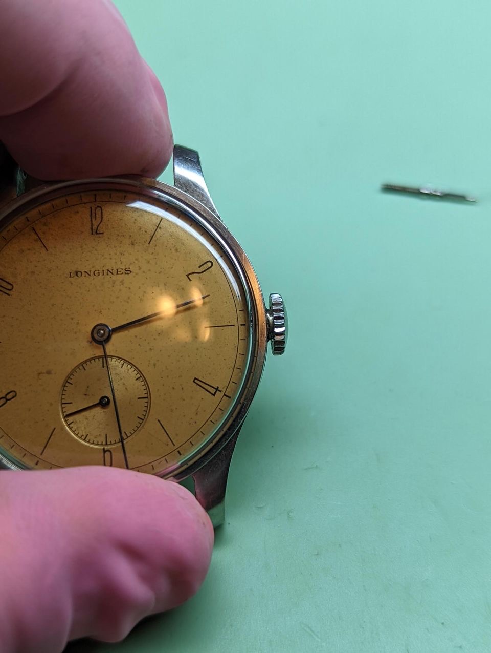 ·My watchmaker is wrapping up service of the 12.68z in the below 35mm 5056 ref Longines. As you can see, the crown protrudes from the case more than I would expect, but he doesn’t see anything amiss - all looks original as far as he can tell.