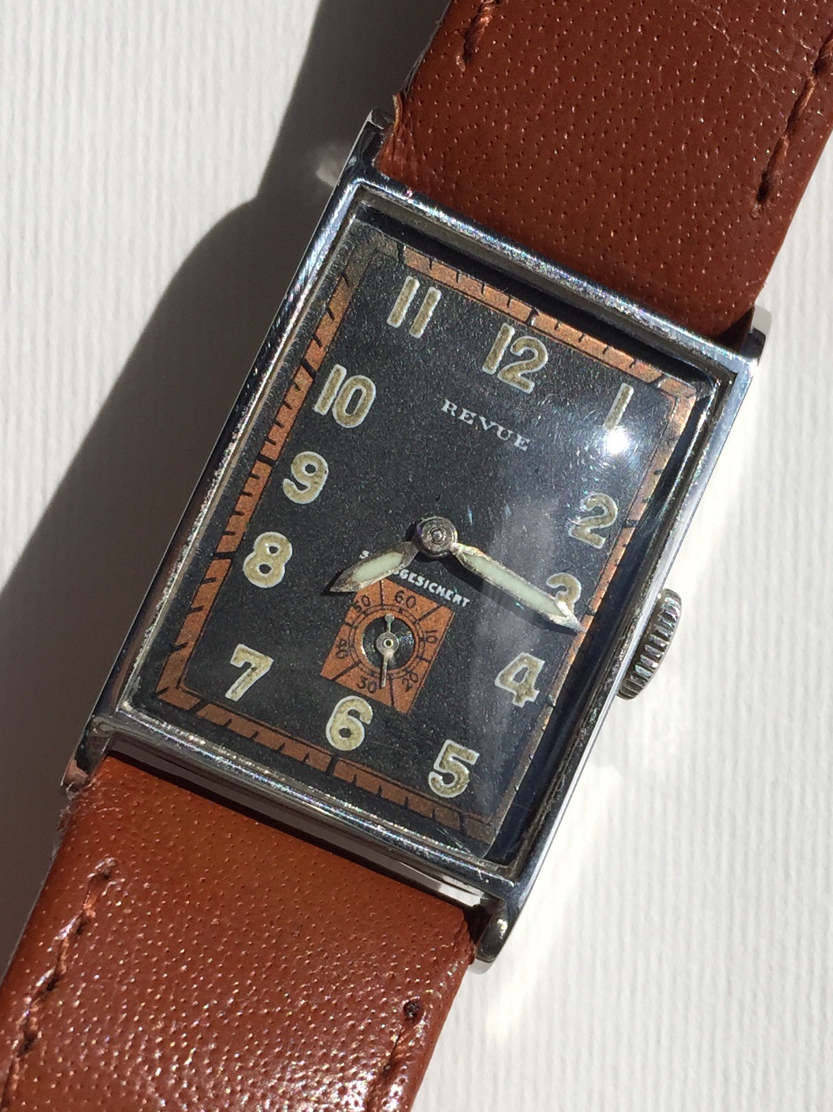 This rectangular Revue is 22.5mm wide-38mm lug to lug and with a substantial presence on a midsize man’s wrist.