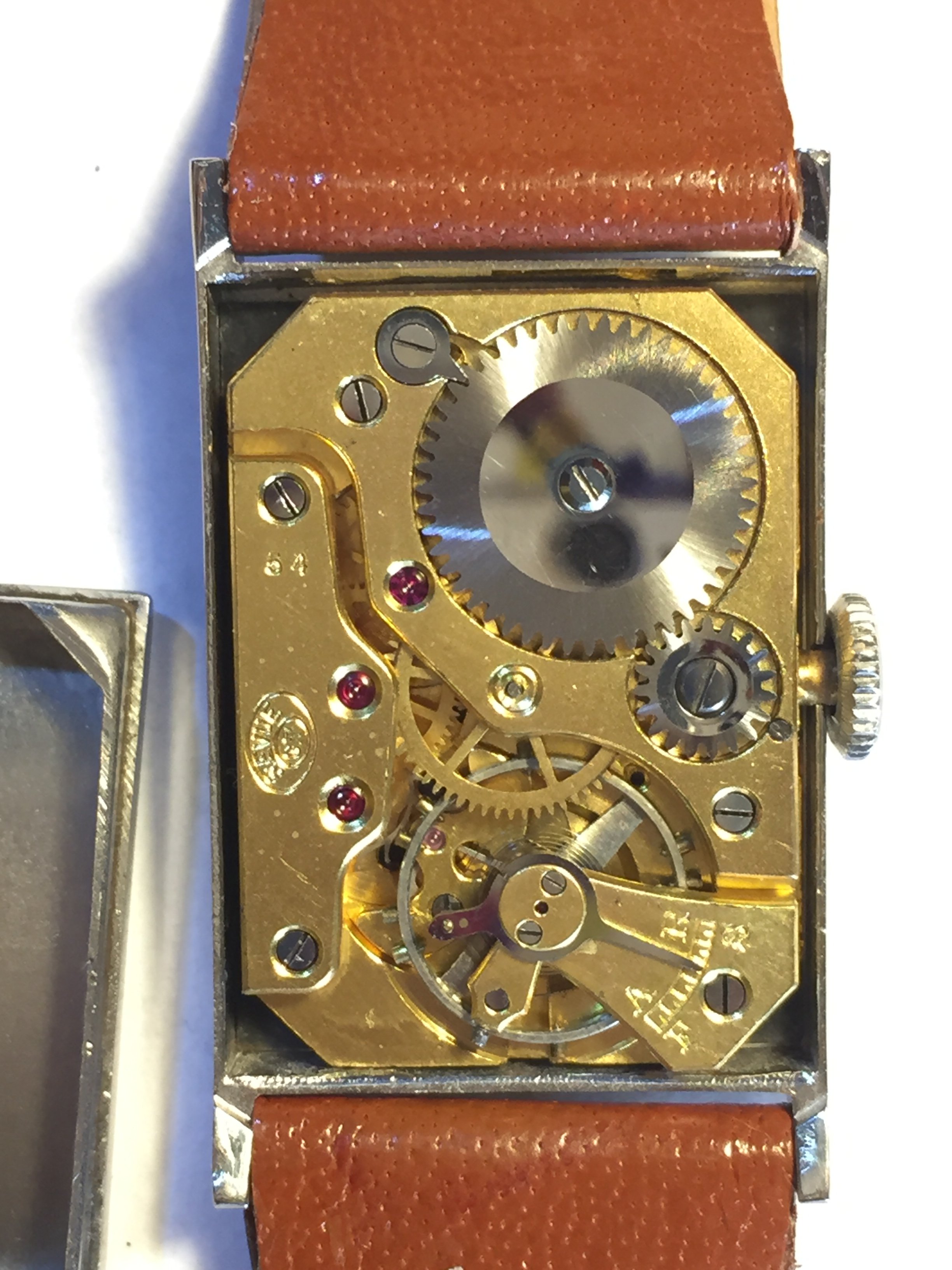 -Unusual art deco era dial with beautiful copper color detail and the word “shock protection” inscribed in German.