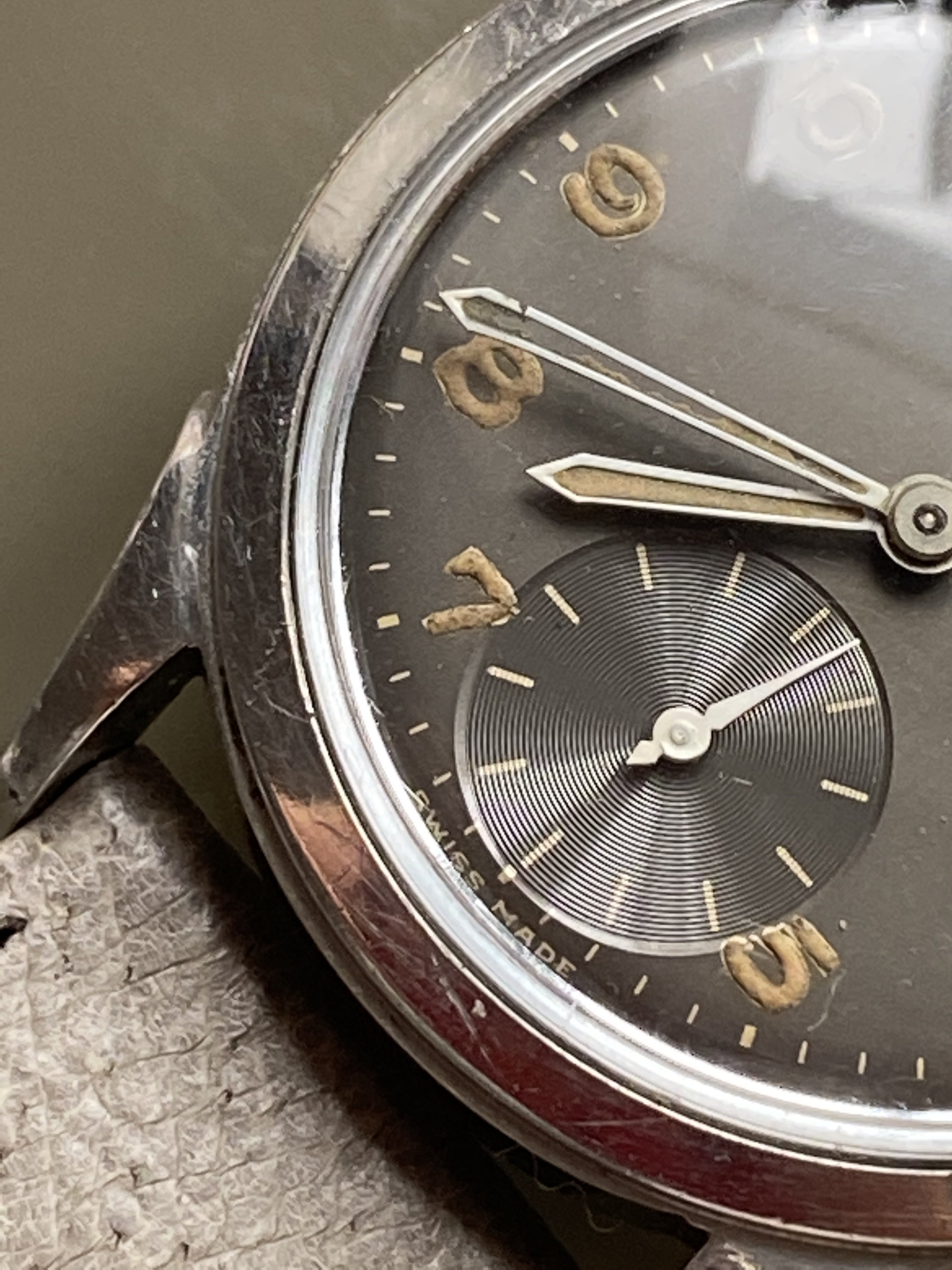 -its distinctive and beautiful glossy gray dial with original lume which has turned to a soft caramel color;
