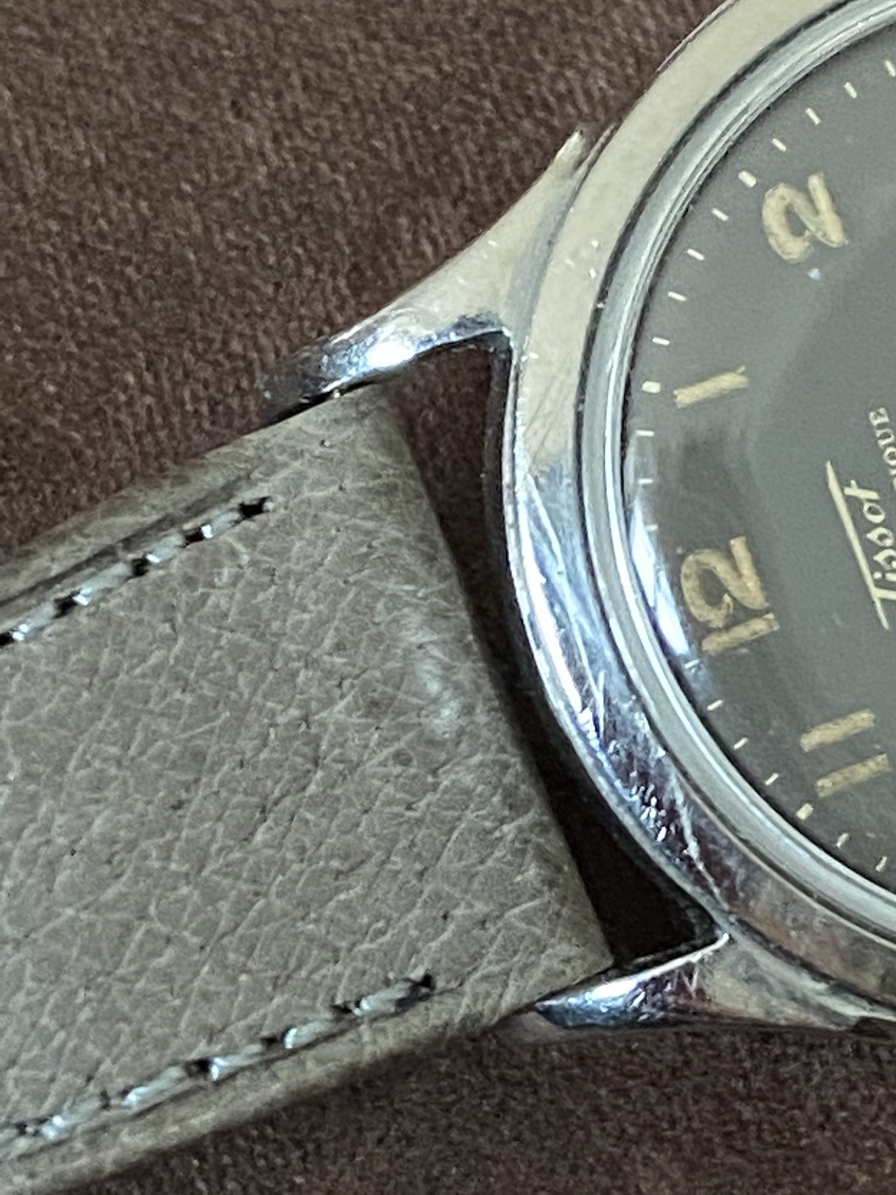 -its distinctive and beautiful glossy gray dial with original lume which has turned to a soft caramel color;