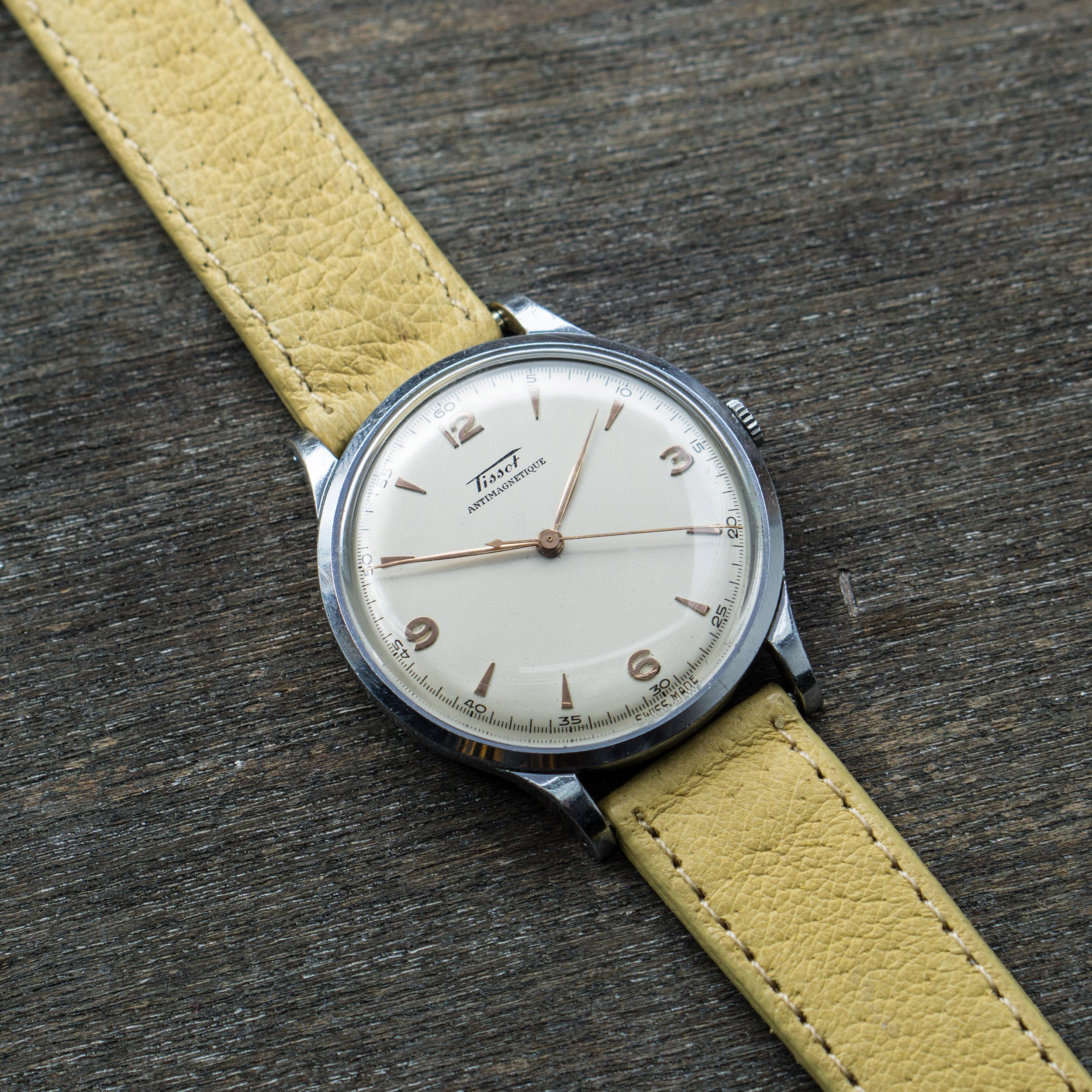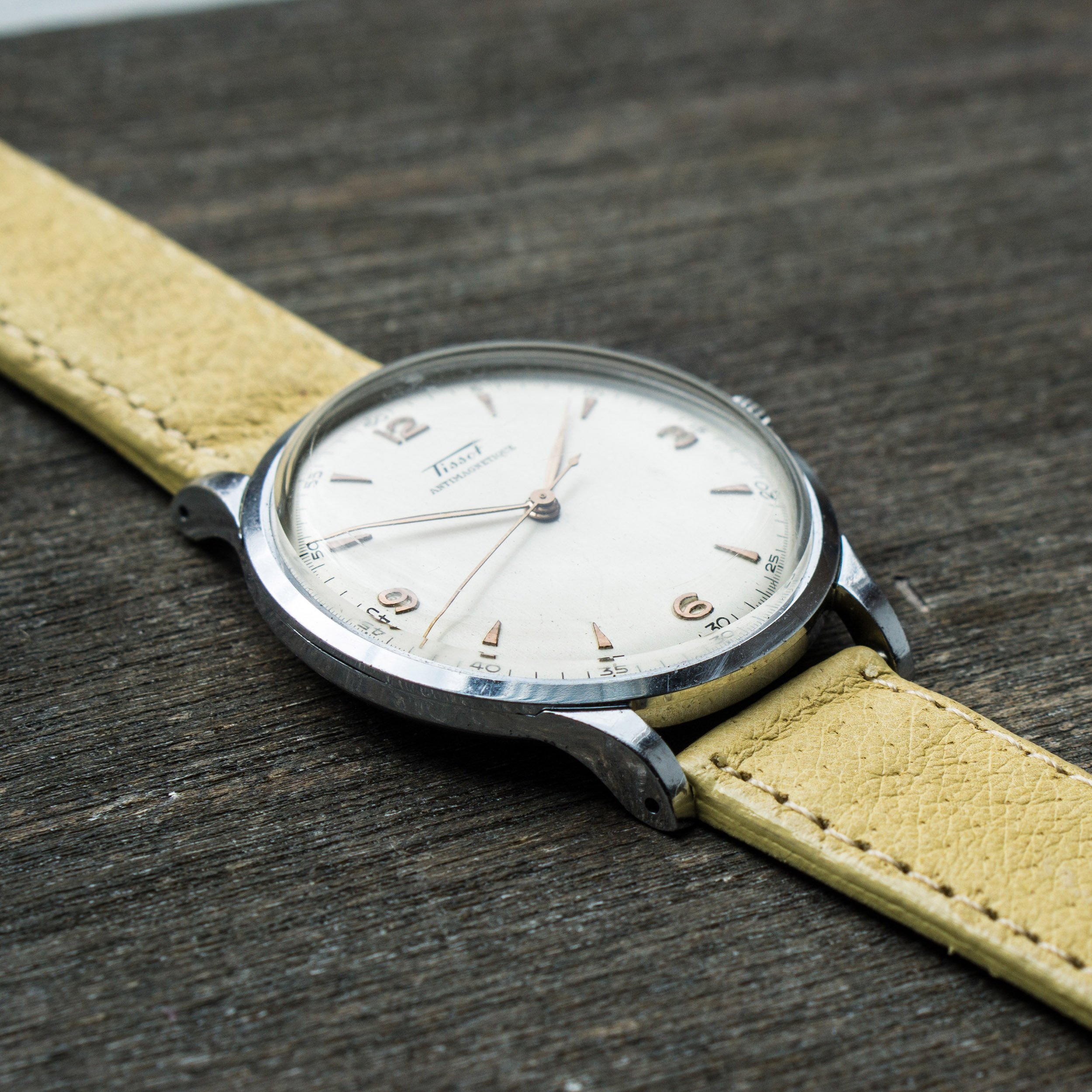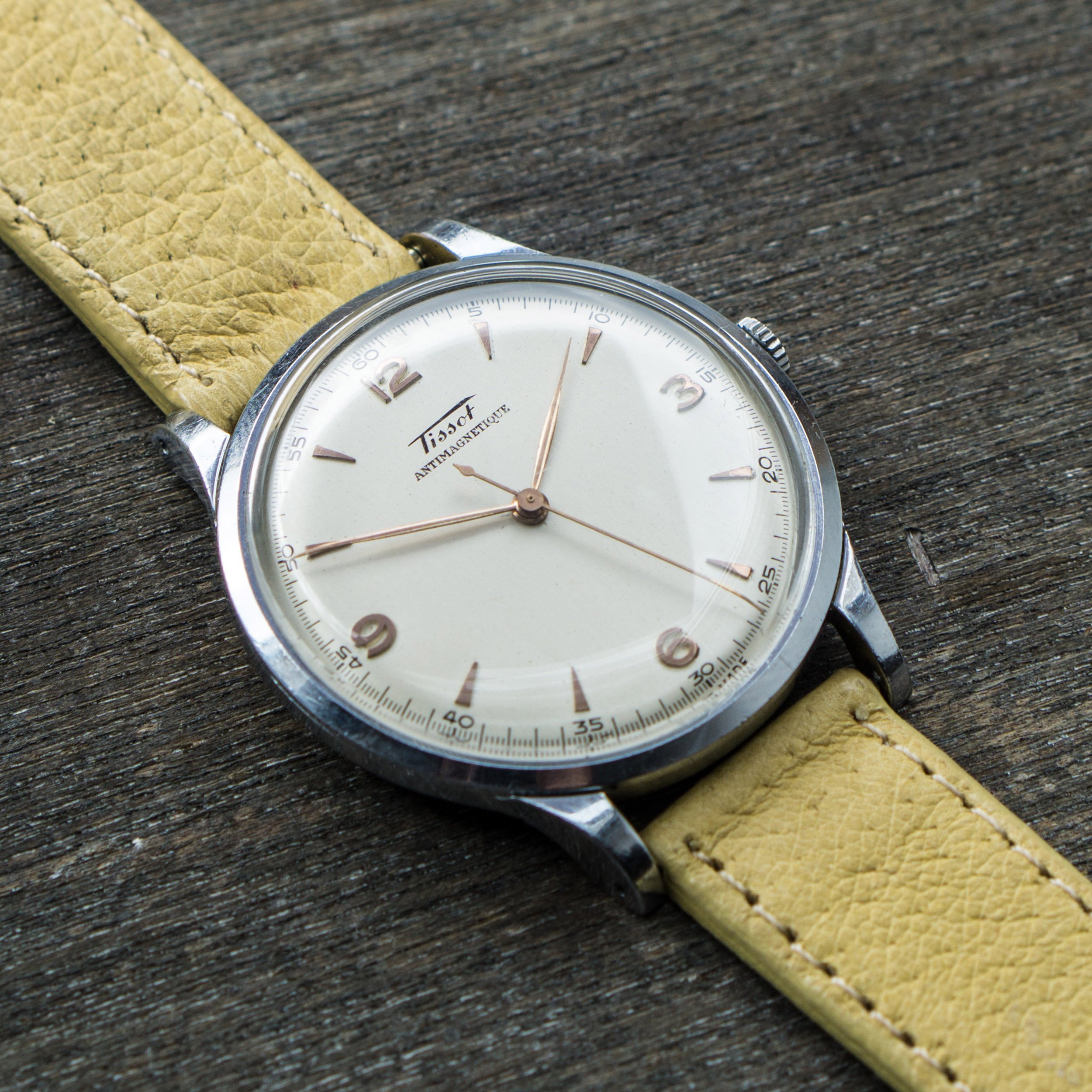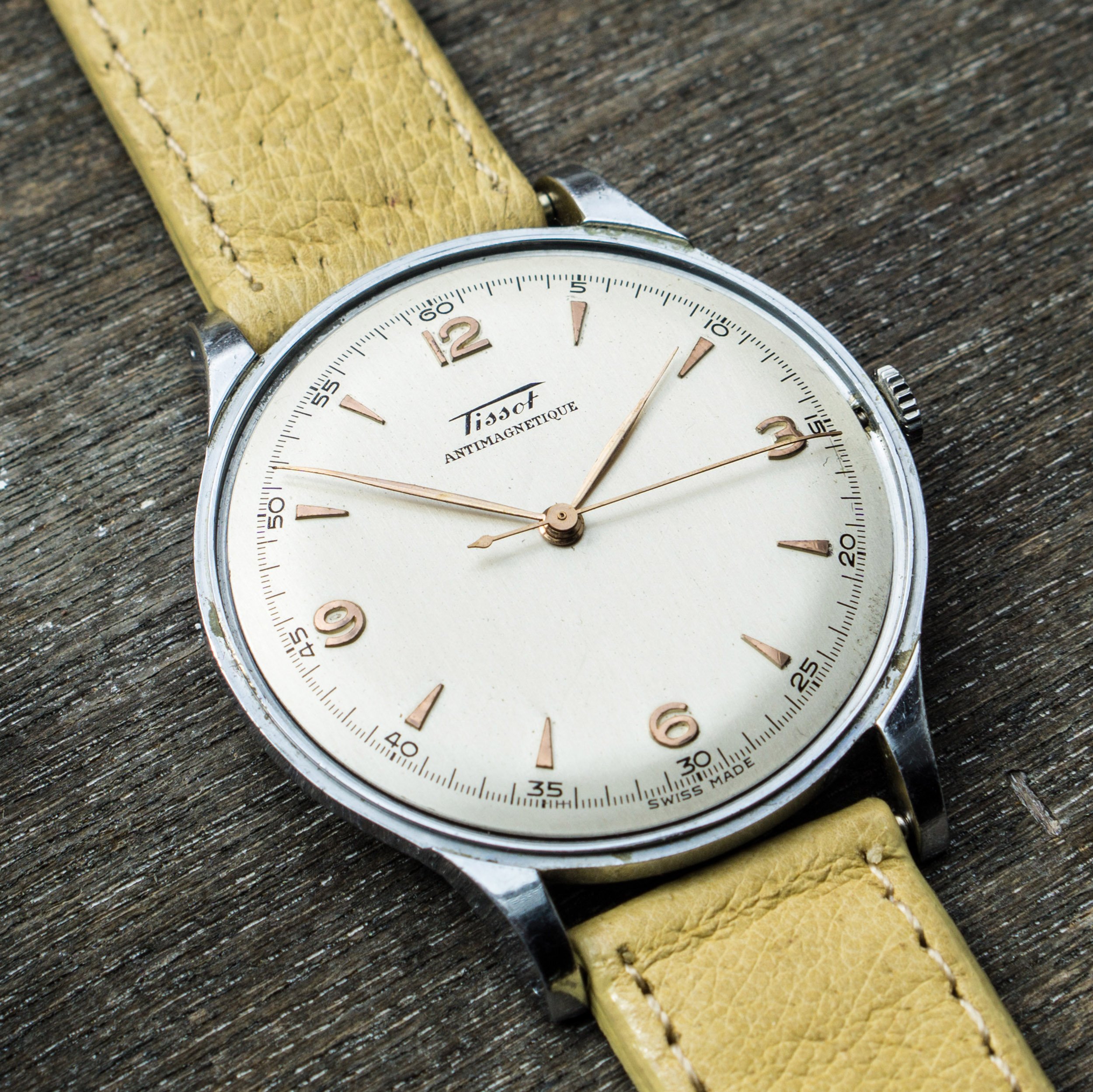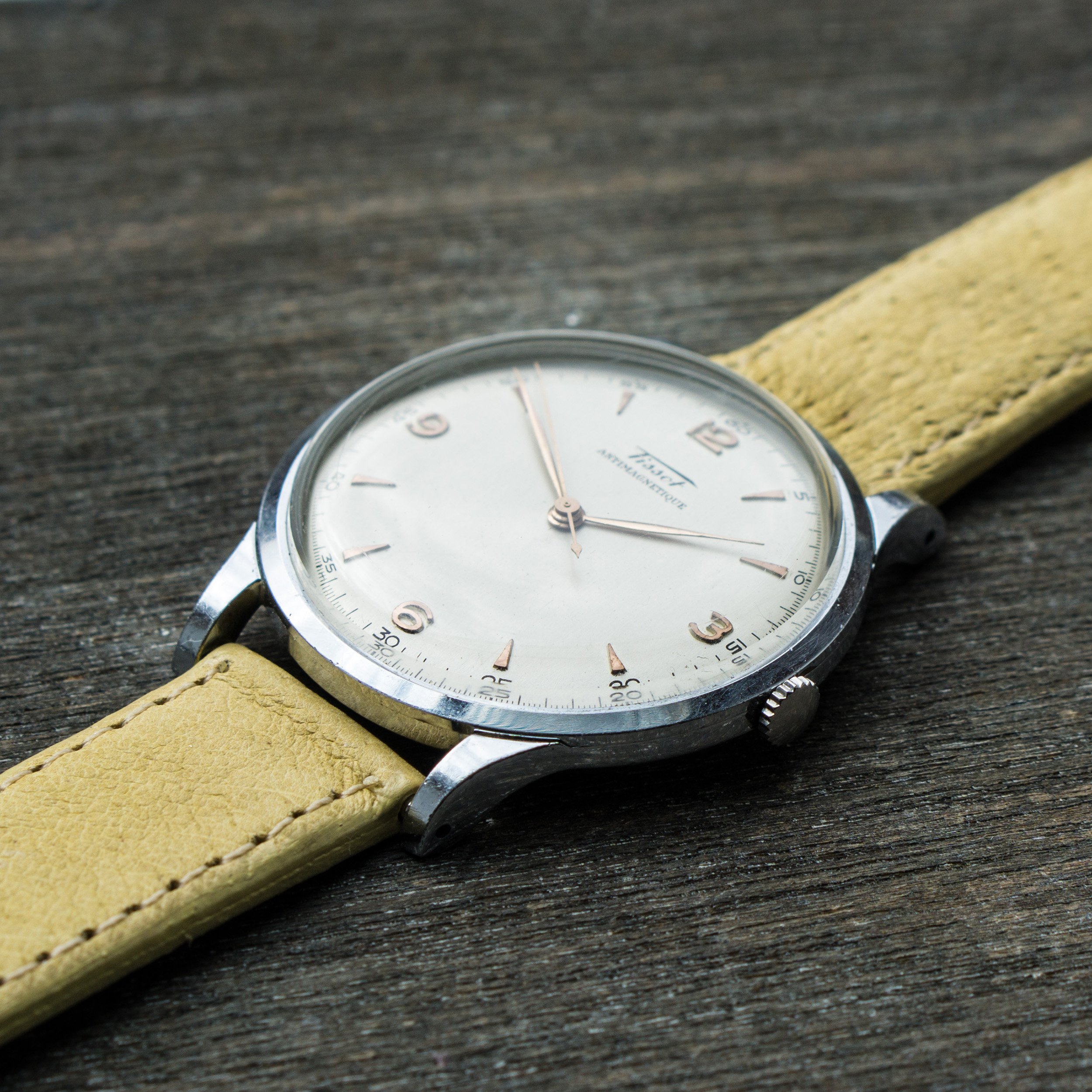 I am selling this nice 40s dresswatch made by Tissot. Cool thing is the size with 37,5mm which makes it super wearable even today. Second goodie is the great looking bright dial with rose gold markers. Lots of visual similarities to the Longines 5045.