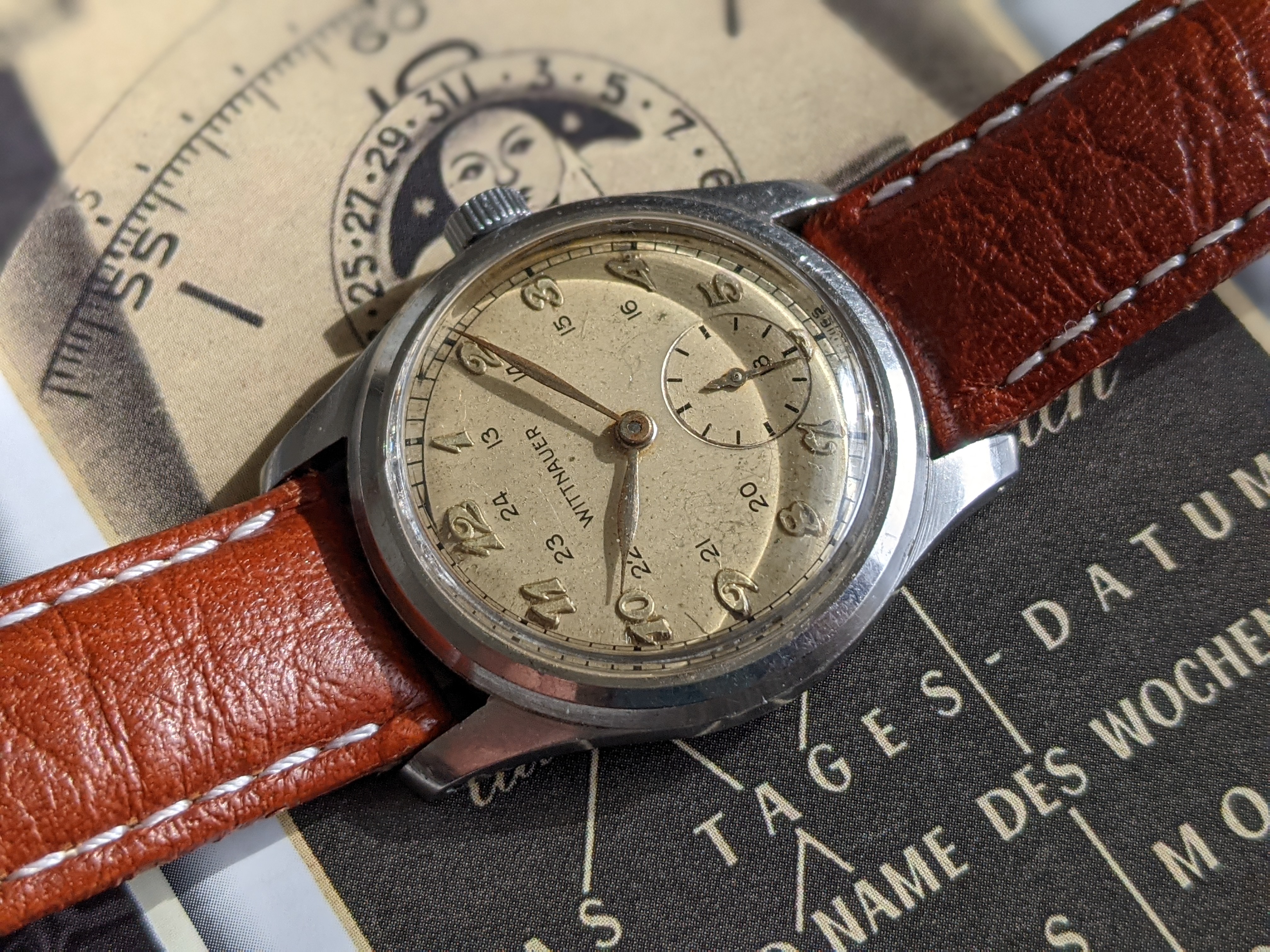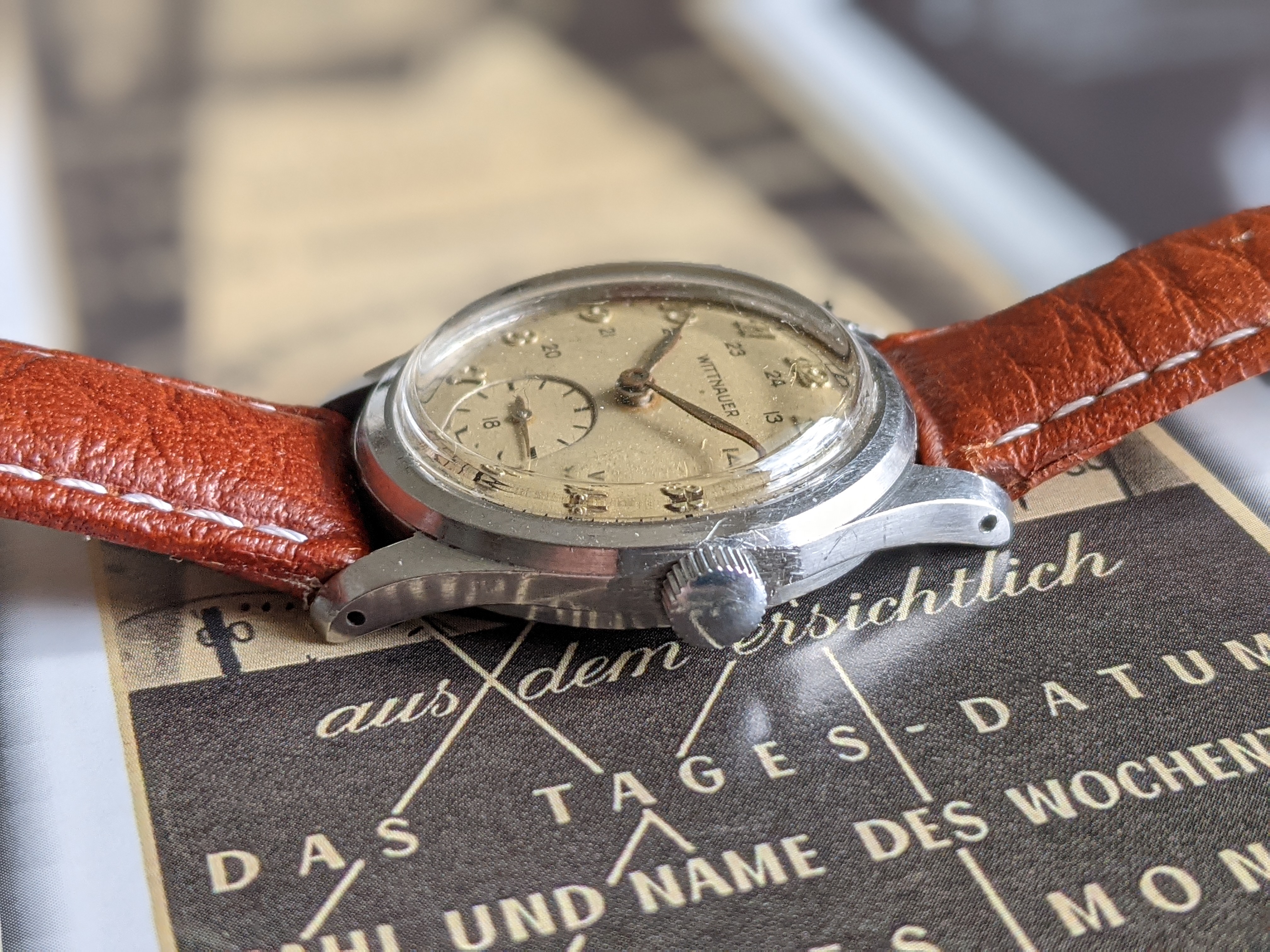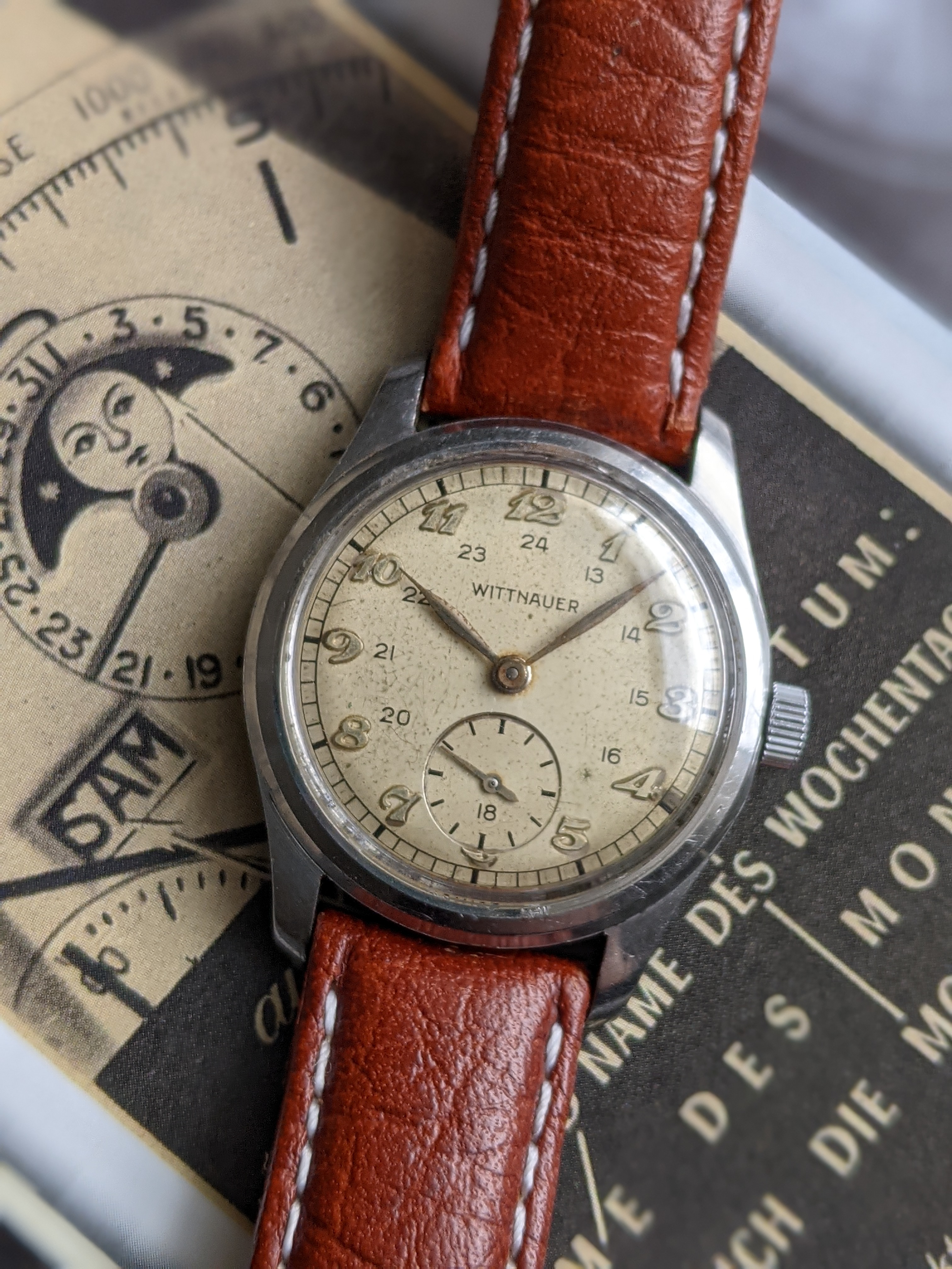 ·Here we have a 1940's Wittnauer military style watch, with Breguet style numerals. The stainless steel case measures 32mm in diameter, excluding the crown. Lug width is 17mm. It keeps great time, although it was not serviced while in my possession. I bought it from a local antique mall, which the seller put "serviced" on the tag. The dial is white, with a hint of silver, nice patina, and raised silver numerals. Case back screws on, and has a metal dust cover over the movement. I have it on a modern brown padded leather sport strap. I'm asking $325 or best offer for this vintage beauty. Please PM me for inquires.