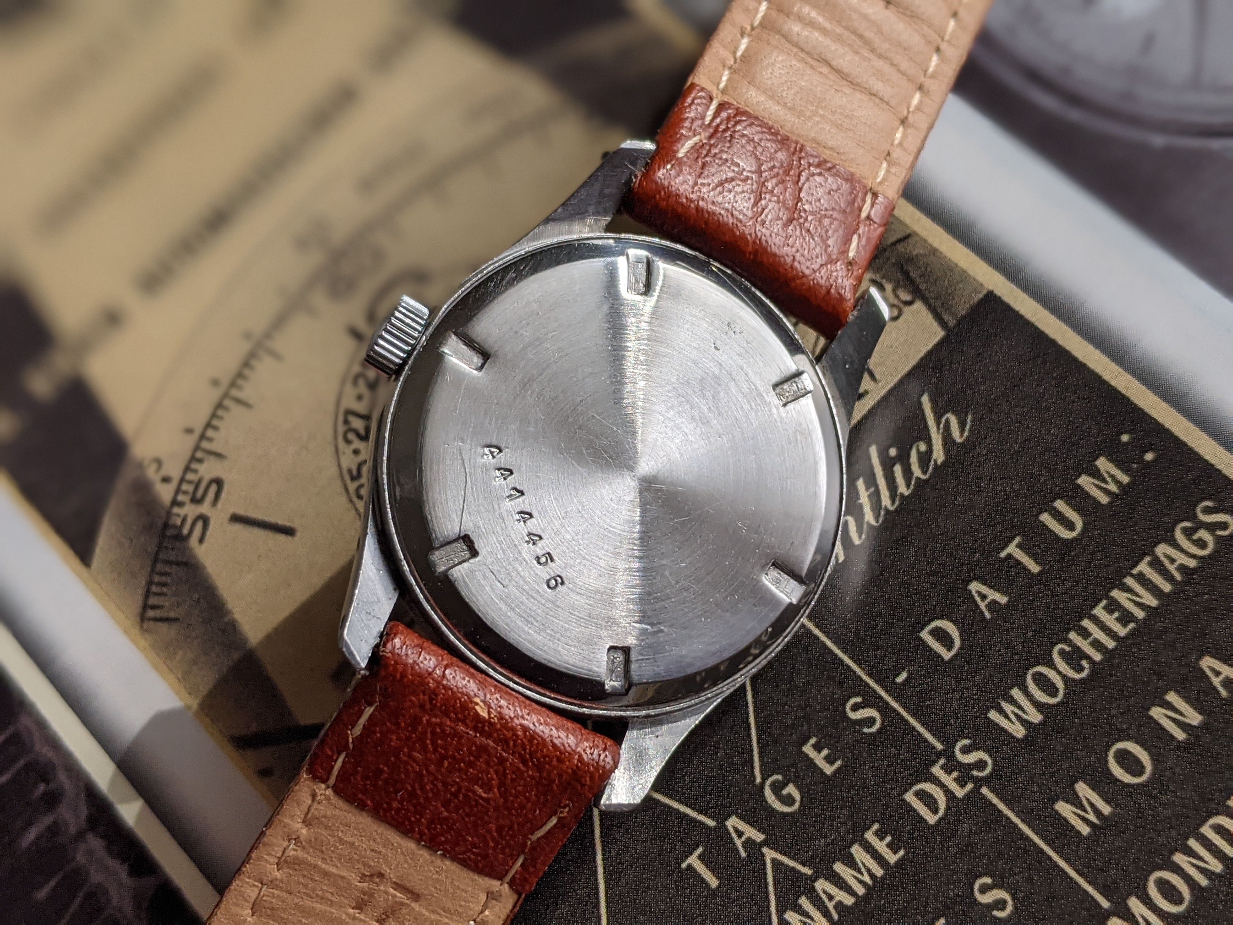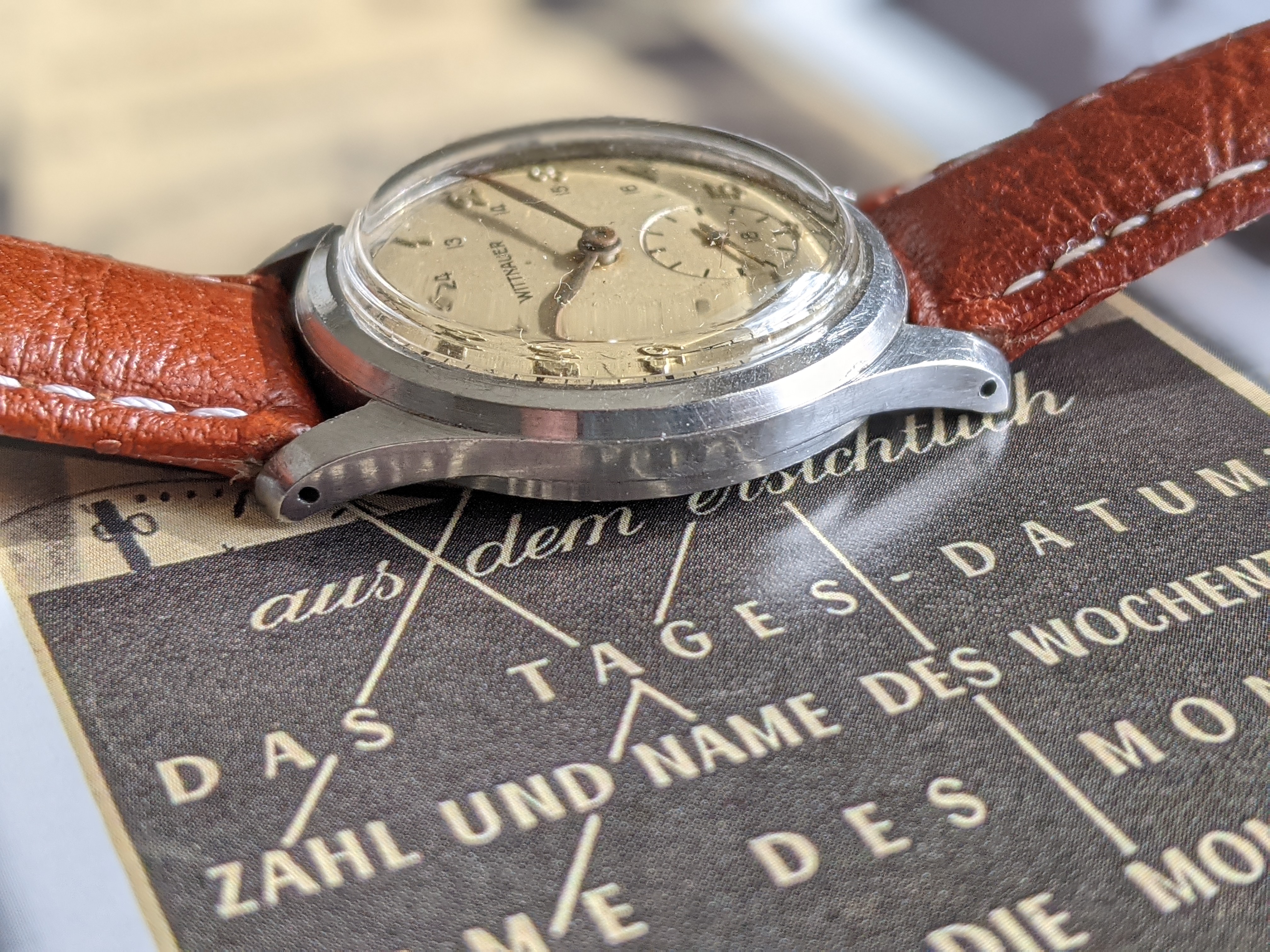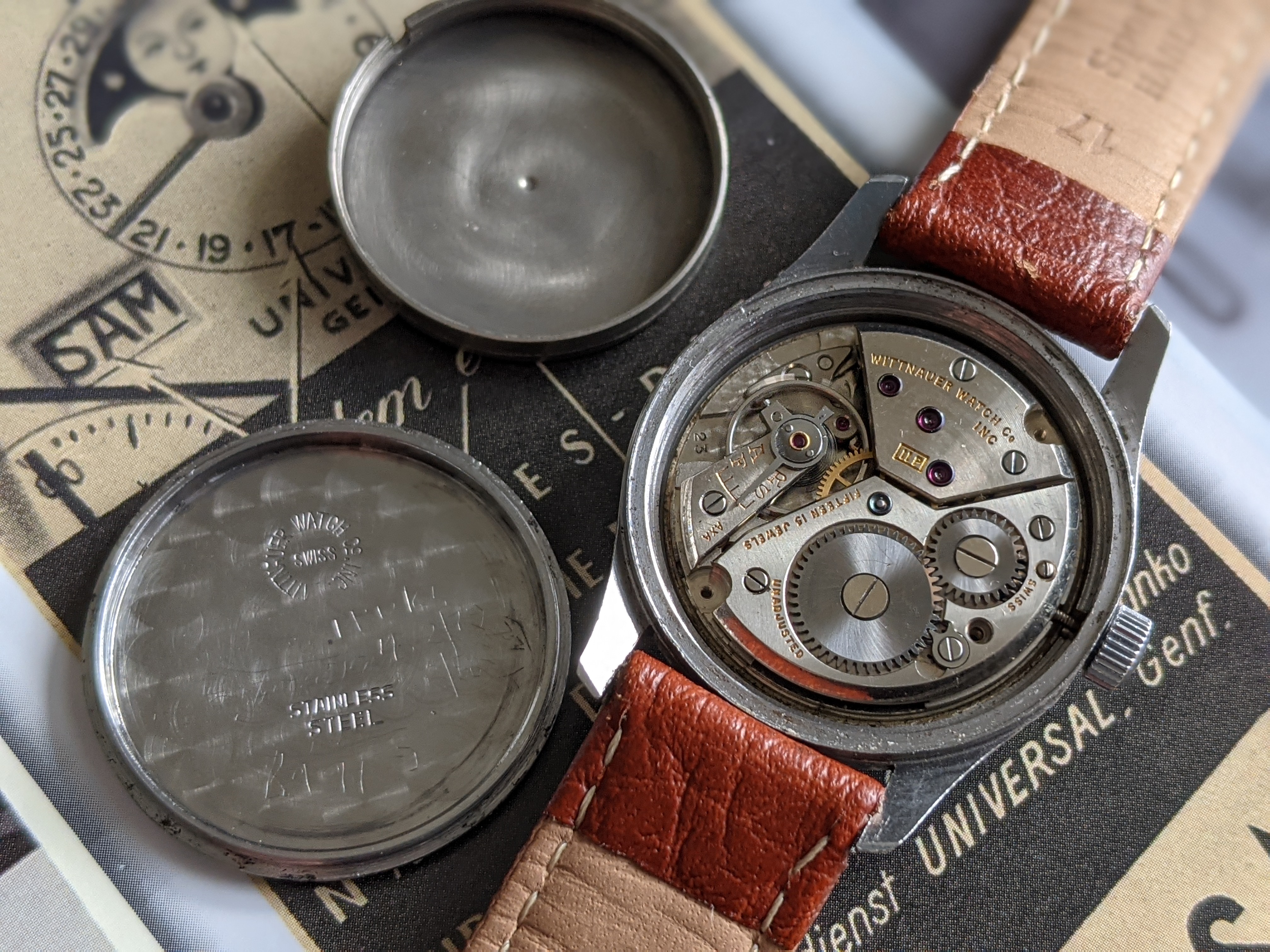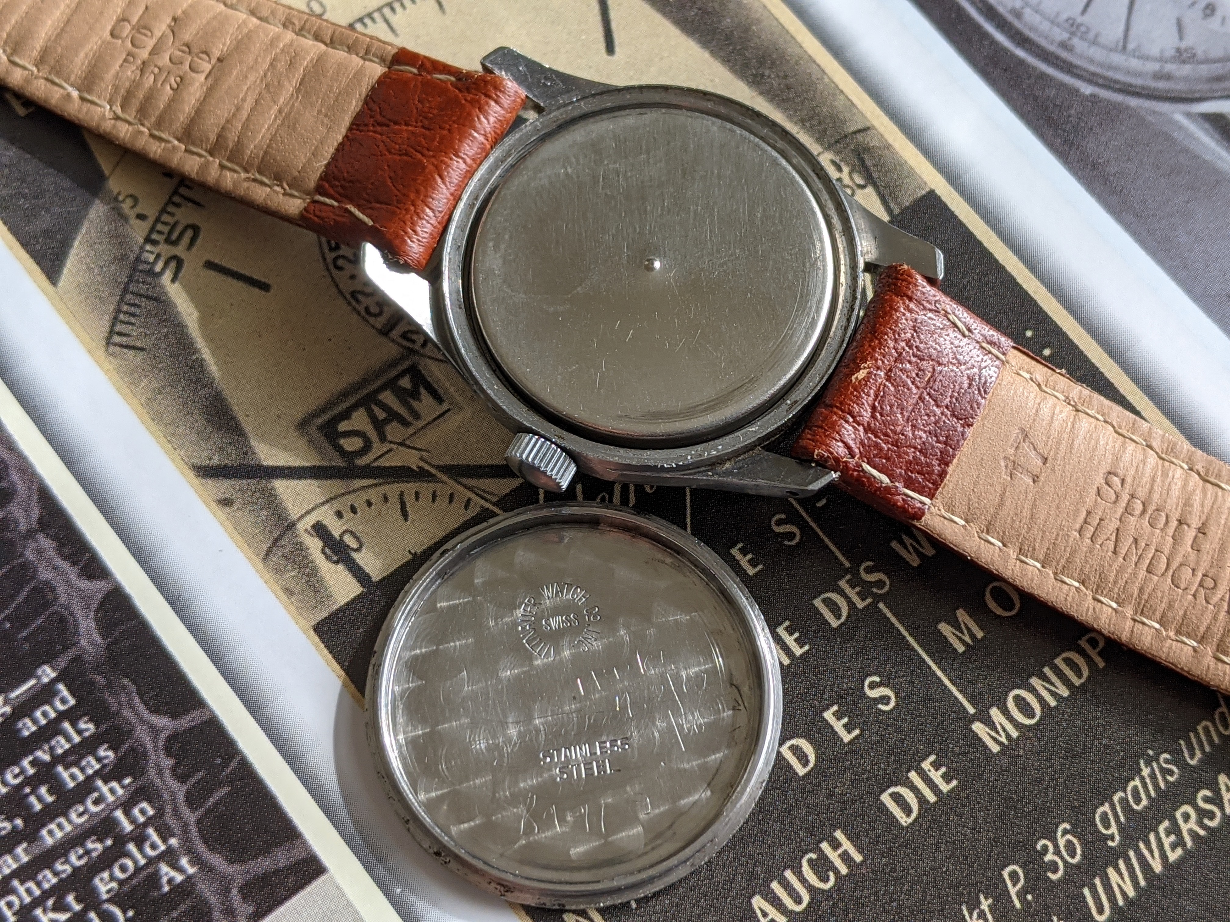 ·Here we have a 1940's Wittnauer military style watch, with Breguet style numerals. The stainless steel case measures 32mm in diameter, excluding the crown. Lug width is 17mm. It keeps great time, although it was not serviced while in my possession. I bought it from a local antique mall, which the seller put "serviced" on the tag. The dial is white, with a hint of silver, nice patina, and raised silver numerals. Case back screws on, and has a metal dust cover over the movement. I have it on a modern brown padded leather sport strap. I'm asking $325 or best offer for this vintage beauty. Please PM me for inquires.
