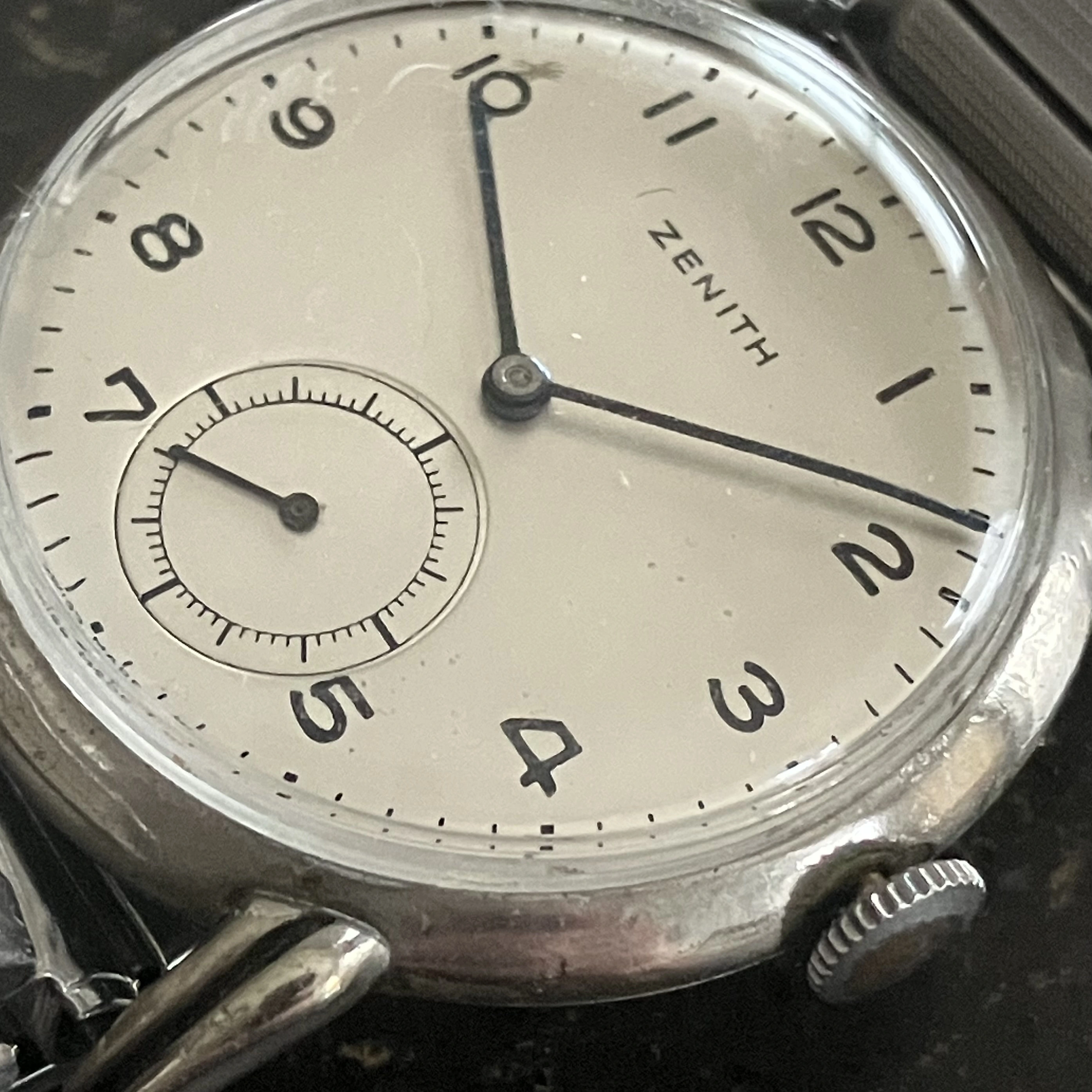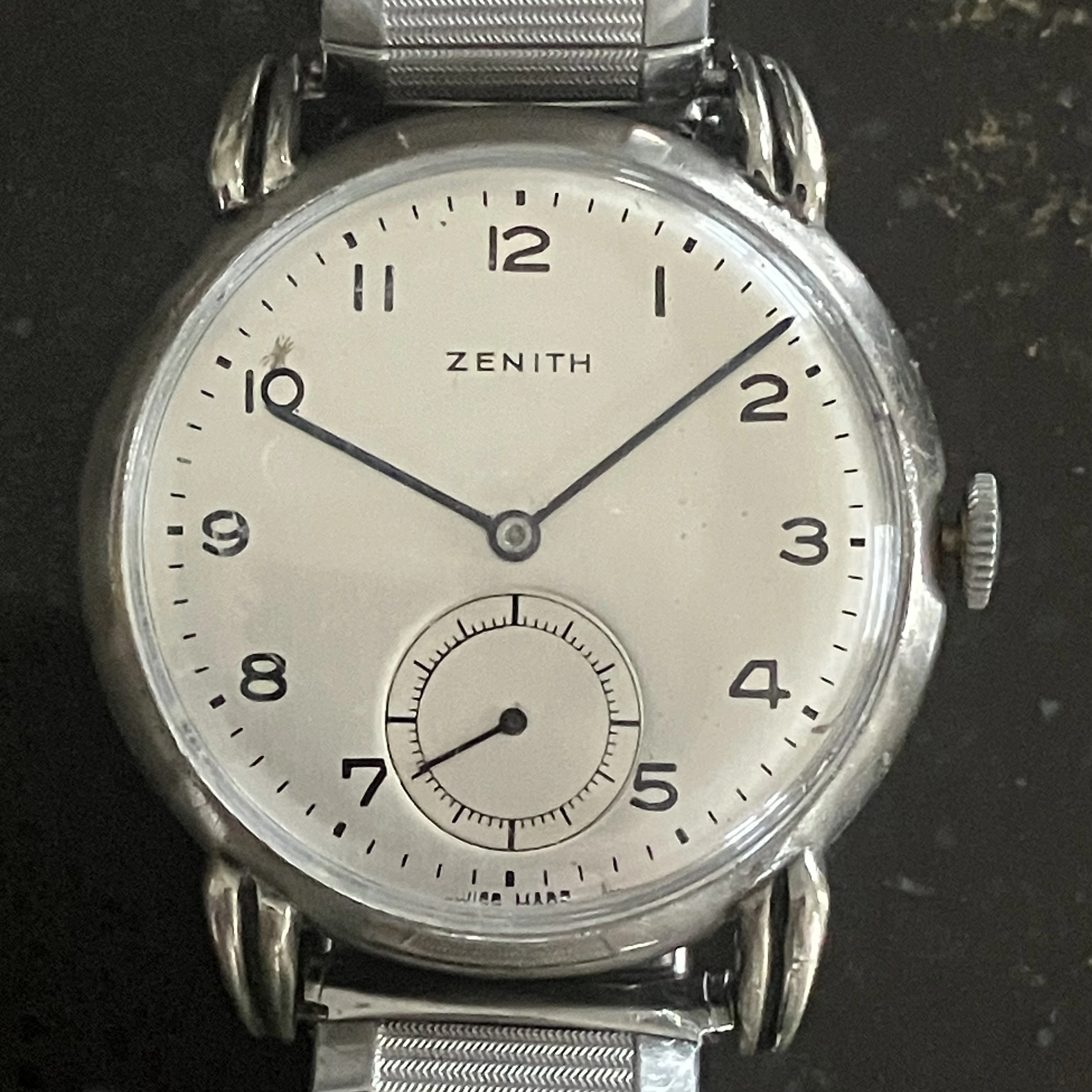 ·Post war Zenith 12-4P in stainless steel. Approximately 34mm in diameter. Good overall condition. There is micro crack in the caseback, see photo, but it still snaps tight. Runs well for an 80 year old watch. Obviously I cannot guarantee its accuracy and should be serviced for every day wear. A good starter piece for those interested in vintage Zenith. Please contact me with any questions. Free shipping in US. Thanks for looking