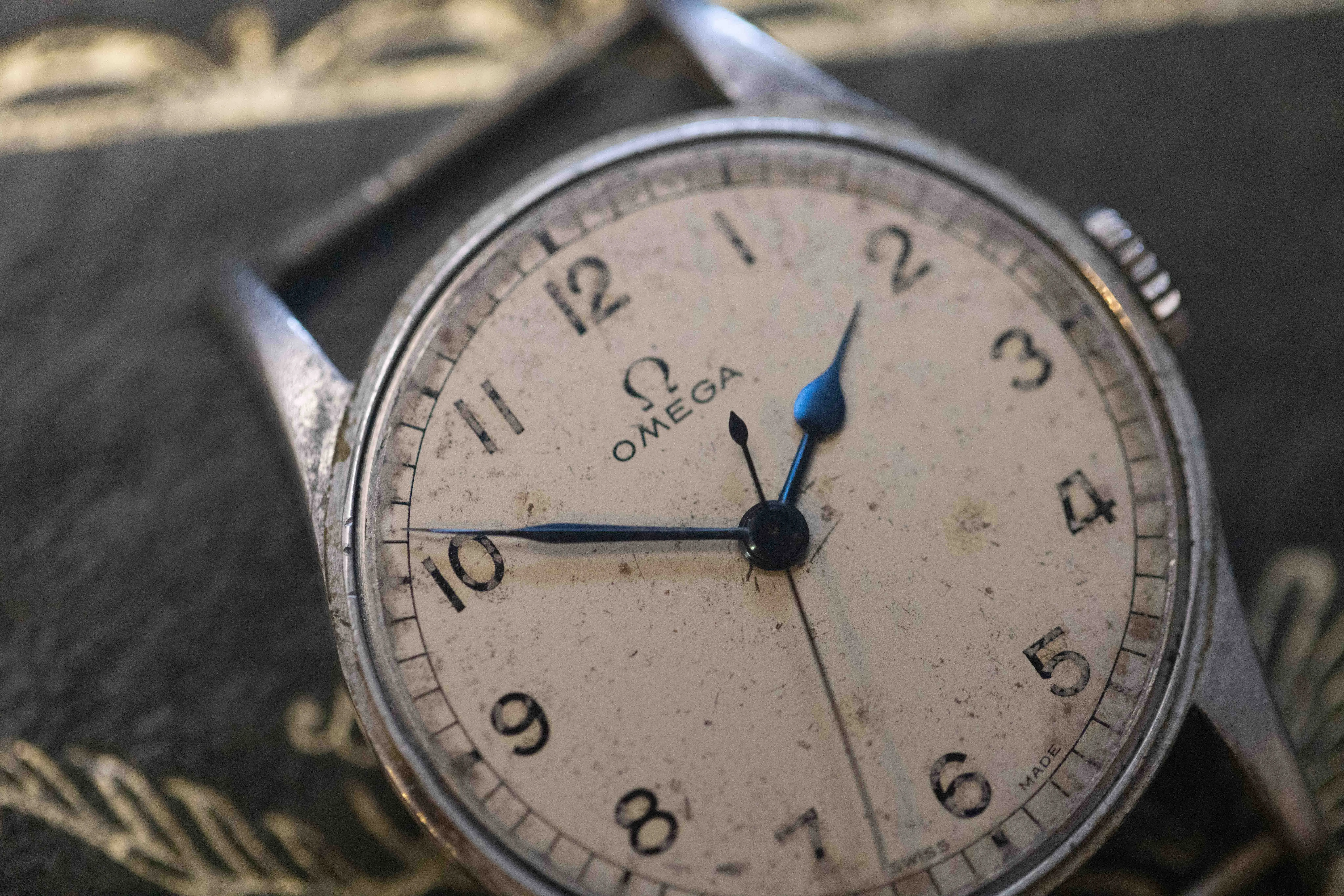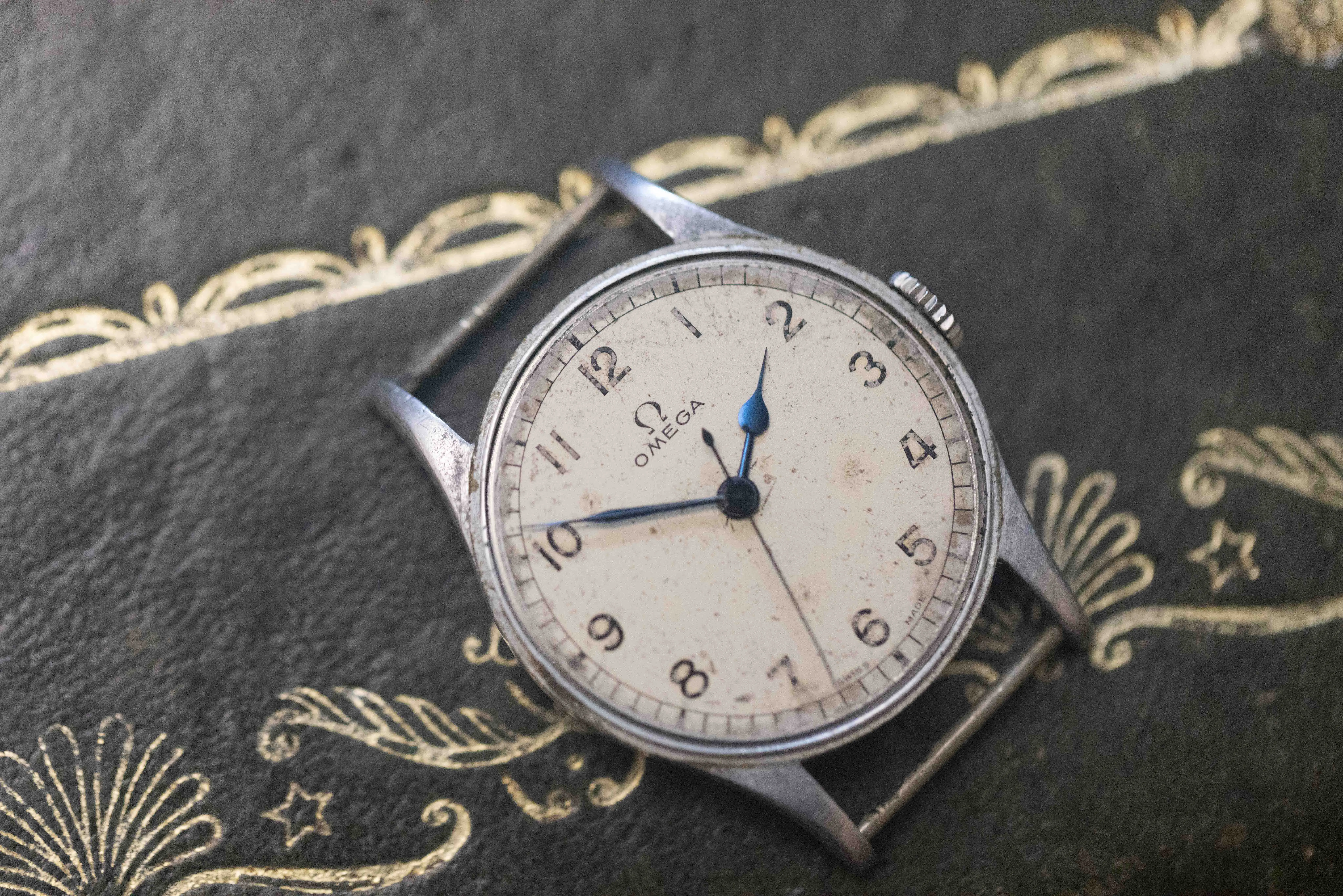 Dial: For an 84 year old watch the dial is in good condition, it is original first and foremost, and has not suffered significant damage over its life. There is clearly a patina of sorts that has developed, which I think adds to the rugged aesthetic quite appropriately for a military watch of this calibre. The very simple dial, is easy to read and remains untouched from restoration. The real eye catching part of this watch is of course the blued hands, with particular mention to the pear shaped hour hand, which beautifully captures the light and creates a display of inky iridescent blue tones.