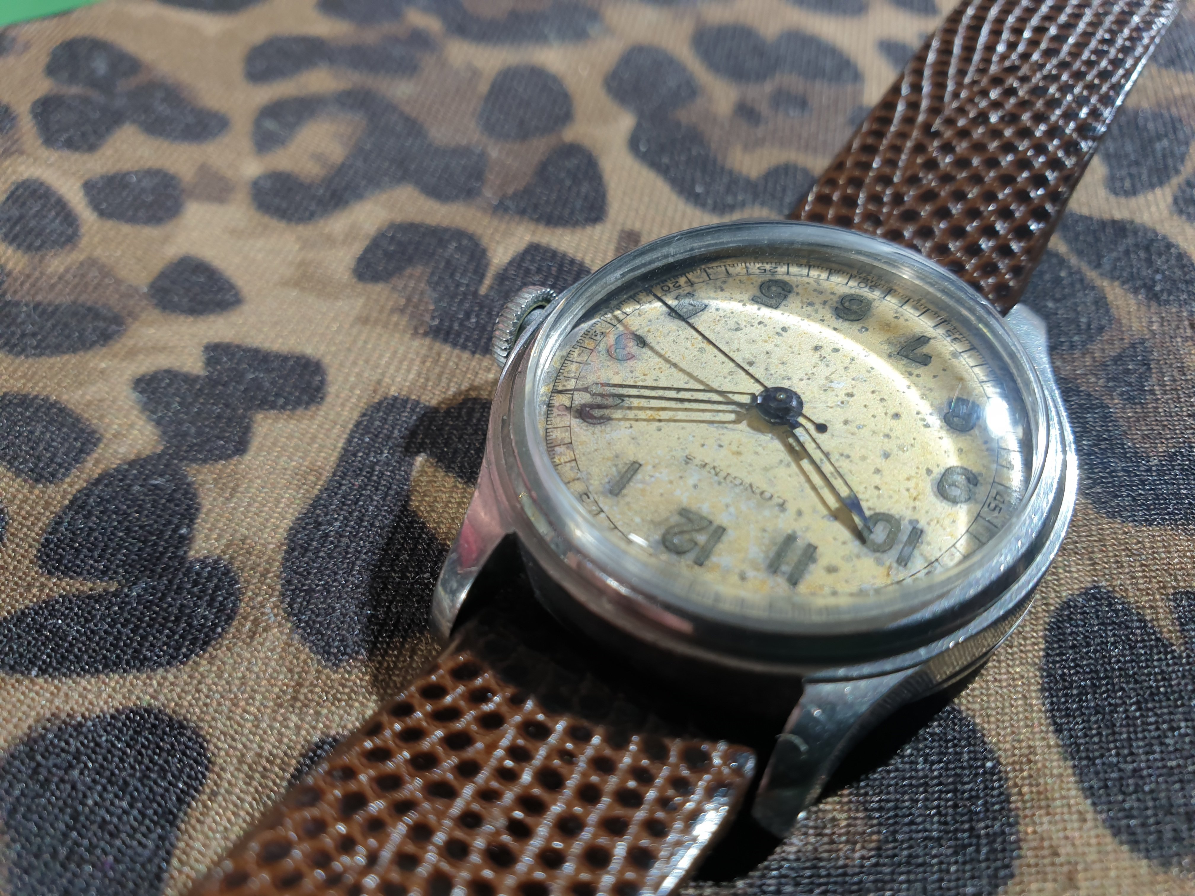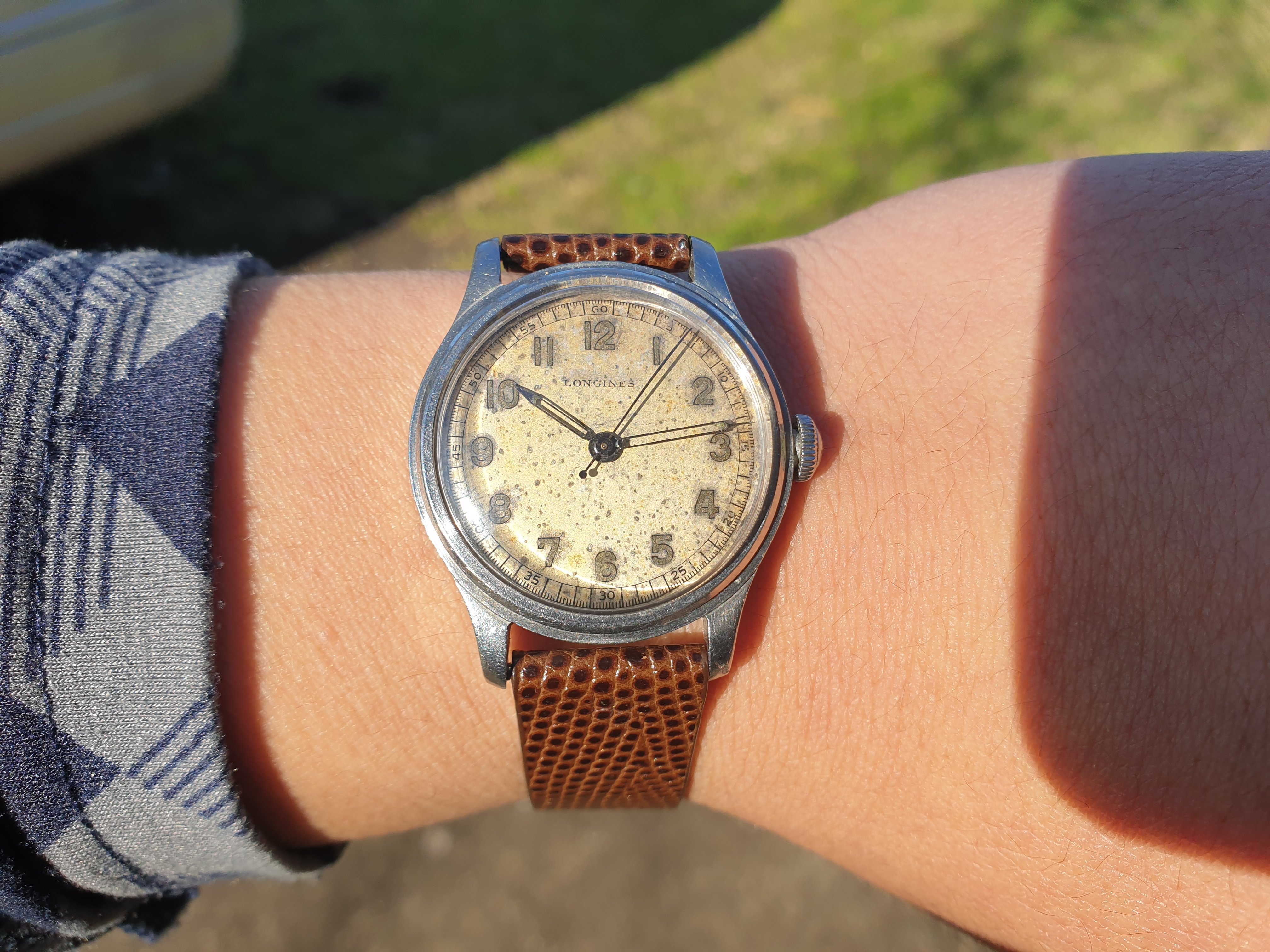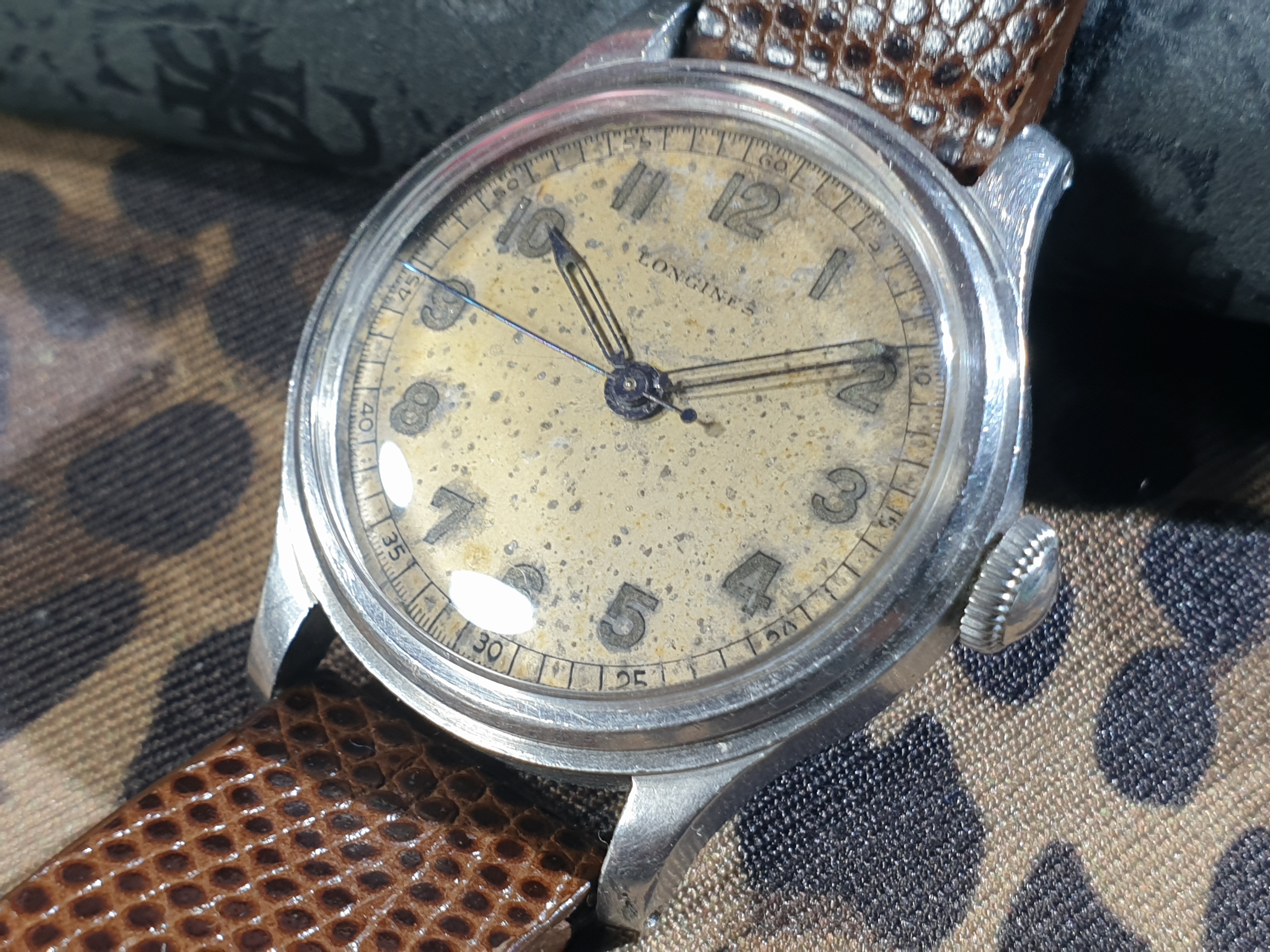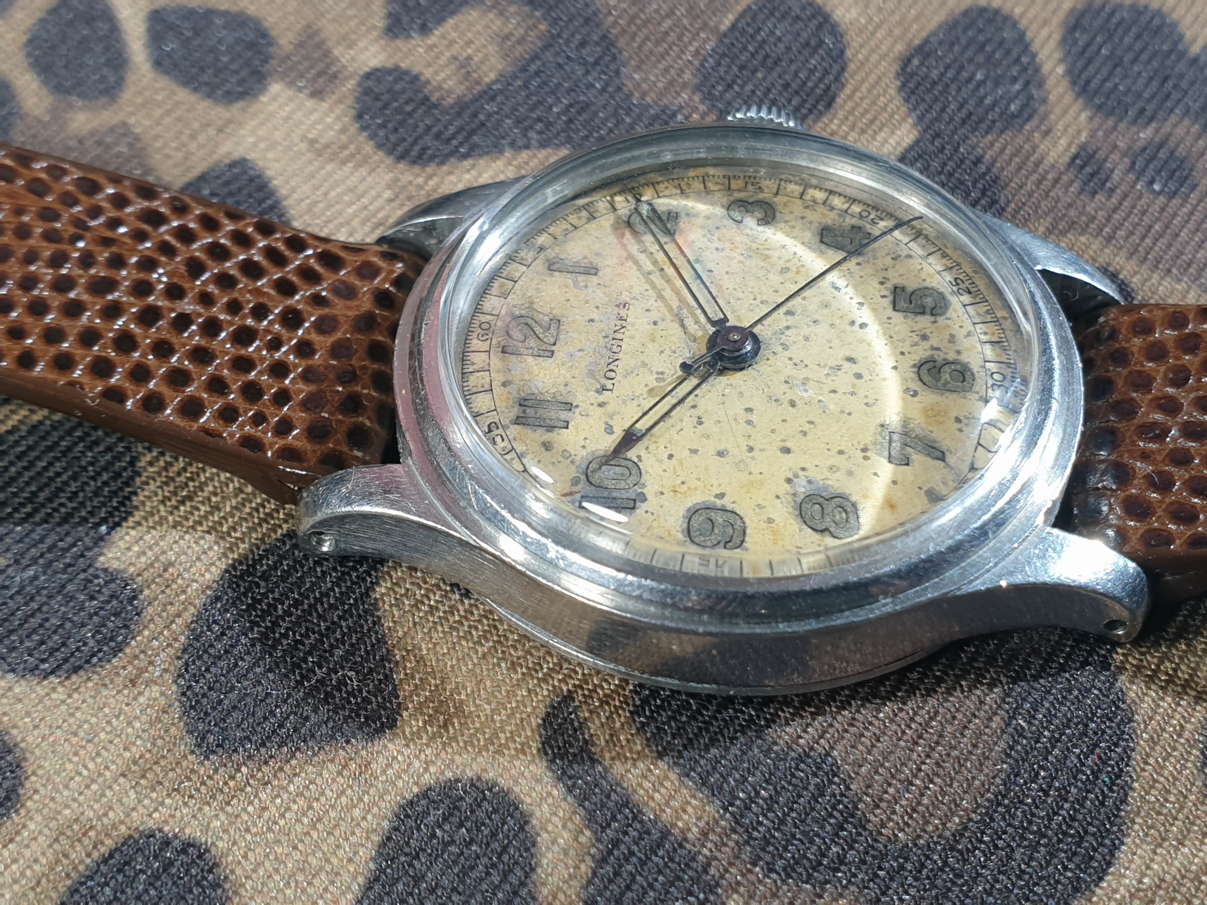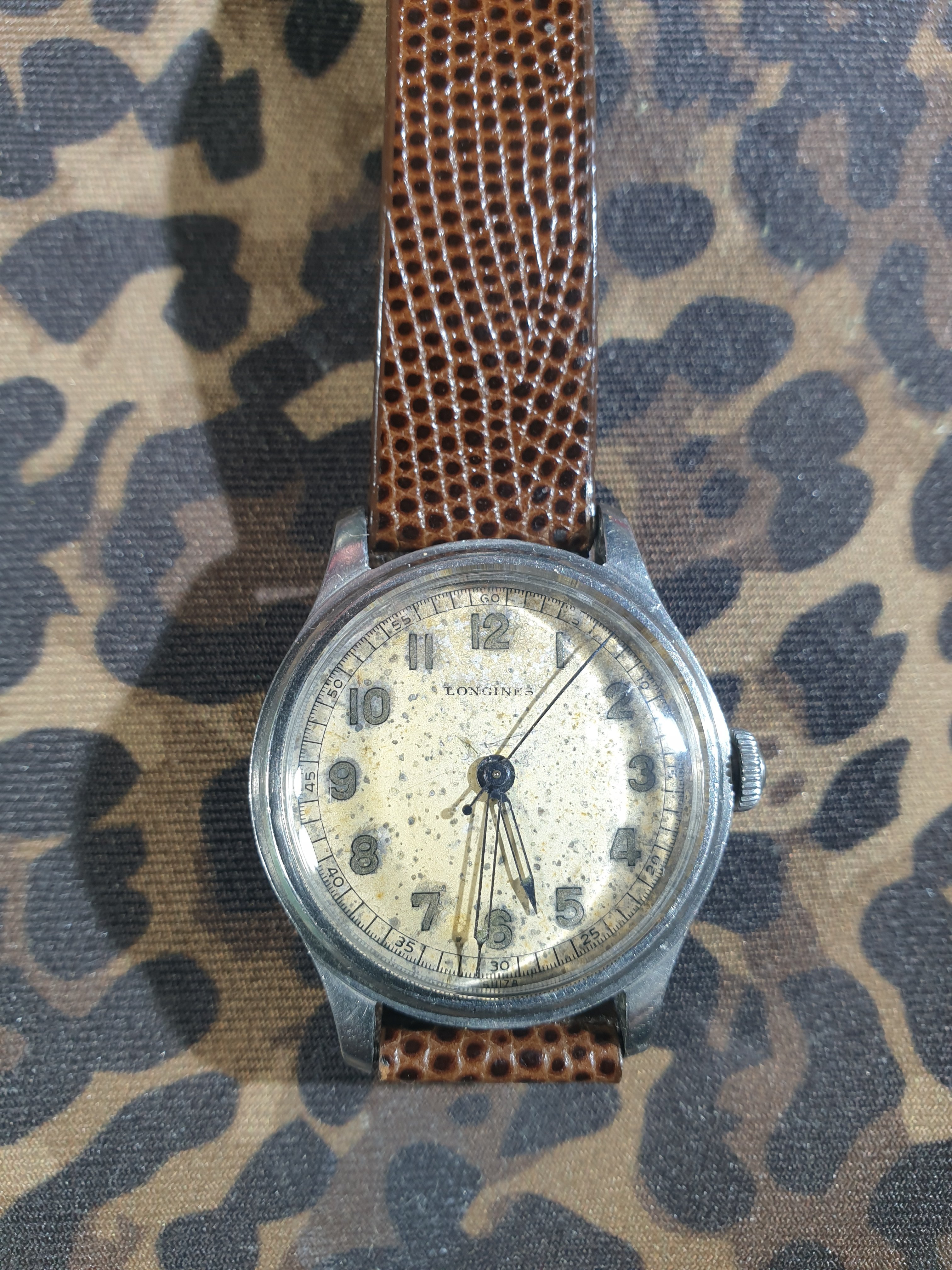 The crystal was replaced during service. During my use since then, it has picked up a small mark over where the numeral 4 is. It is discernible under very bright light. In darker areas, as well as in all other regards, the crystal is clear. The dial has taken on a speckled, crater-like patina. There appears to be a small mark near the top-centre-right of the dial. The dial print remains sharp, with slight fading on the Longines brand name and minute counter at the 1 o'clock hour marker. The Longines name is in a correct font for the time period, and the dial is marked 'Suiza' at the bottom, as it was intended for the Spanish-speaking market of Argentina. There is a small amount of lume on the ends of both the hour and minute hands, which match the colour of the lume on the numeral dials. All hands are presumably original to the watch.