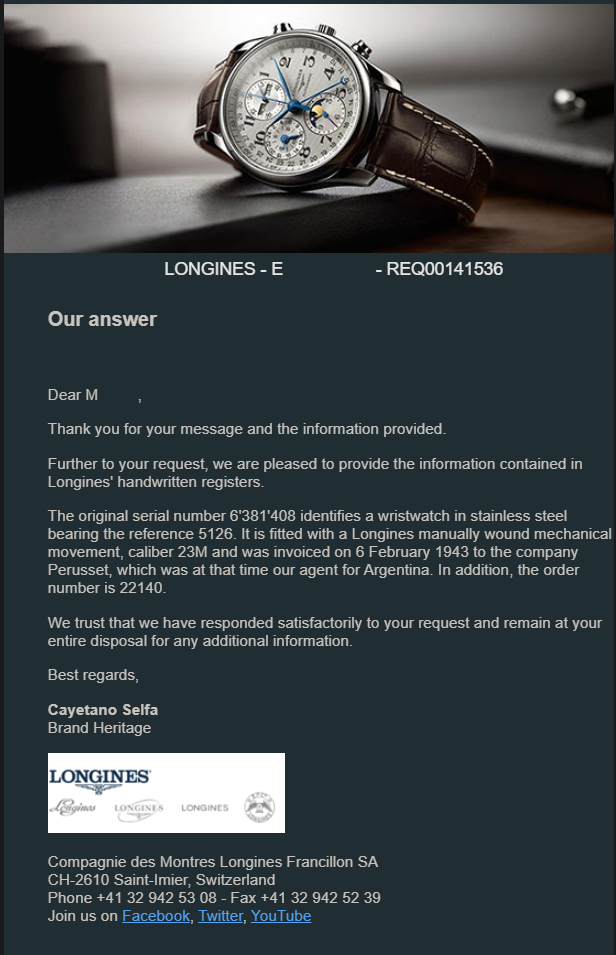 The online Longines Extract indicates that the watch was ordered on the 6th of February 1943 for the Argentinian company Perusset. This confirms the matching case and caseback serial numbers, order number, as well as the movement serial.