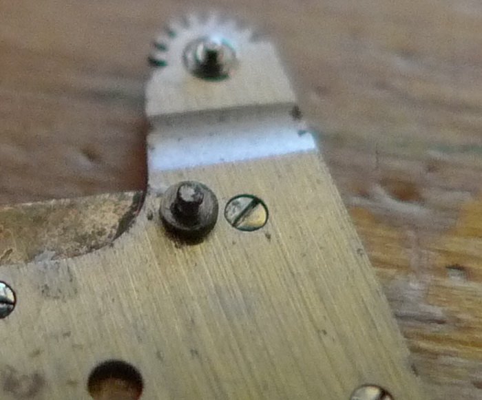 ·Yes the screws go in from the bottom (thru the bearing plate and thread into the weight). The one silver dot to the left of the word "Jewels" is the only screw left holding the weighted assembly together. The screw to the right of the word "Jewels" and the screw above the word "Seventeen" are both missing.