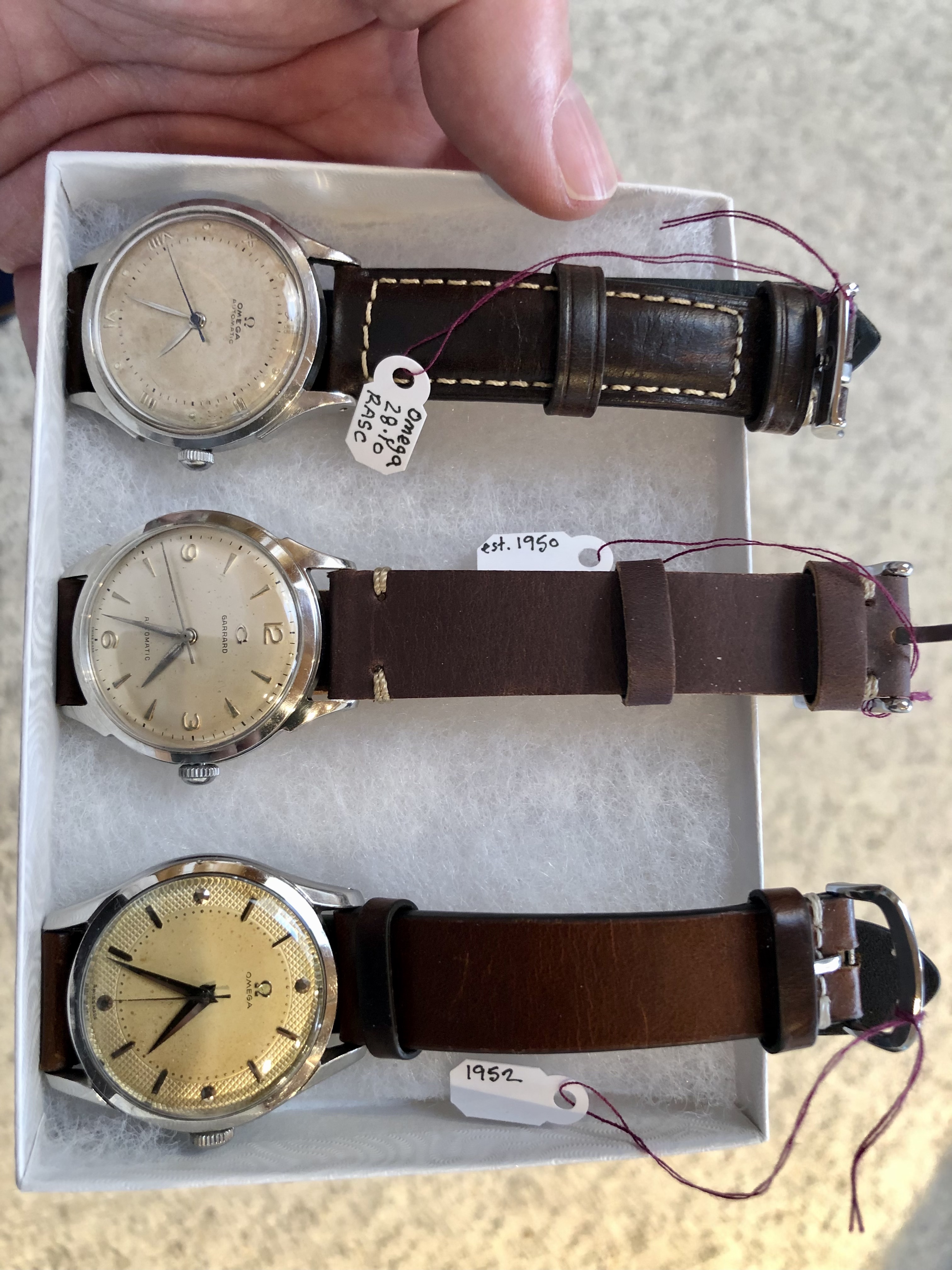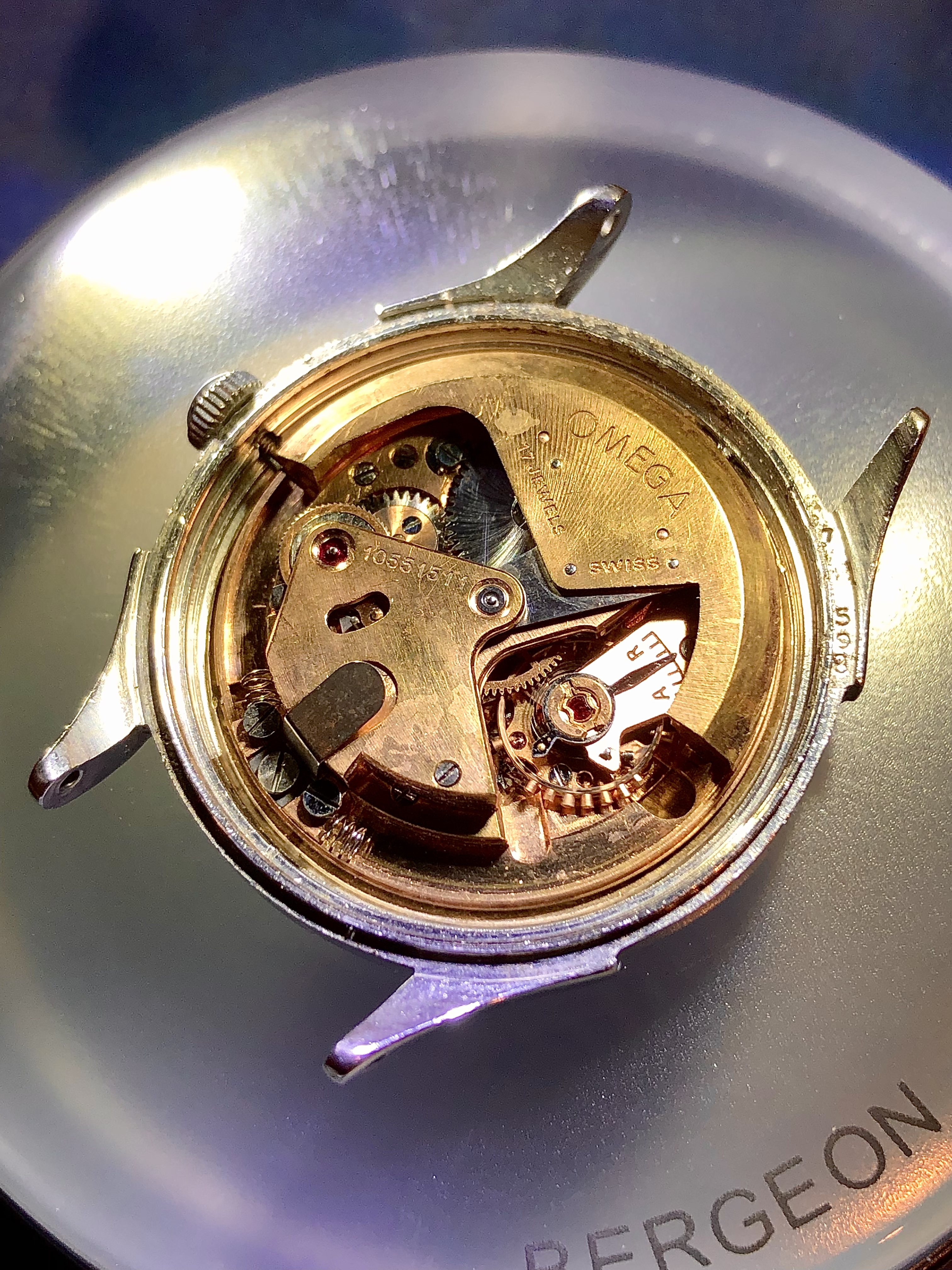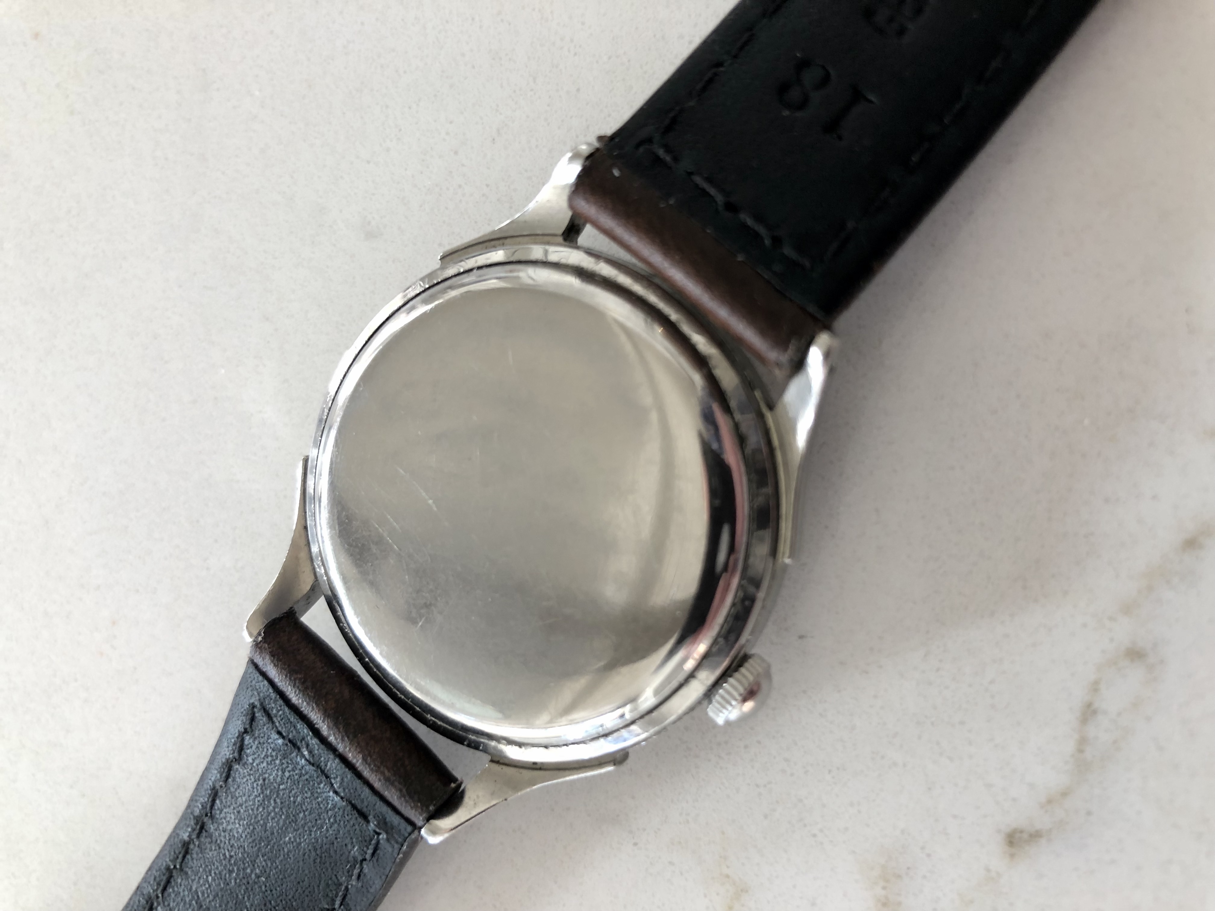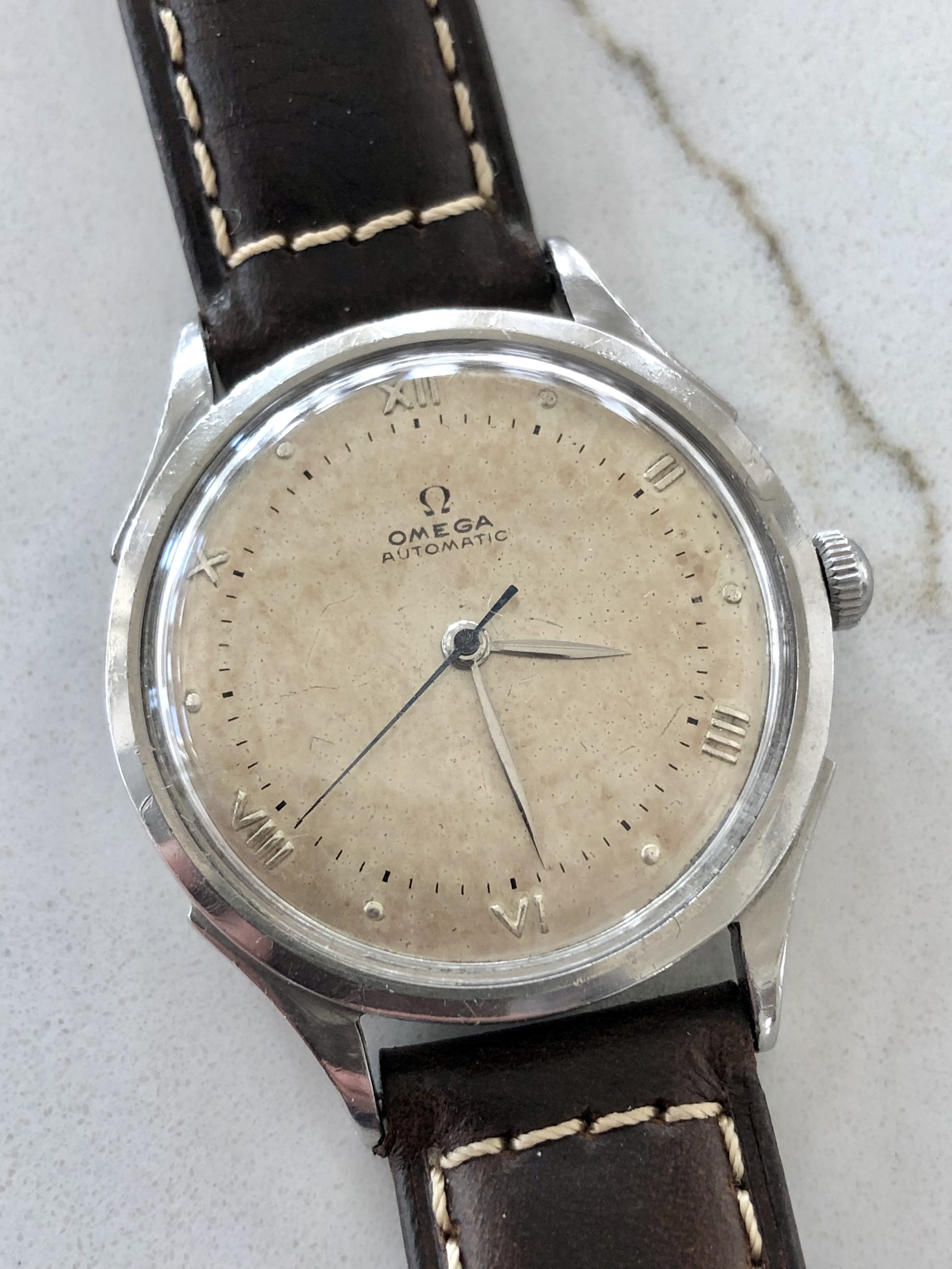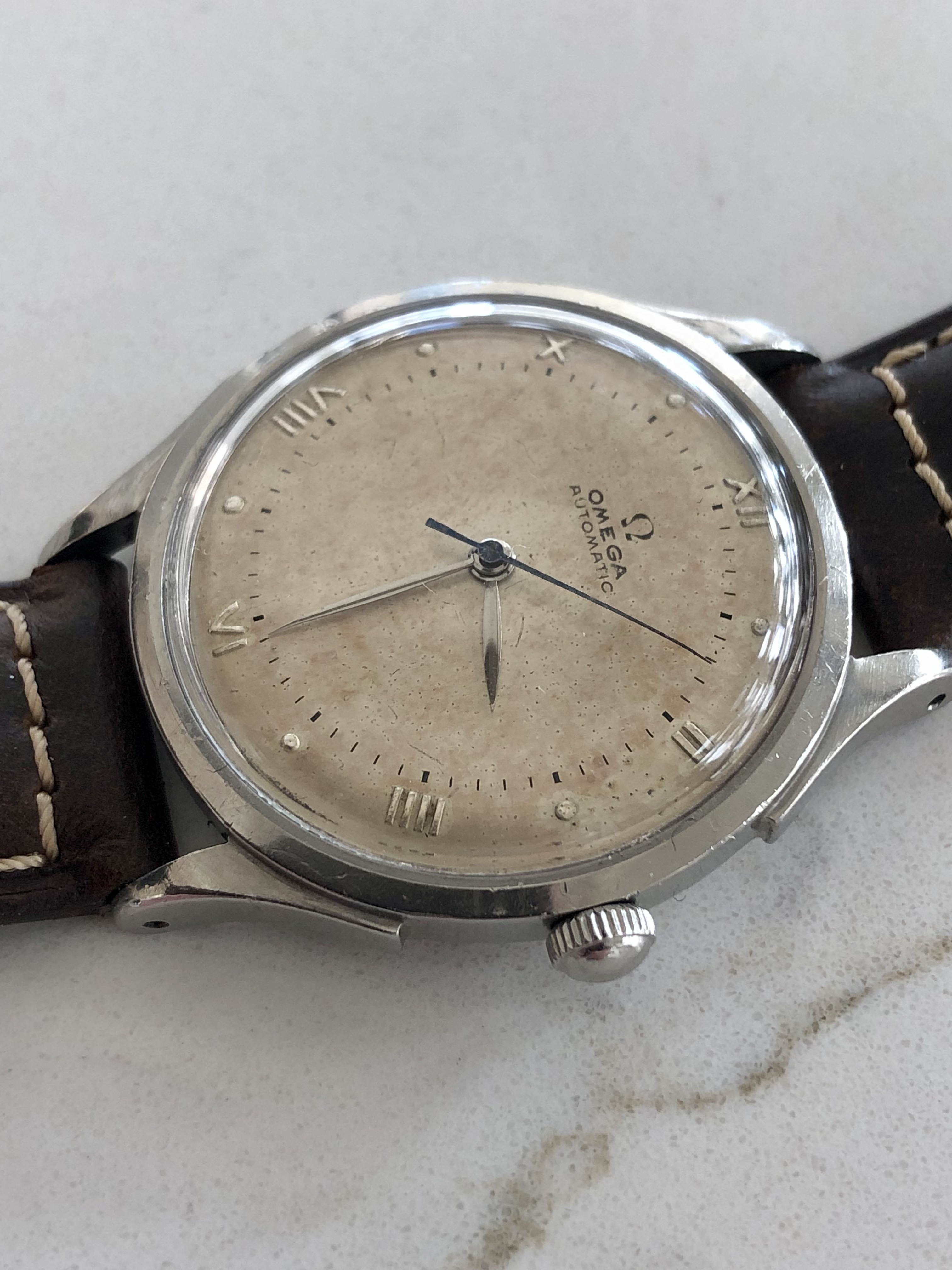 Adding to my collection recently is this 1944 Omega 28.10 RASC Bumper. I found the dial appealing but also noticed a few things I wanted to get checked out by members. Is it correct to expect no Omega symbols on crystal or crown for this period? While I find the blued sweep hand cool, is that a correct item, also hands ok? Interesting caseback ring to open the back, no markings noted on the exterior. No "swiss made". I was a little surprised to find the incabloc shock system on such an old movement although research tells me this is possible, thoughts? All other comments welcome.