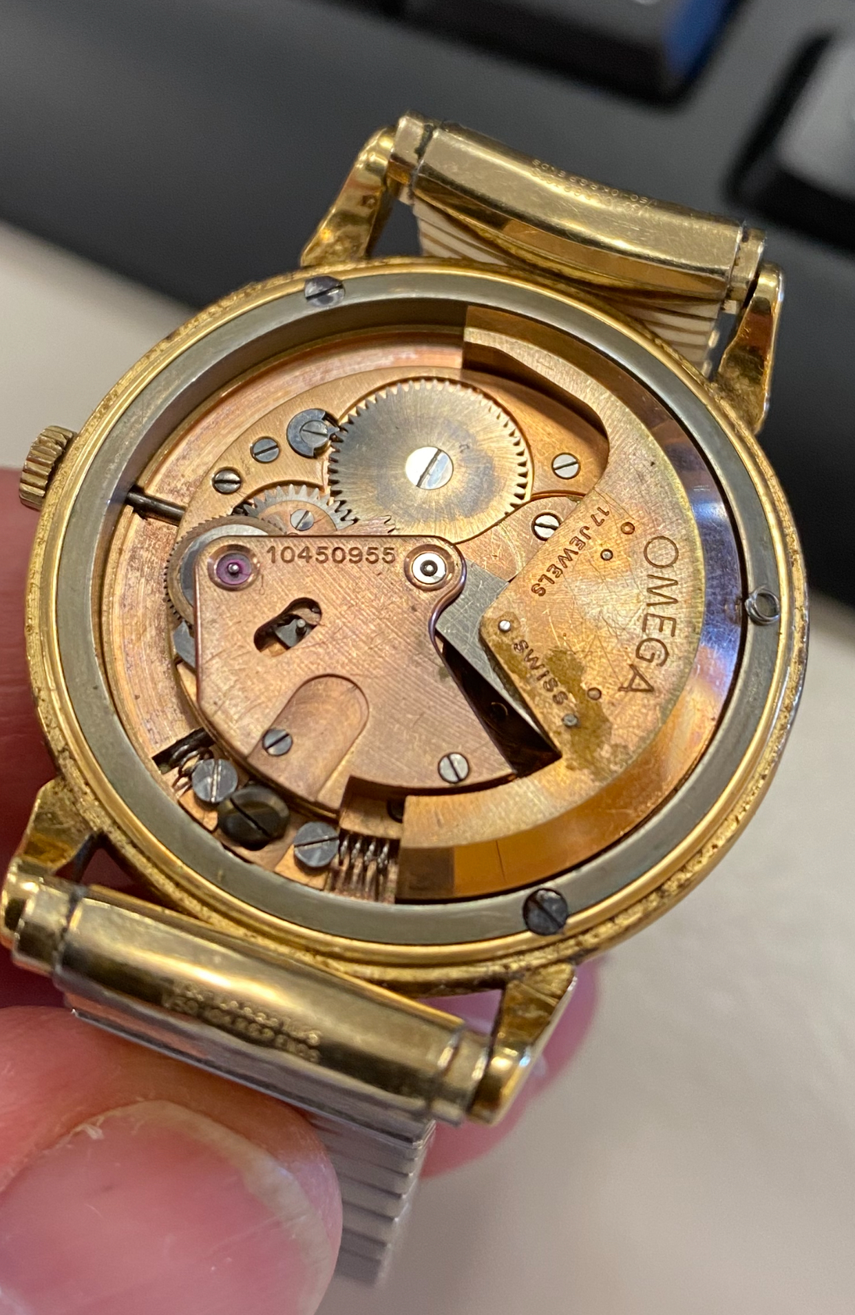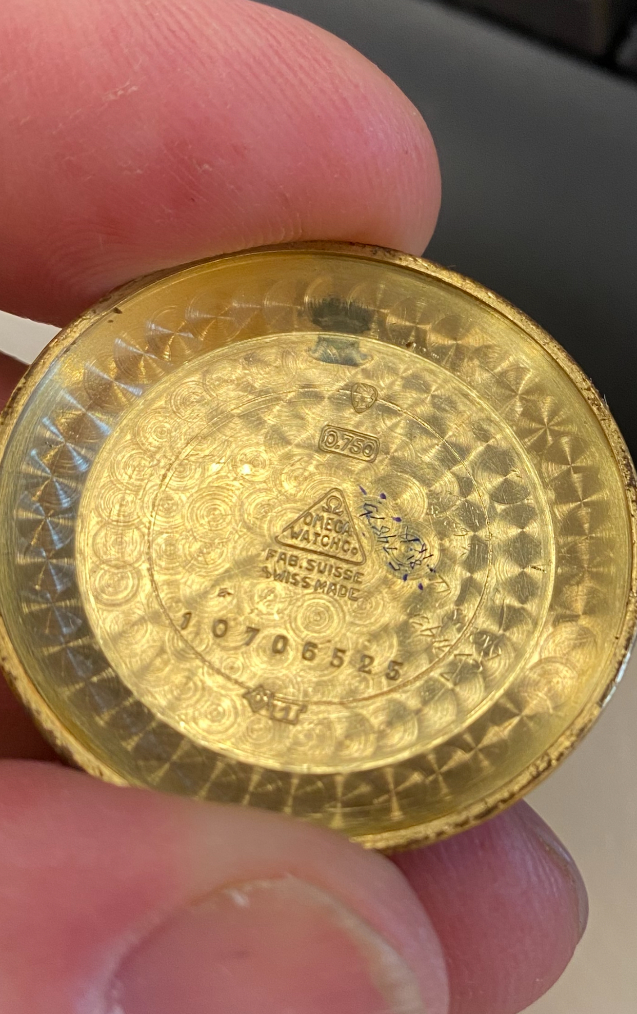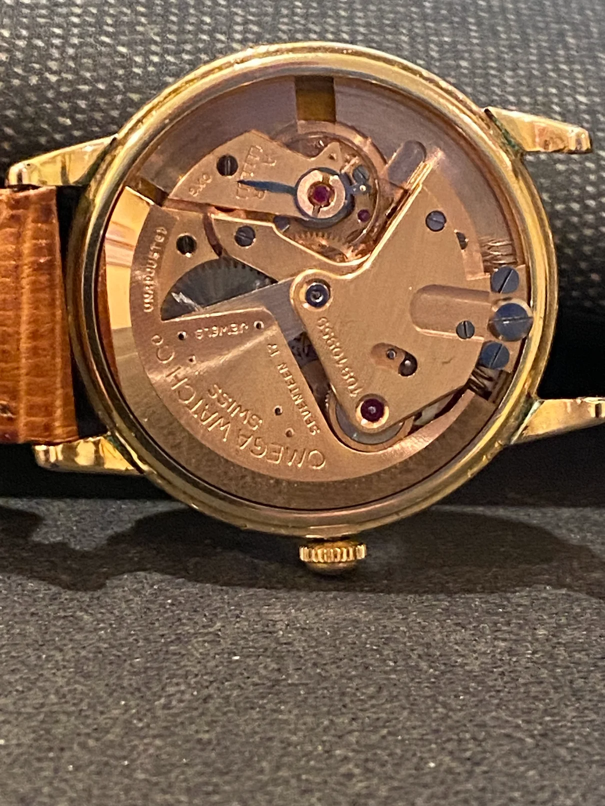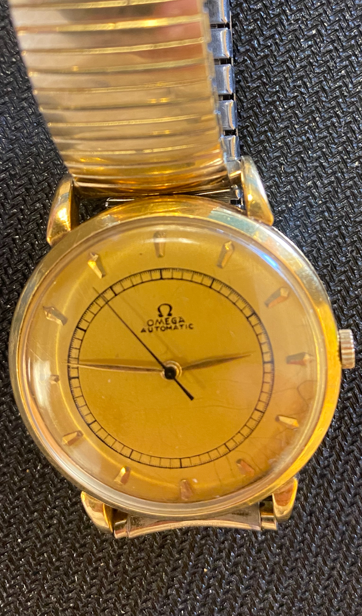 You do have an Omega bumper automatic from the mid 40's, probably a caliber 28.10 as the springs are not covered as they are in later bumper models. The good news is that it is a family heirloom and 18k gold. The bad news is that the dial was poorly painted and the movement is in pretty rough shape with some debris floating around like the screw/head at the bottom. Let us know where you're located and you'll get suggestions for a watchmaker. I attach scans of my 28.10 with an original, albeit scratched, dial.