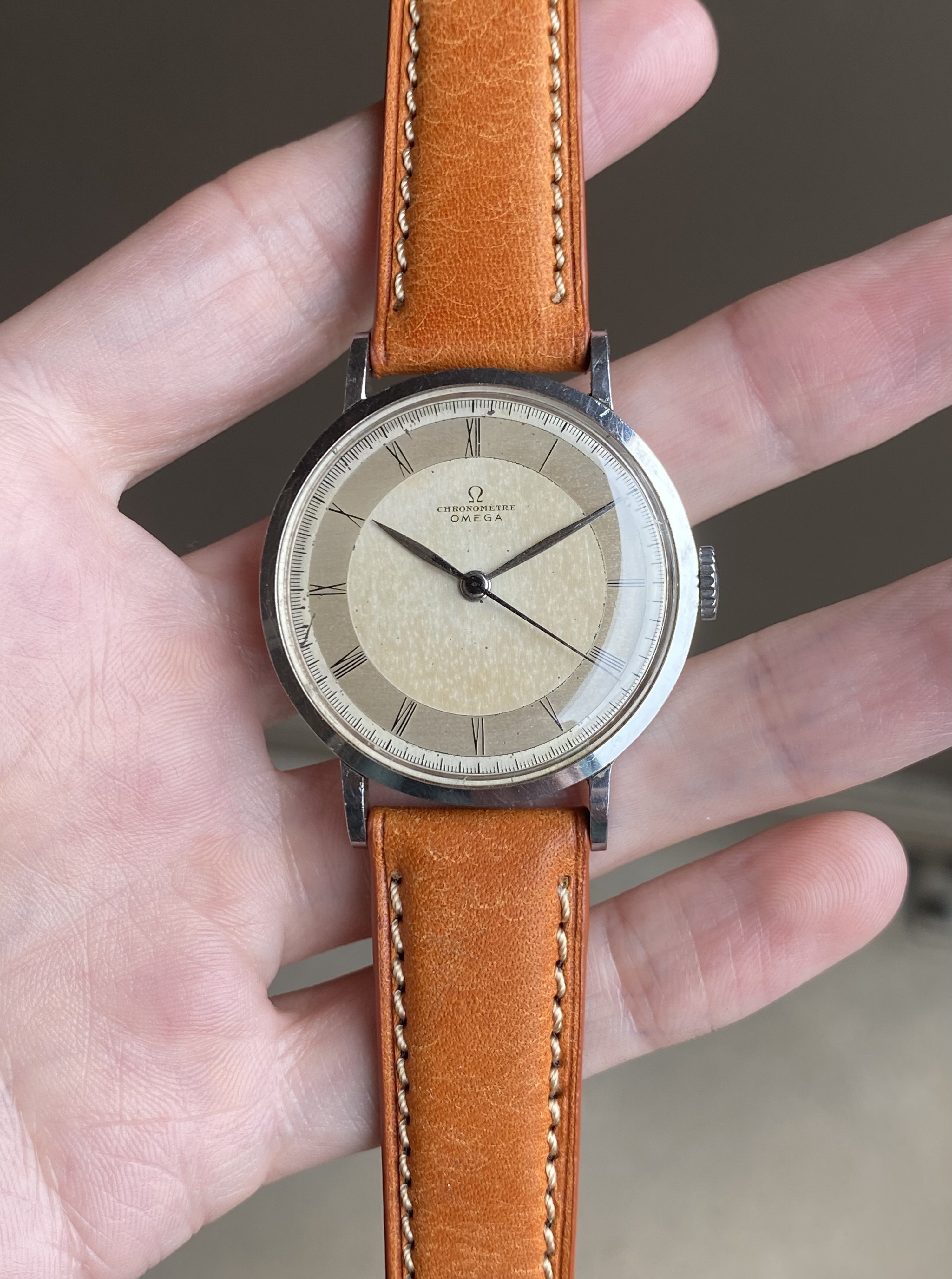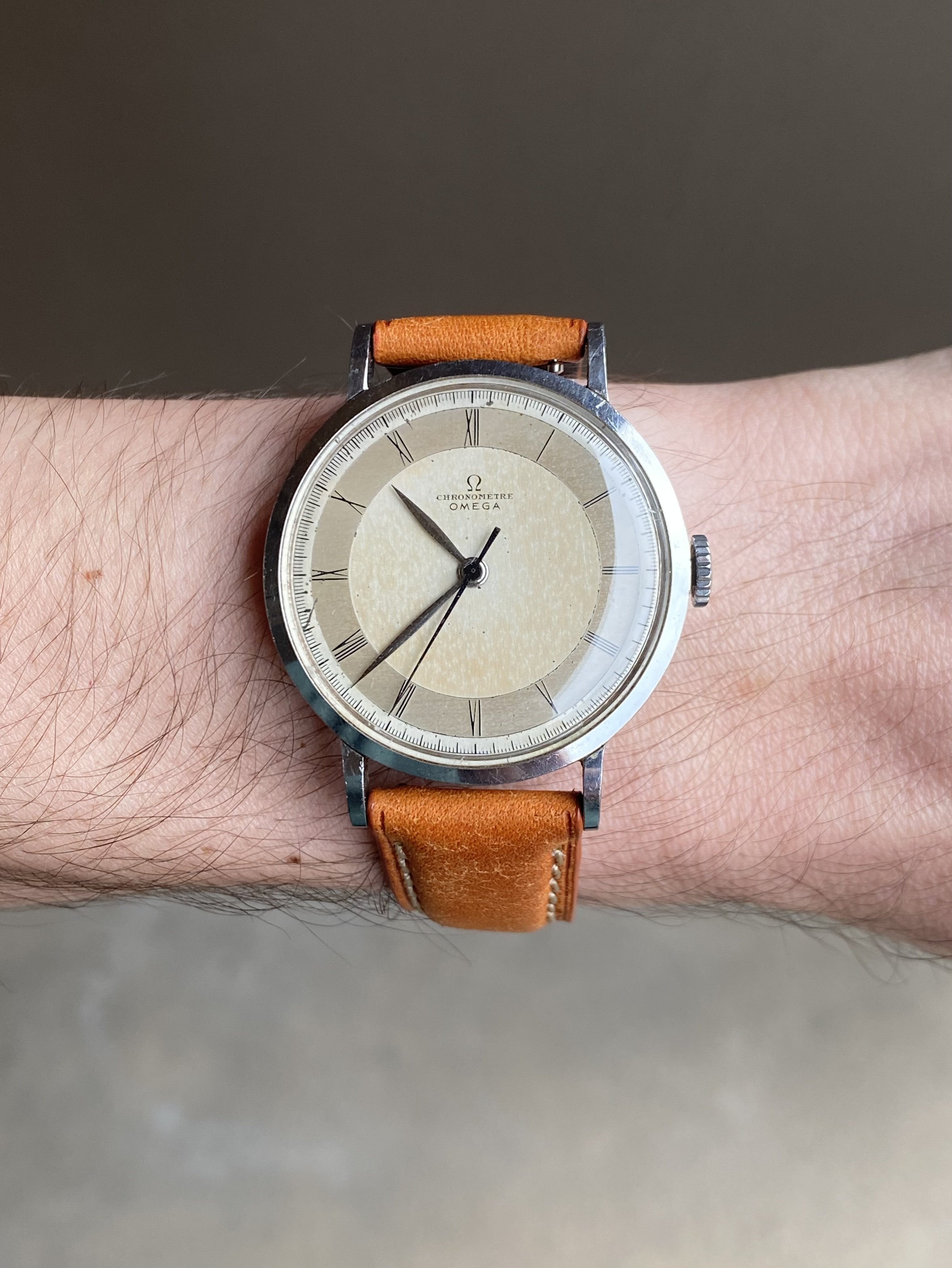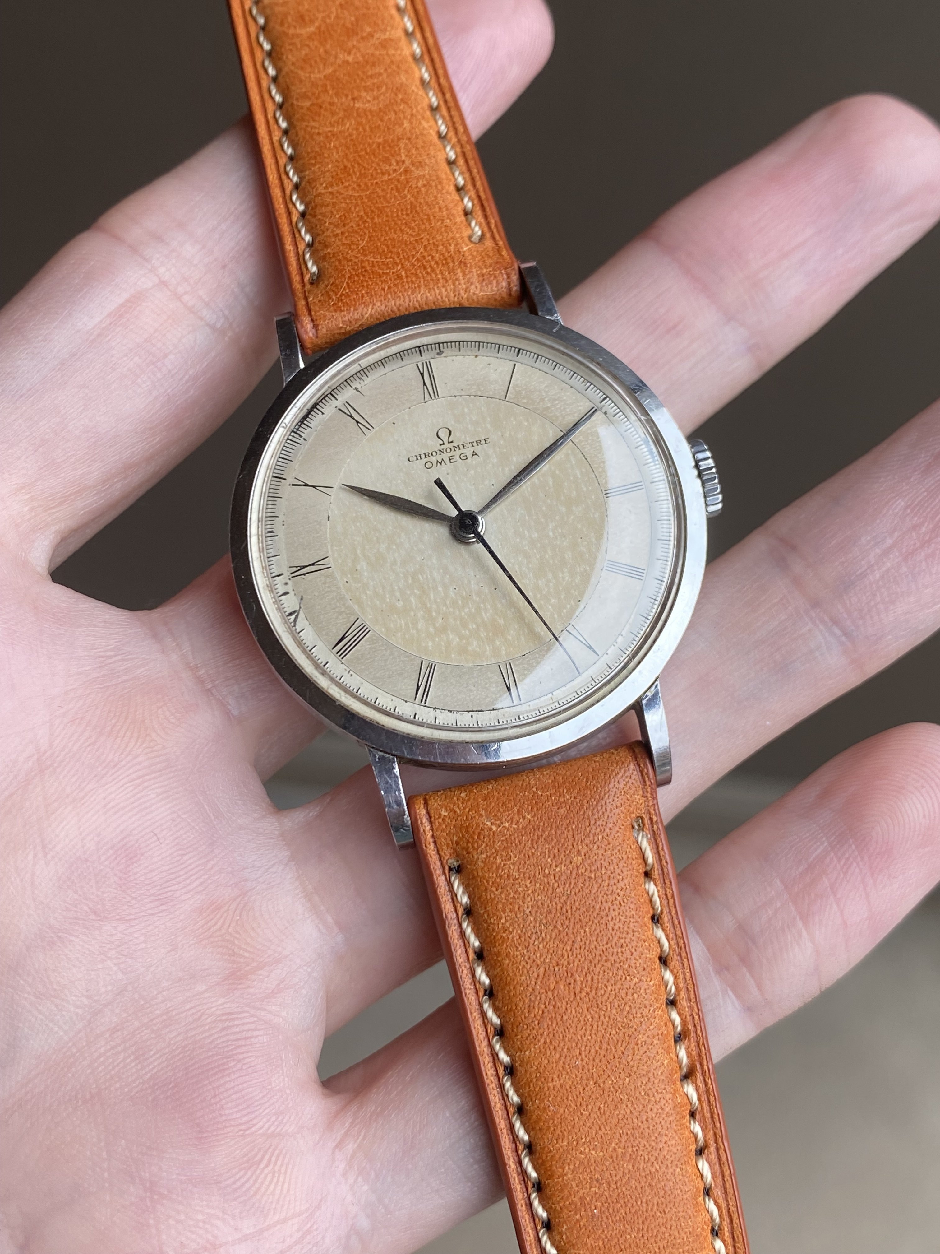 ·Up for sale is a very nice Omega Chronometre powered by the legendary 30T2SCrg movement. The stainless steel case is the larger 35.5mm variant (2367 ref) and is unpolished. The dial is fully original and remains in attractive condition.