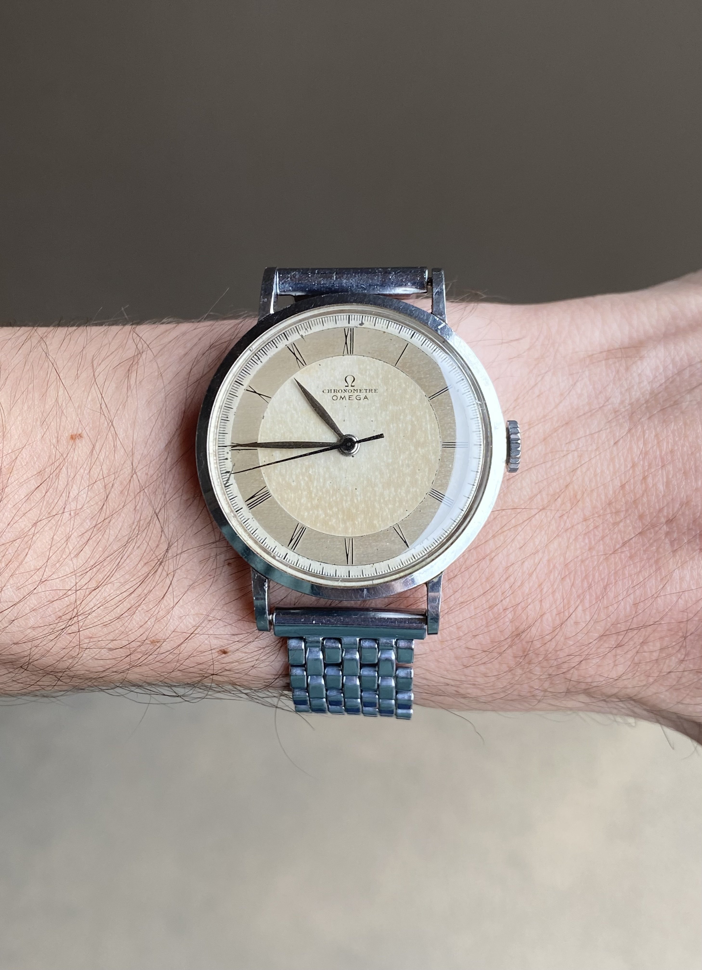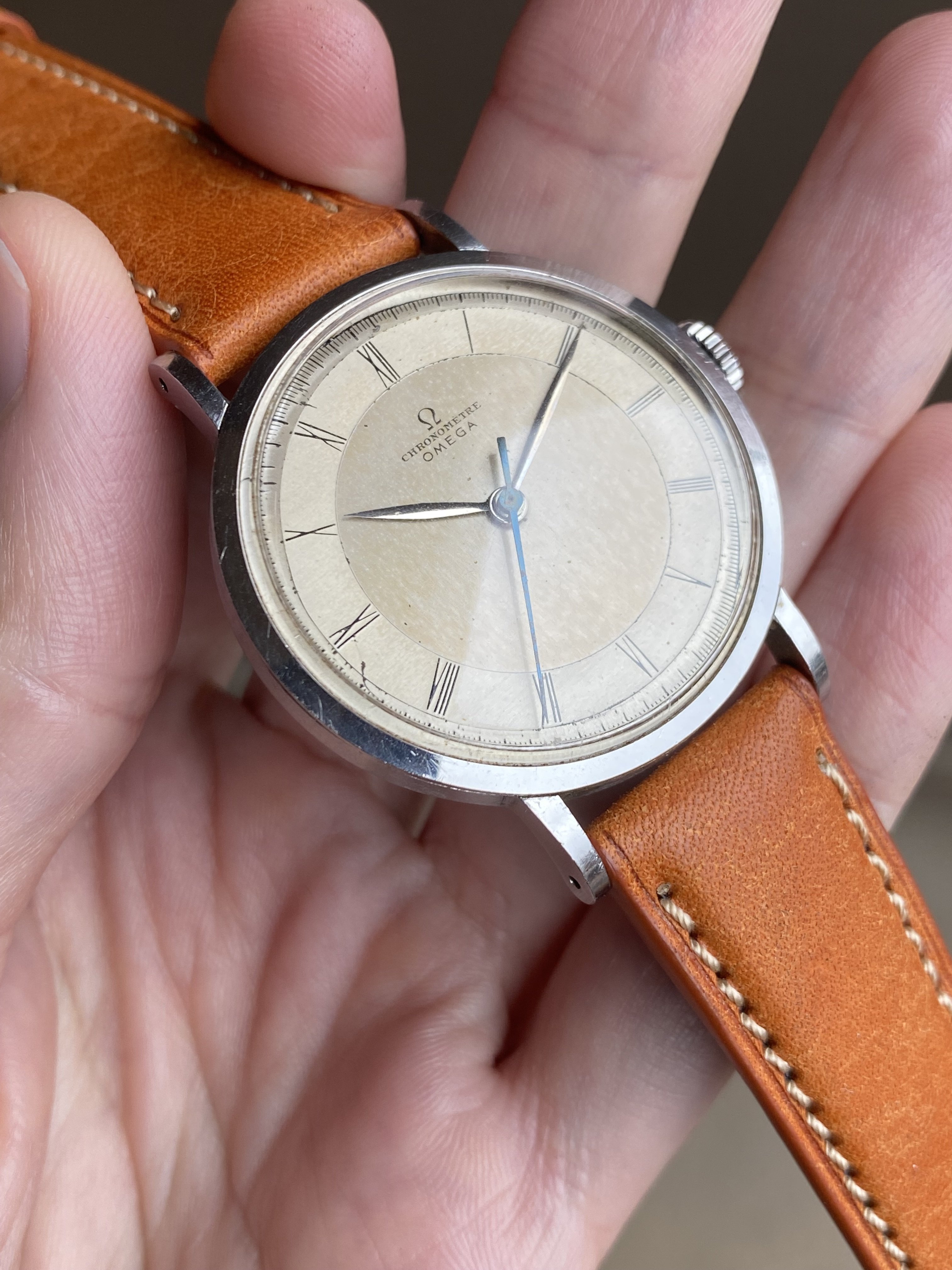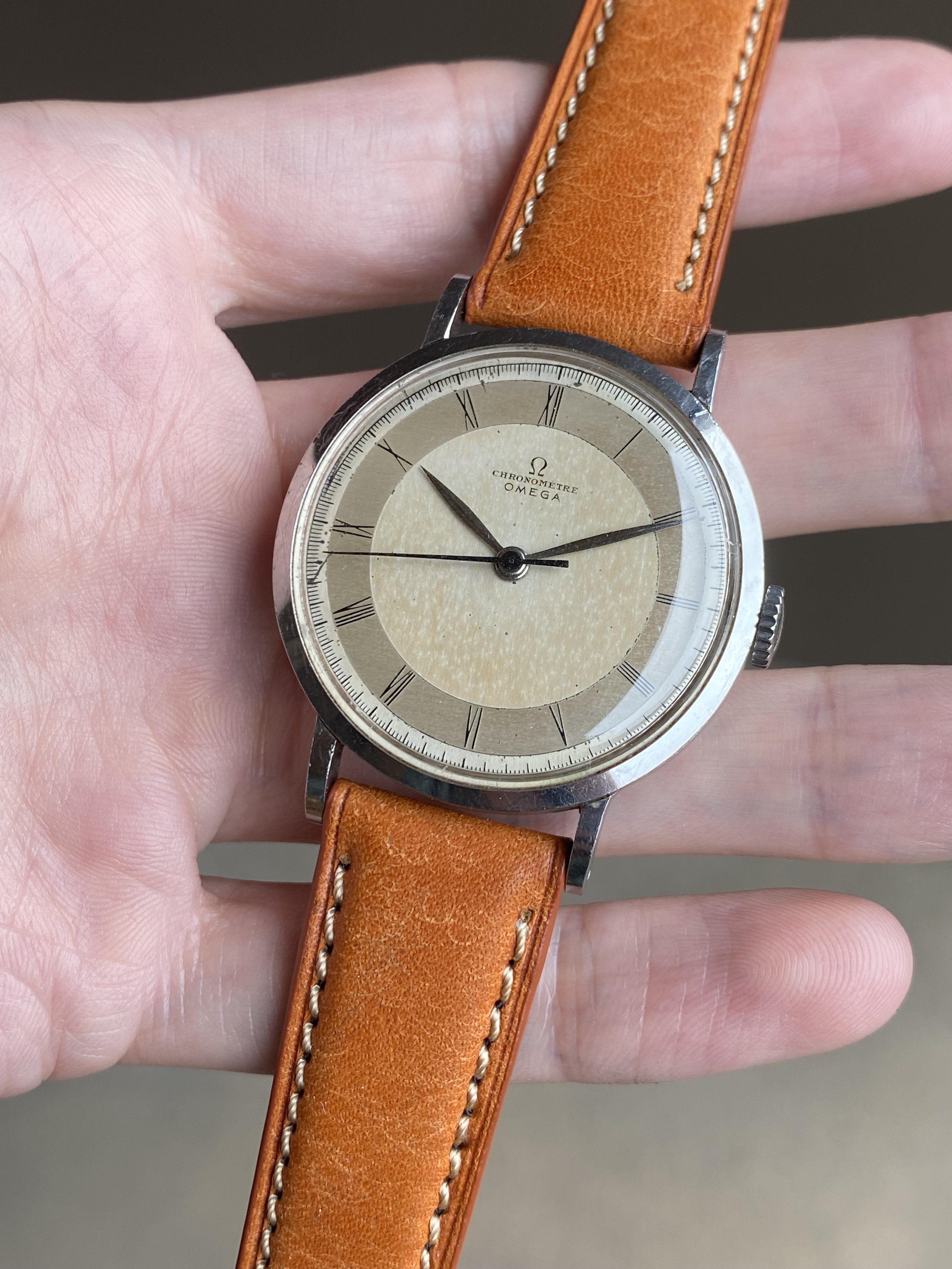 ·Up for sale is a very nice Omega Chronometre powered by the legendary 30T2SCrg movement. The stainless steel case is the larger 35.5mm variant (2367 ref) and is unpolished. The dial is fully original and remains in attractive condition.