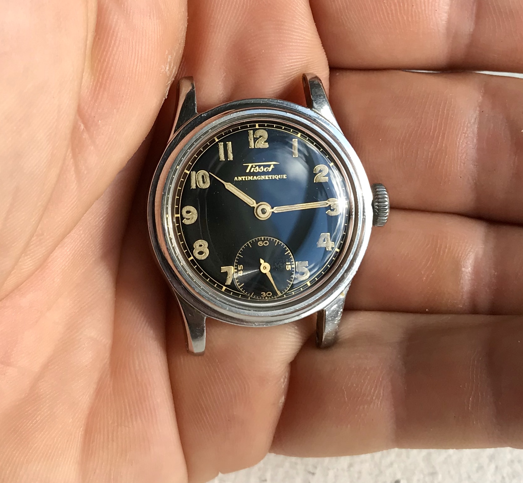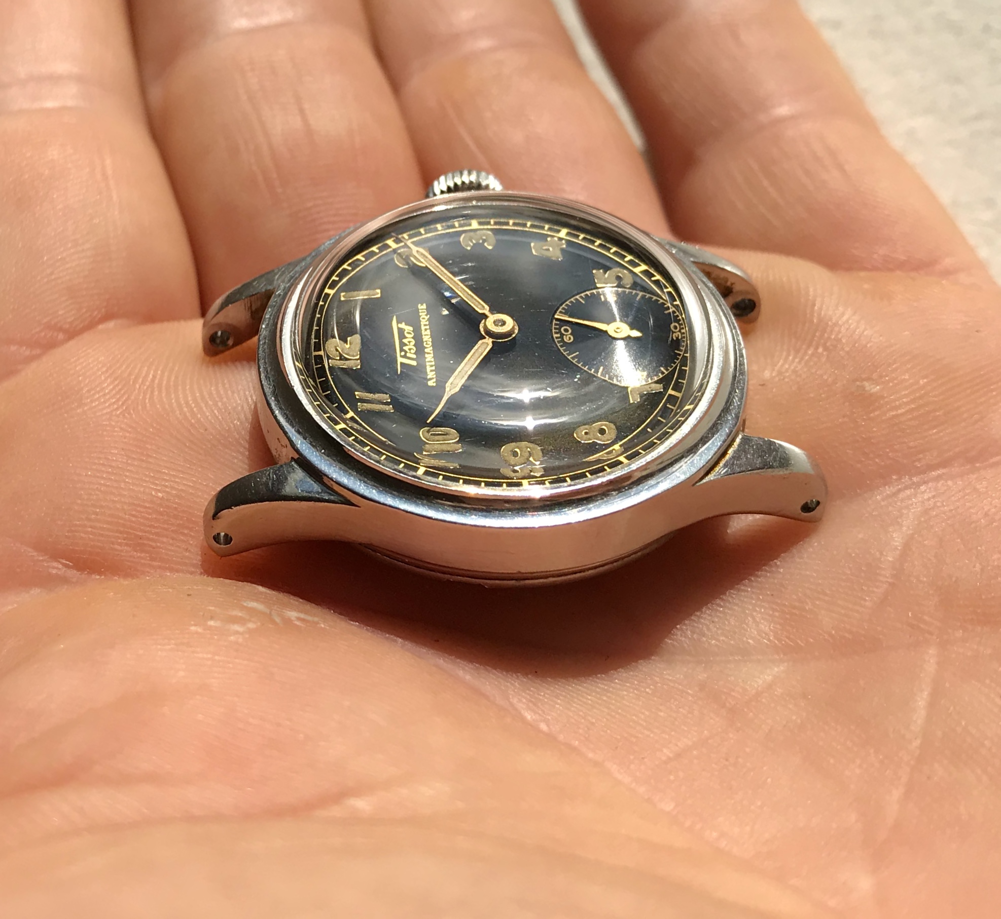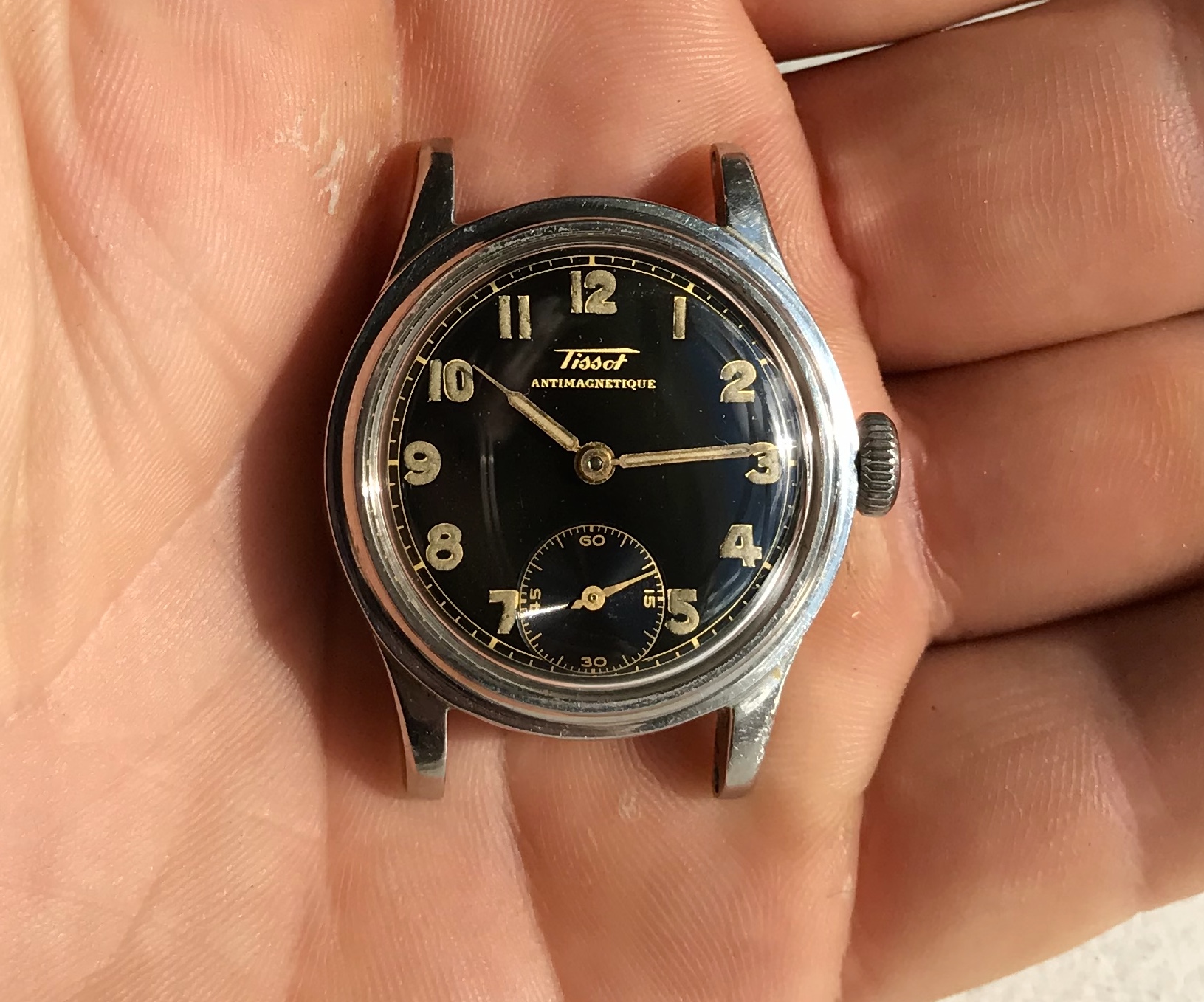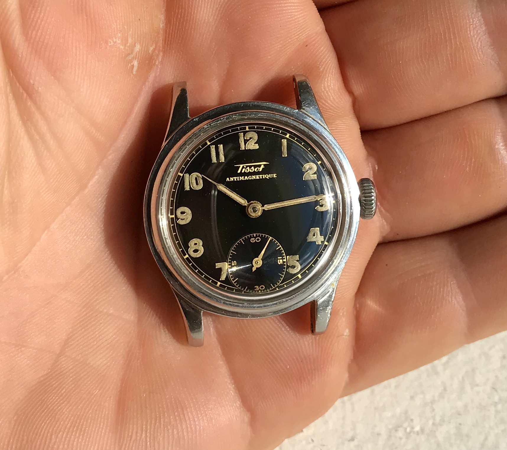 A steel Tissot antimagnetique ref 6072 produced in 1945 according to the serial number 1'634..with one of the best glossy black gilt dials I have ever seen on these.