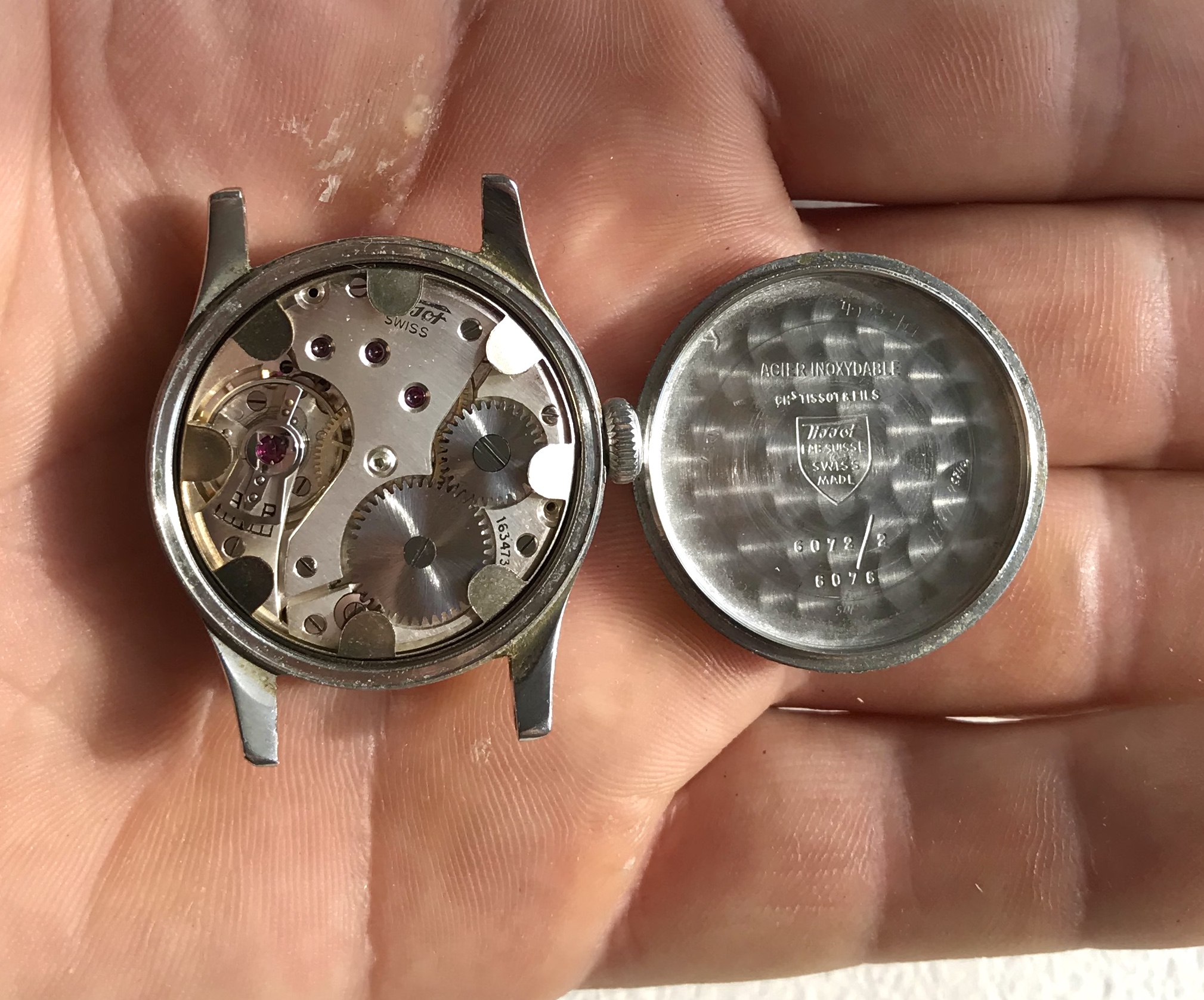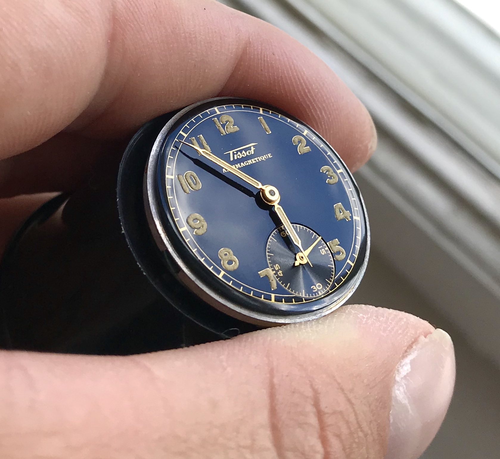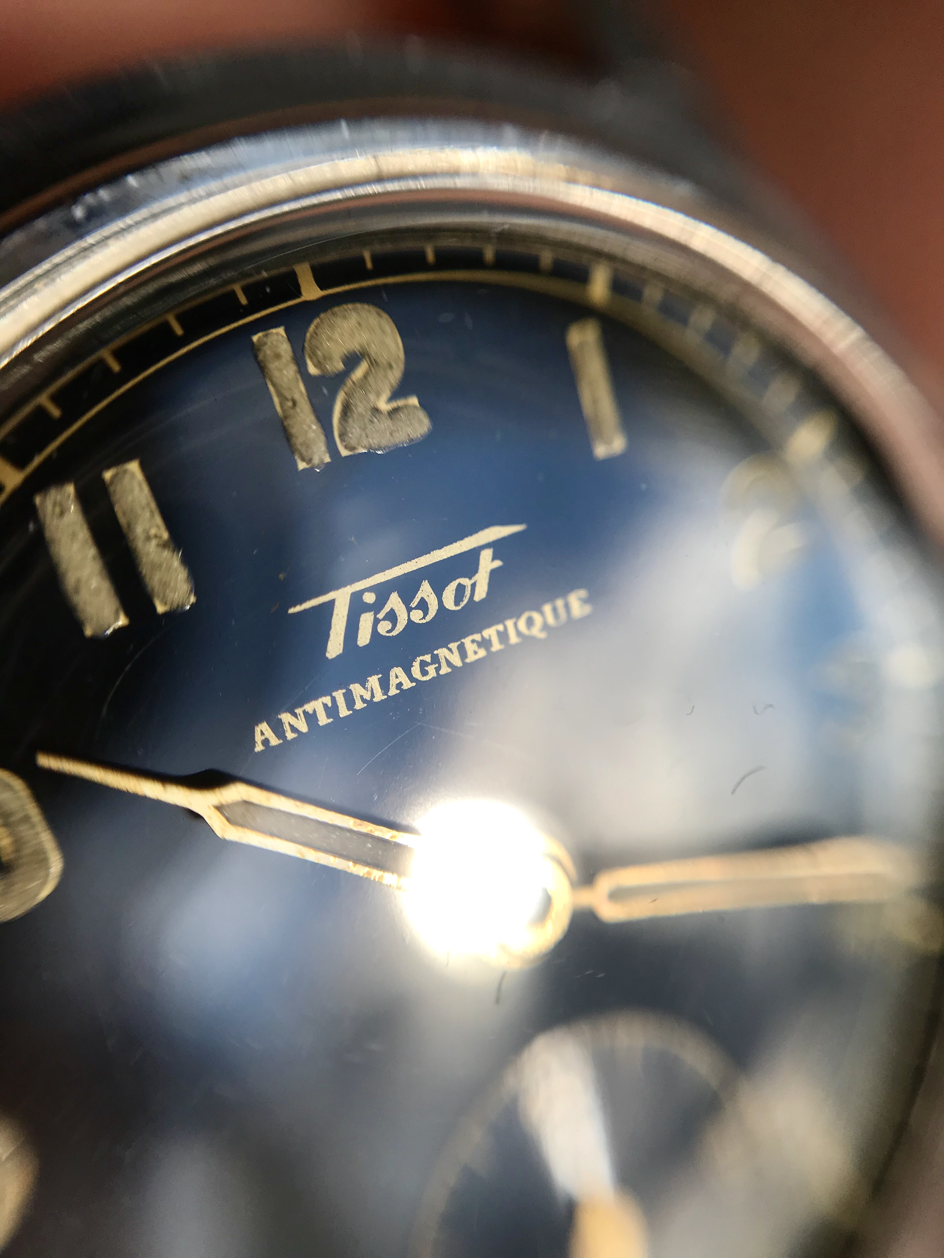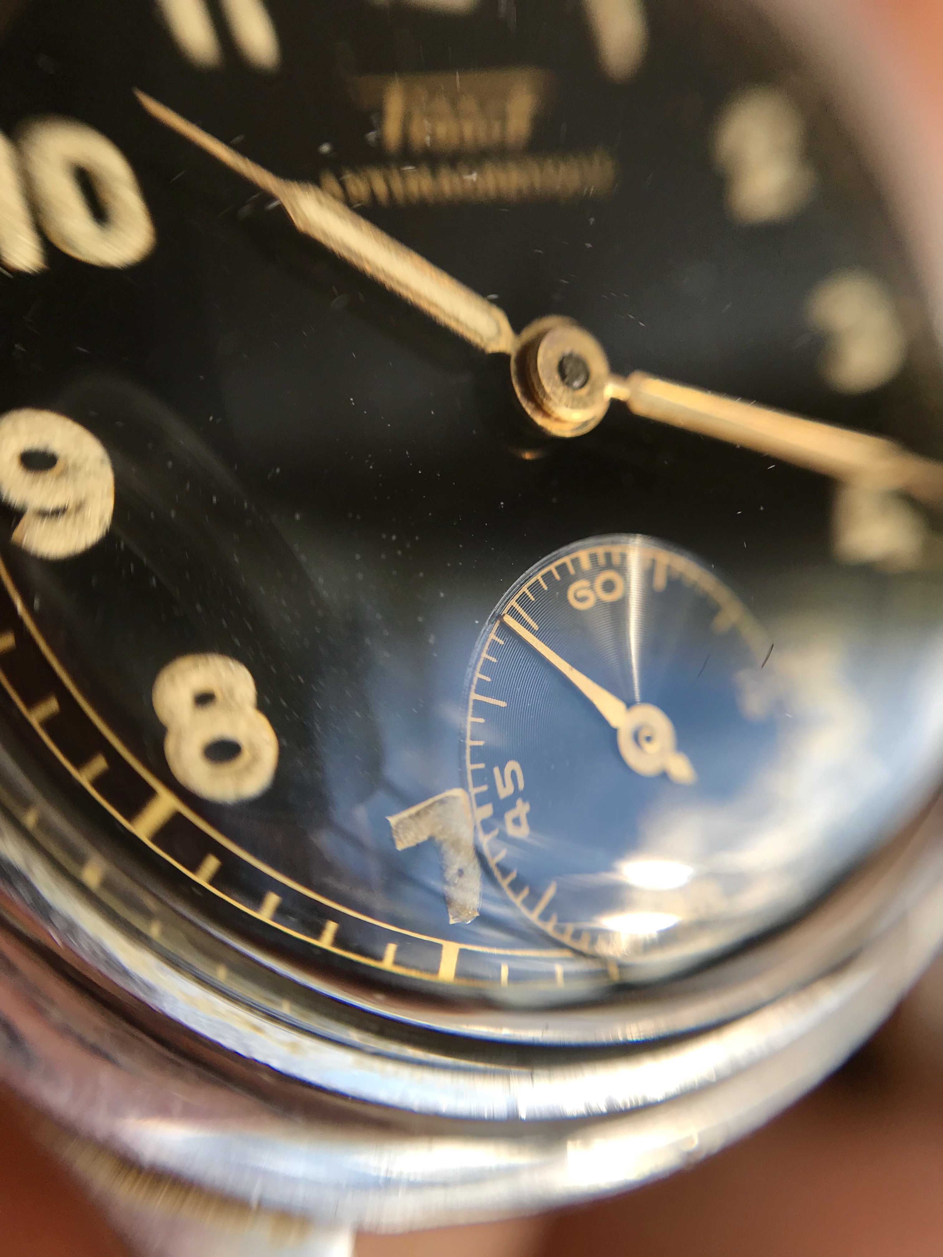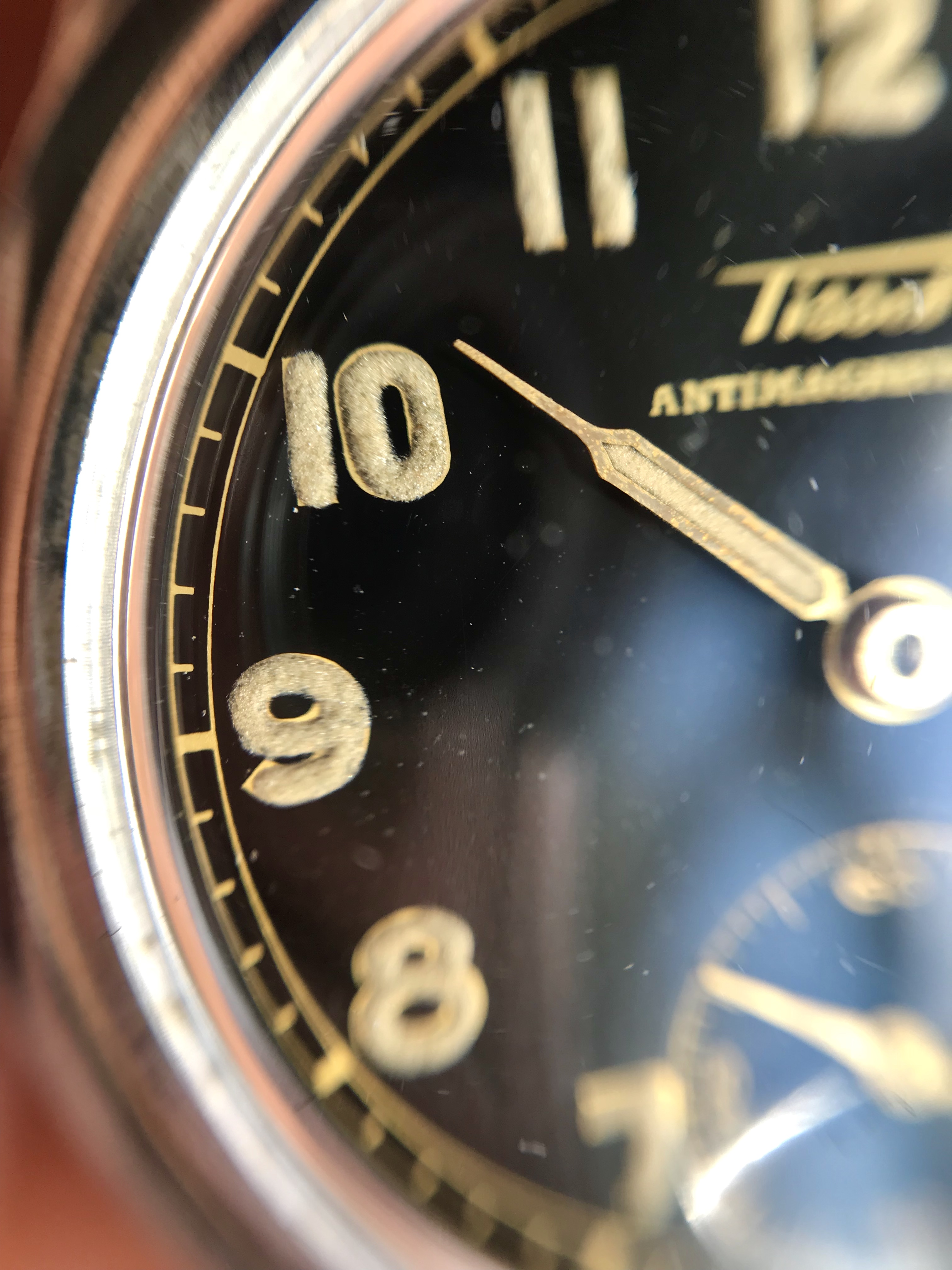 A steel Tissot antimagnetique ref 6072 produced in 1945 according to the serial number 1'634..with one of the best glossy black gilt dials I have ever seen on these.